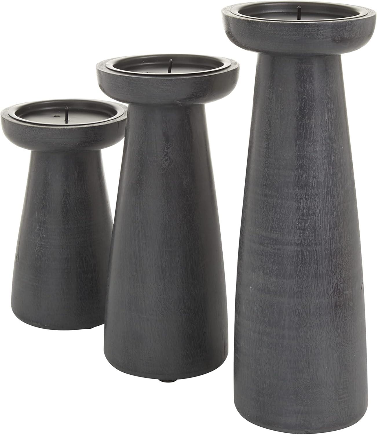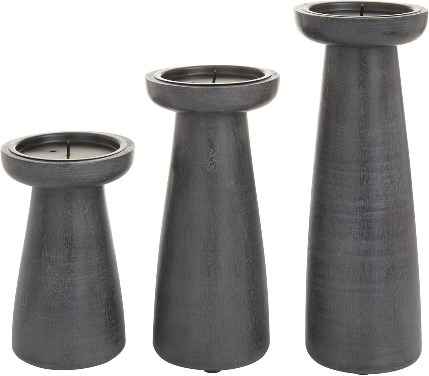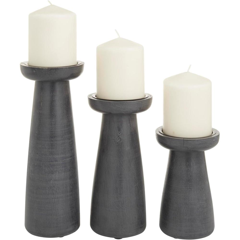 Give your space a radiant illumination with these beautifully crafted candle holders. Made with a sturdy base, it is perfect for creating an elegant atmosphere at your table top or mantel. Show off these versatile candle holders on your entryway, living room, dining area, study room, and the bedroom. Designed with felt or rubber stoppers at the base that prevent scratching furniture and table tops, as well as sliding around. Can hold 3 pillar candles, not included. This item ships in 1 carton. Mango wood candle holder makes a great gift for any occasion. Suitable for indoor use only. This item ships fully assembled in one piece. Made in India. This dark gray colored candle stand comes as a set of 3. Modern style.