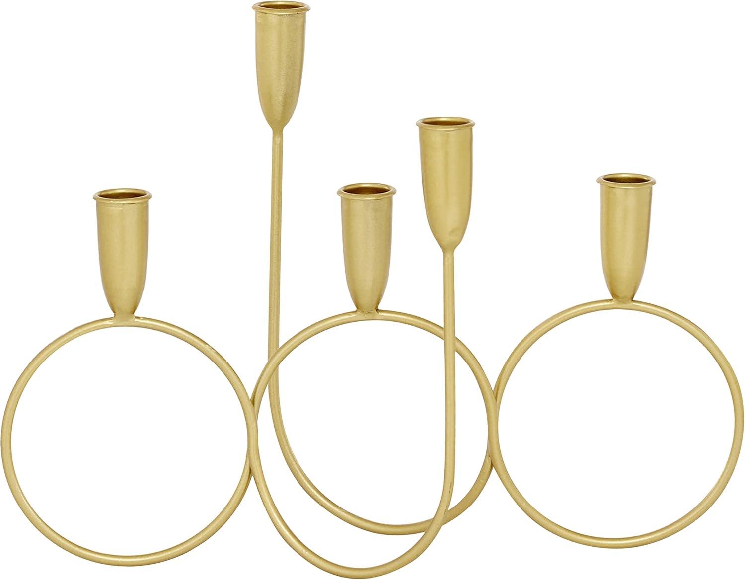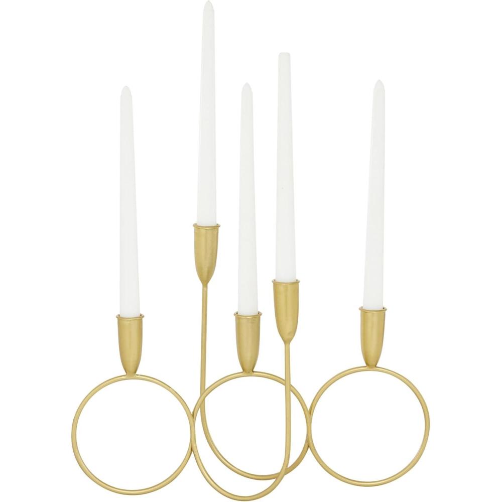 Metal is welded to form circular designs that serve as a base. This candlestick holder can accommodate up to five taper candles. Wipe clean with a dry cloth. It is a great addition to your home decoration and will surely complement your existing furniture. Made with a sturdy base, it is perfect for creating an elegant atmosphere at your table top or mantel. A perfect complement to homes with modern or contemporary style. Can hold 5 taper candles, not included. This item ships in 1 carton. Suitable for indoor use only. This item ships fully assembled in one piece. This is a single gold colored candlestick holder. Contemporary style.