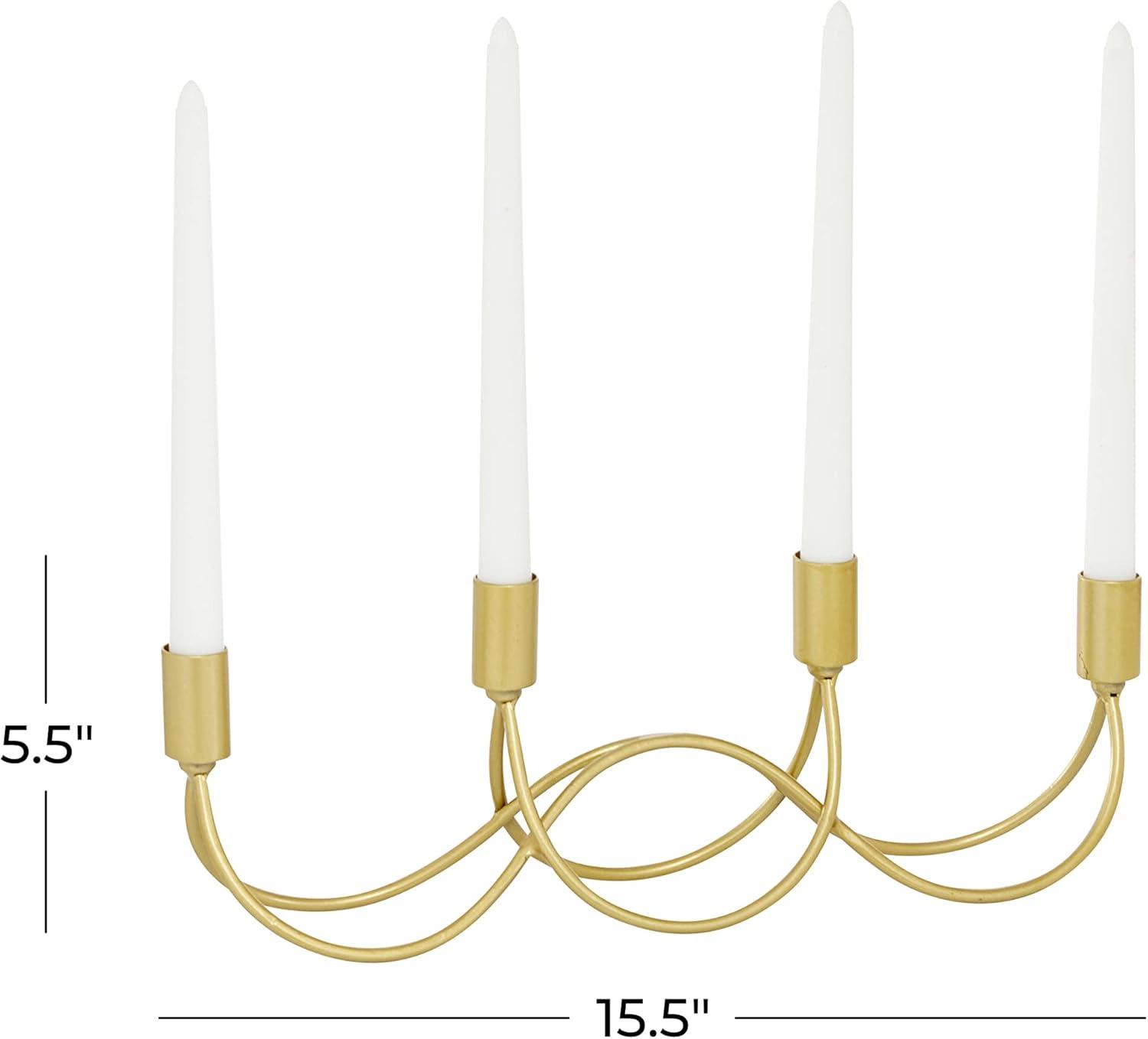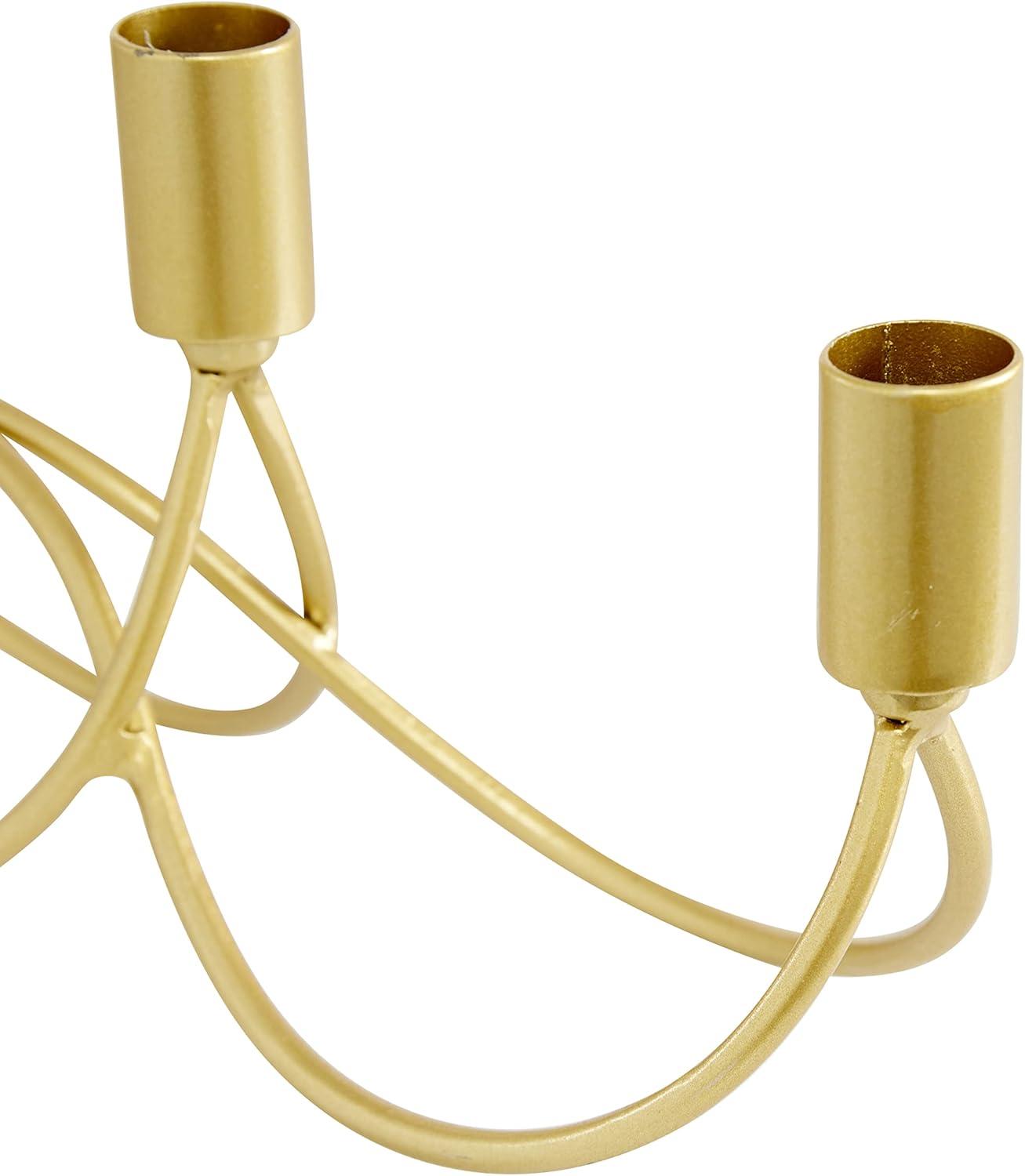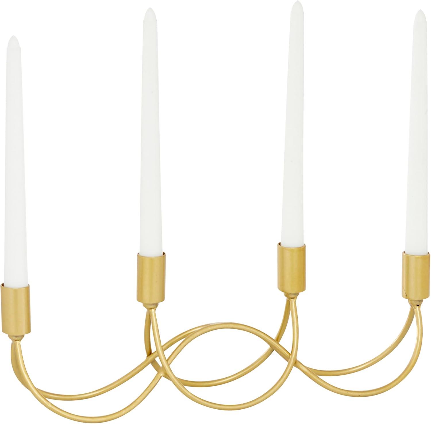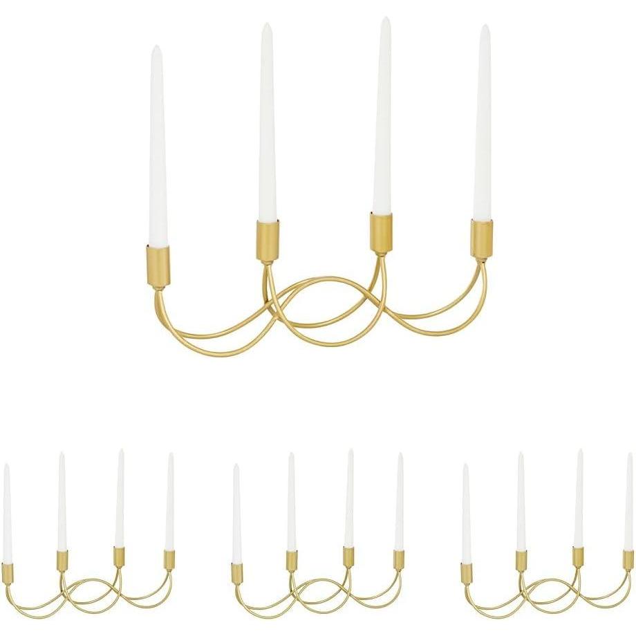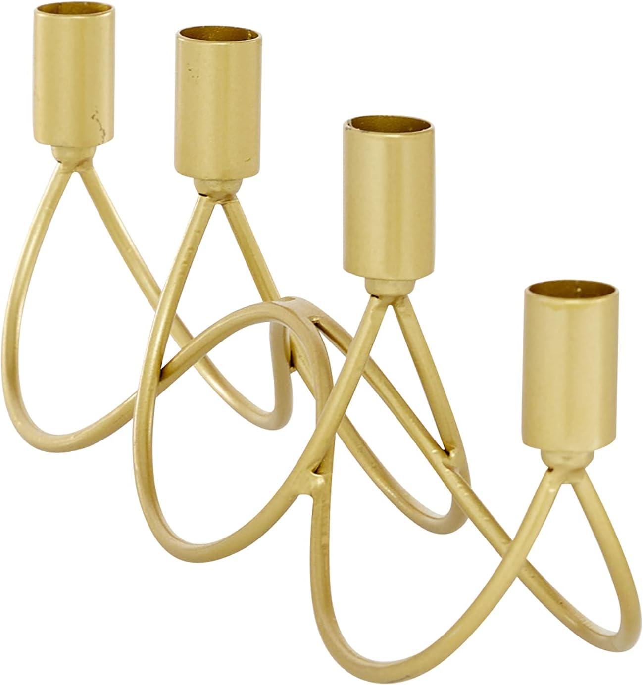 It is a great addition to your home decoration and will surely complement your existing furniture. Made with a sturdy base, it is perfect for creating an elegant atmosphere at your table top or mantel. This candle holder's modern design makes it ideal for both light and dark-hued interior styles. Can hold 4 taper candles, not included. This item ships in 1 carton. Suitable for indoor use only. This item ships fully assembled in one piece. This is a single gold colored candlestick holder. Contemporary style.