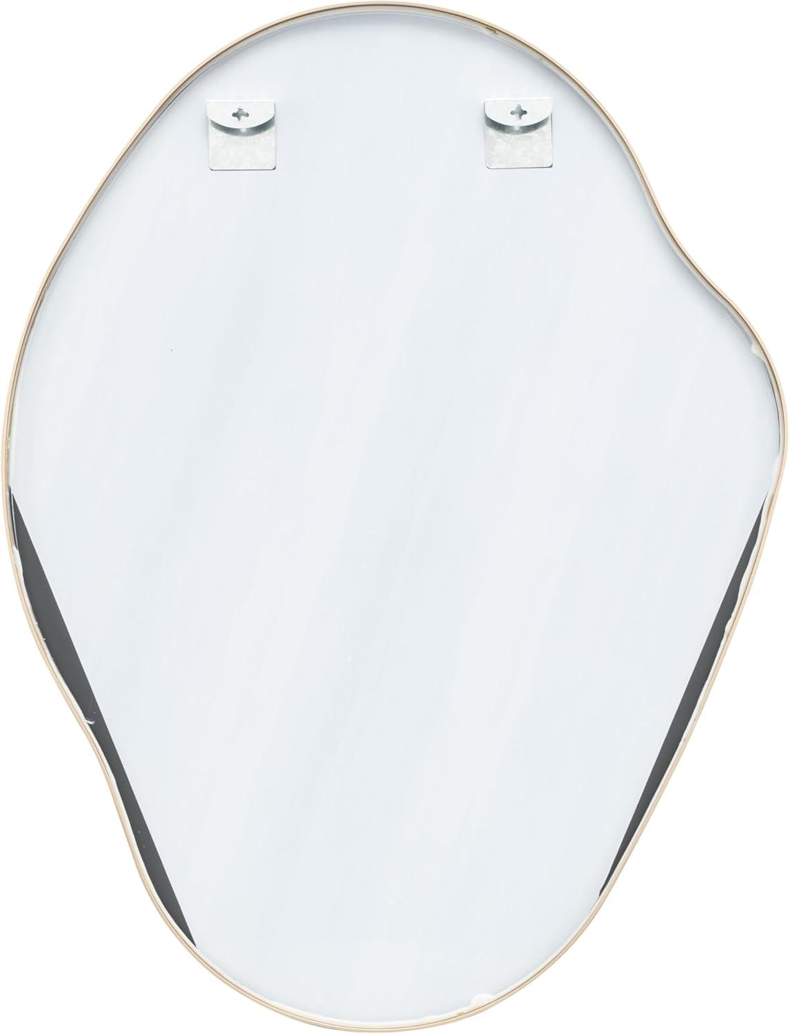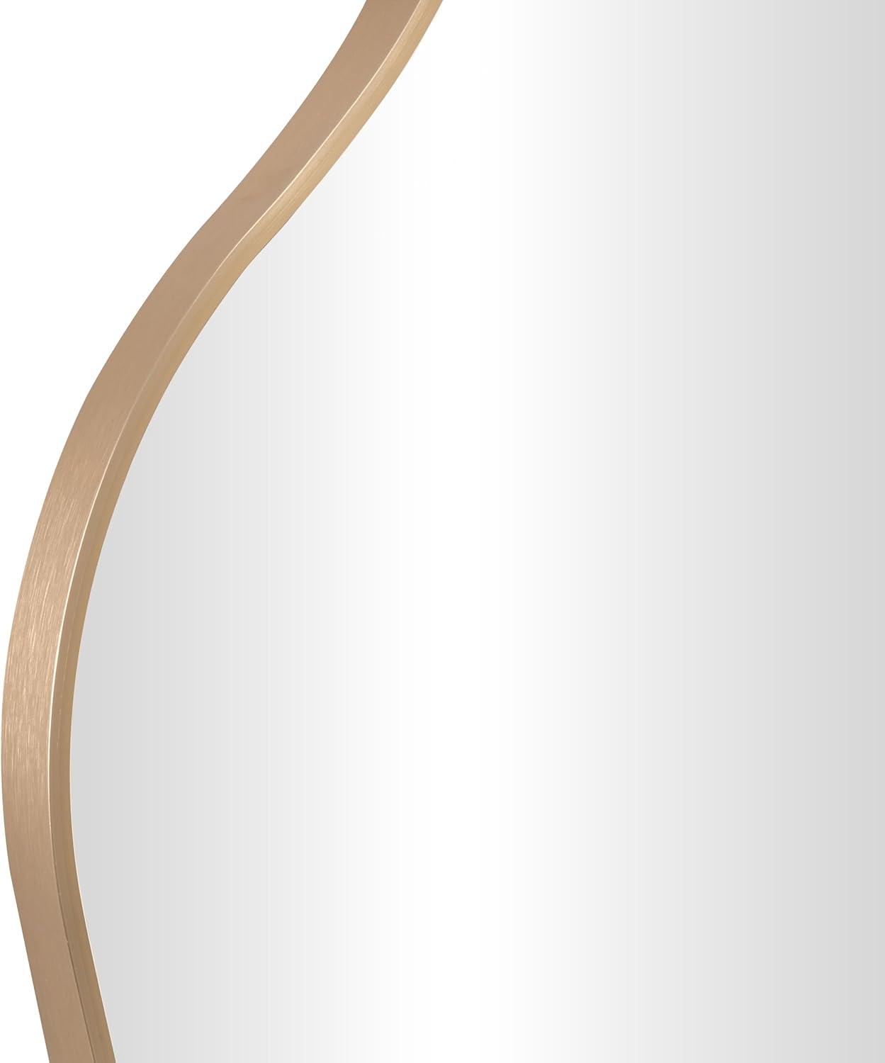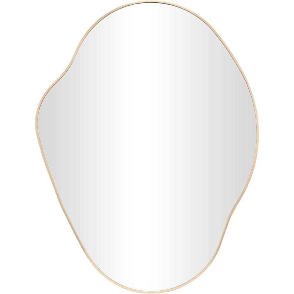 The transitional accent wall mirror is expertly crafted with the beveled mirror encased by an aluminum molded frame that is painted gold. This brushed gold mirror for wall showcases a striking wavy oval shape that complements modern decor. Wipe clean with a dry cloth. This gold entryway mirror is perfect for enhancing the decor in hallways or living rooms. This item ships in 1 carton. Can be hung vertically using the holes; nails and screws not included. Suitable for indoor and outdoor use. This item ships fully assembled in one piece. Made in Vietnam. This is a single gold colored entryway mirror. Transitional style.