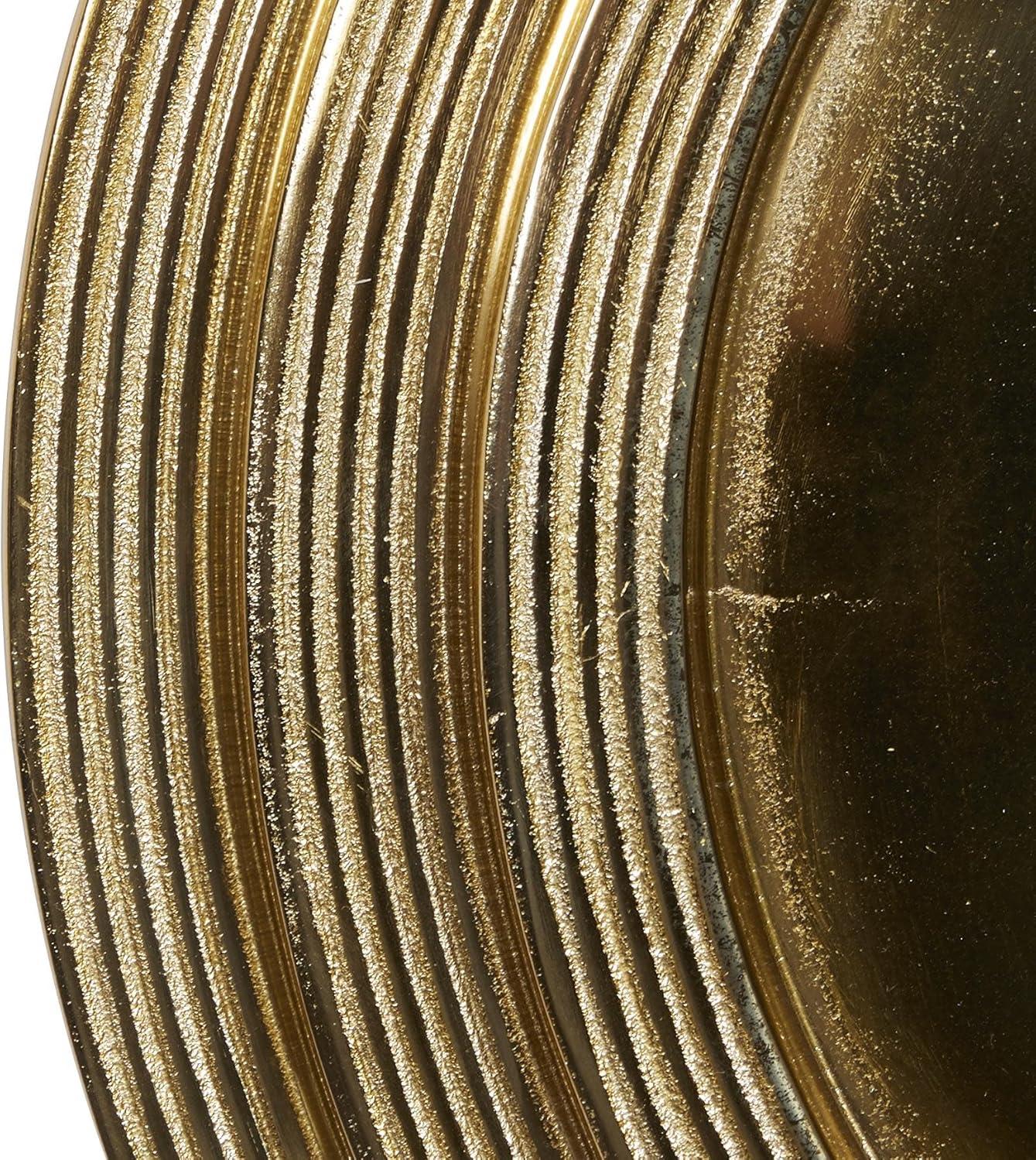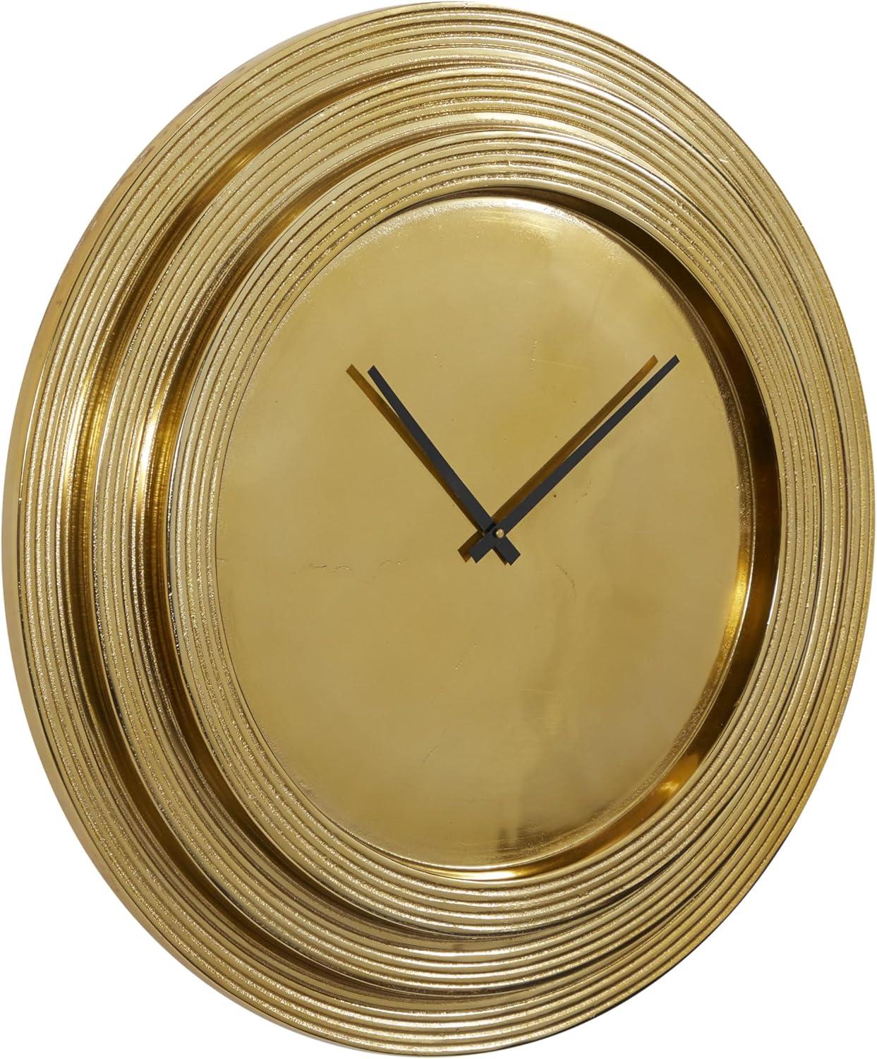 This glam wall clock for kitchen features an elegant frame molded from aluminum with tapered ridges for added texture. The polished gold oversized wall clock carries a round frame with various round outlines throughout. Wipe clean with a dry cloth. Display this gold wall clock for home as a stylish supplement to a blue gallery wall inside a coastal-themed living room or hallway. Requires 1 AA battery, not included. This item ships in 1 carton. This clock has a numberless face. The clock mechanism runs silent. Can be hung vertically using the keyholes; nails and screws not included. Suitable for indoor use only. This item ships fully assembled in one piece. Made in India. This is a single gold colored oversized wall clock. Glam style.