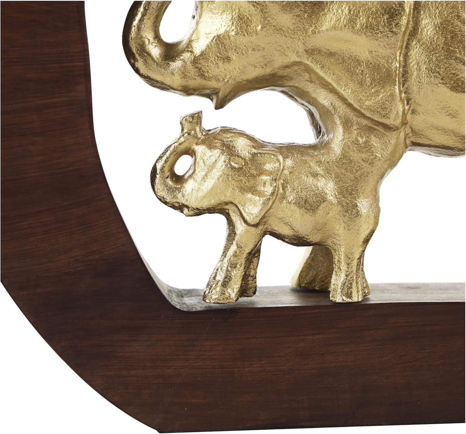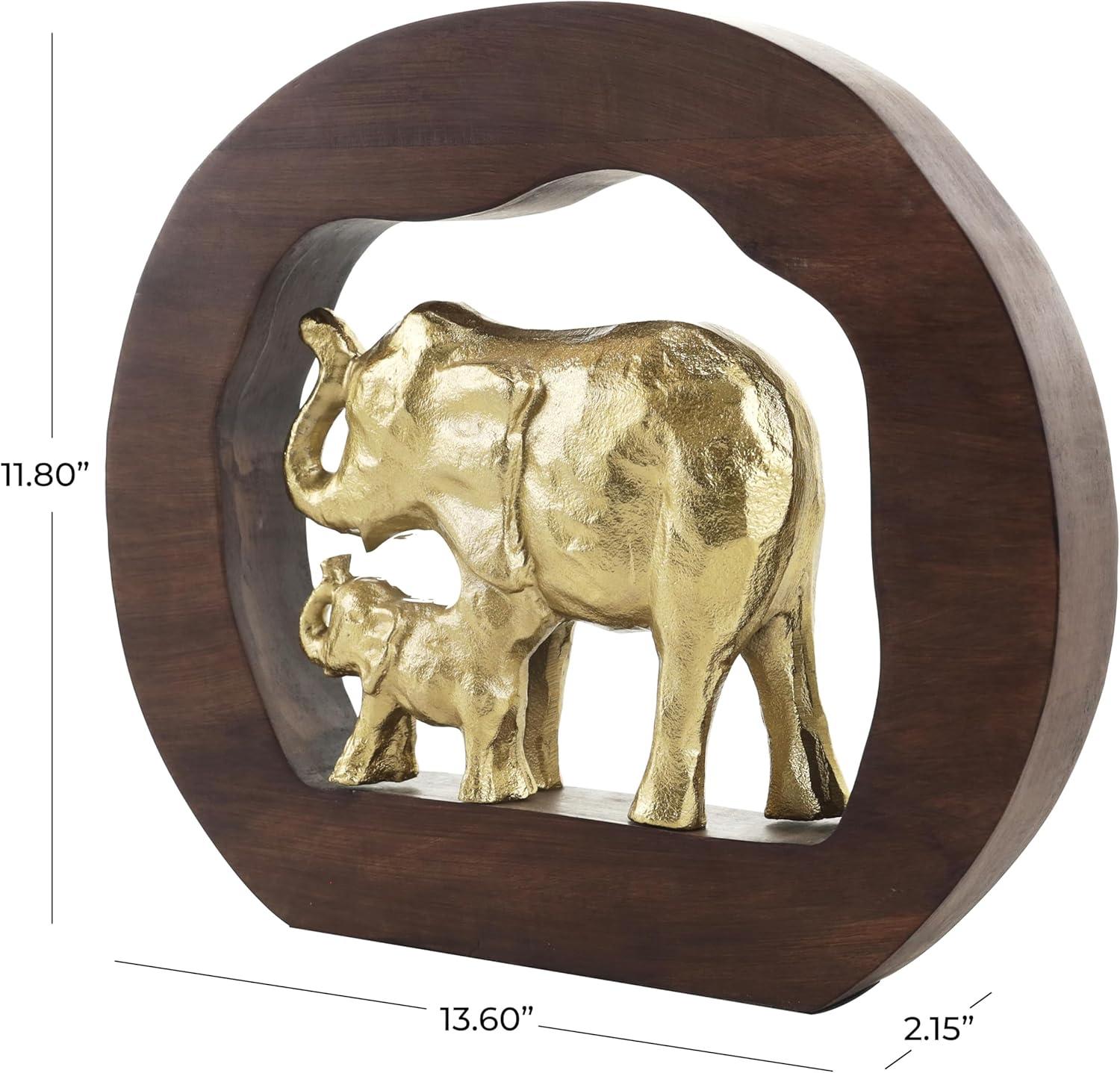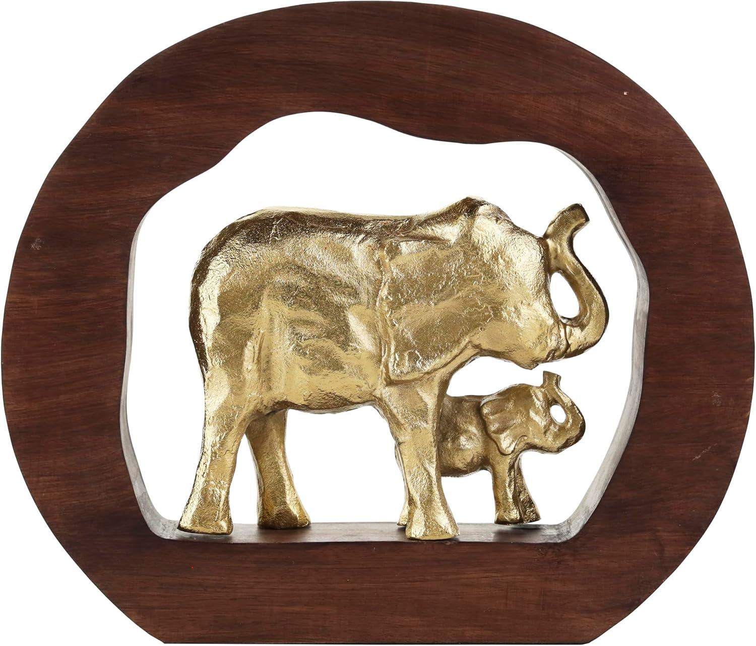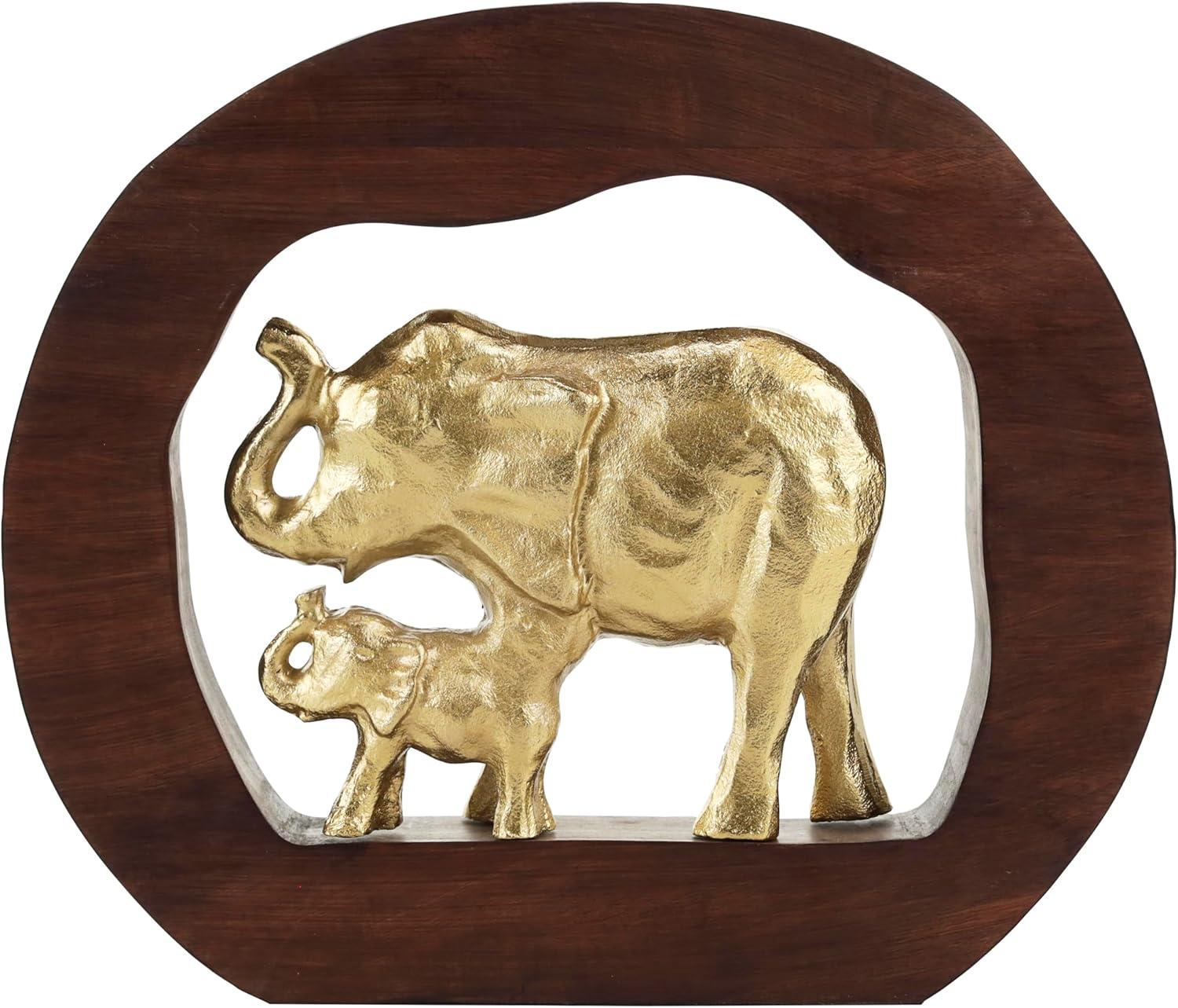 This eclectic accent statue is expertly crafted from durable aluminum securely attached to the round wooden frame, ensuring longevity and beauty. The wavy natural round shape of the wood frame perfectly highlights the gold mom and baby elephant sculpture at the center, making it a captivating shiny gold home decor figurine. Wipe clean with a dry cloth. Place this elephant home decor statue on a mantle or console table alongside a glass vase and fresh greenery for added elegance in your living room. Designed with felt or rubber stoppers at the base that prevent scratching furniture and table tops, as well as sliding around. This item ships in 1 carton. Please note that this item is for decorative use only. Aluminum sculpture makes a great gift for any occasion. Suitable for indoor use only. This item ships fully assembled in one piece. Made in India. This is a single gold colored statue. Eclectic style.