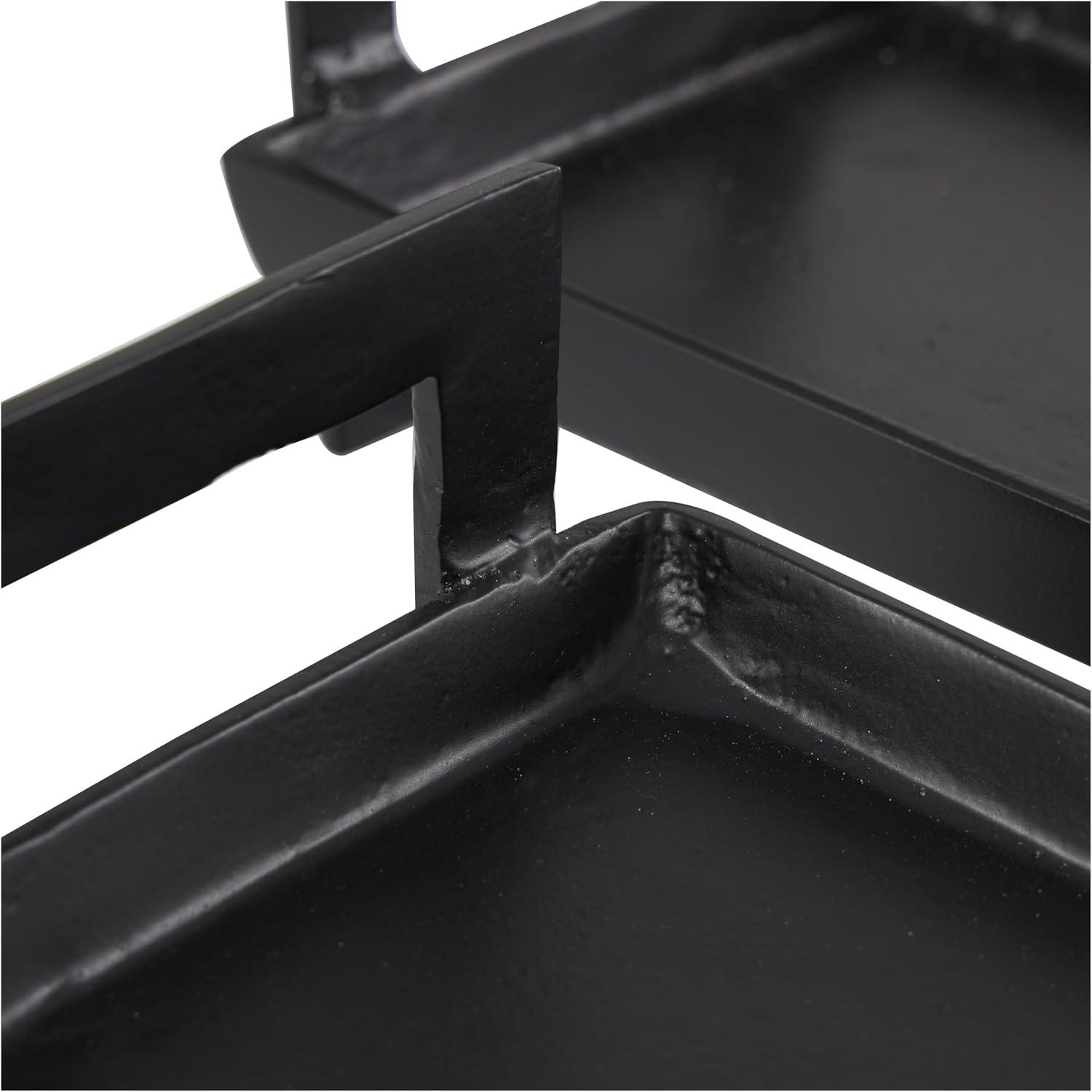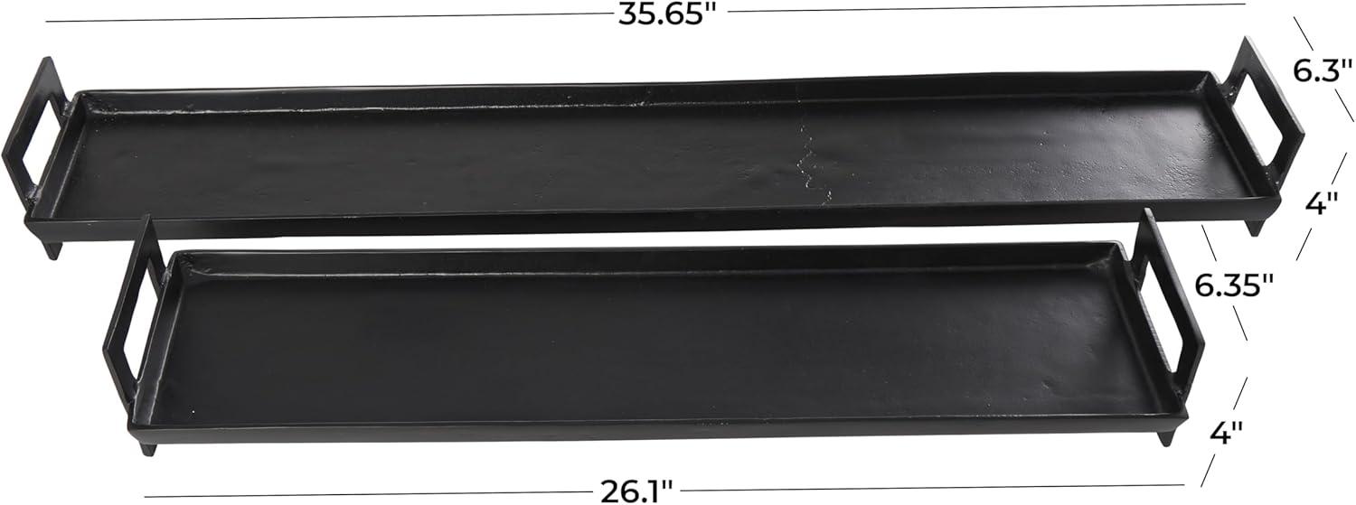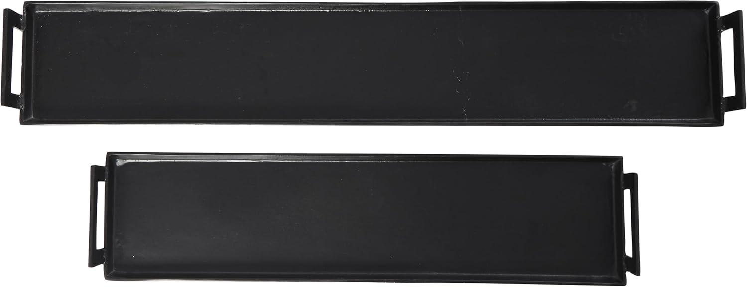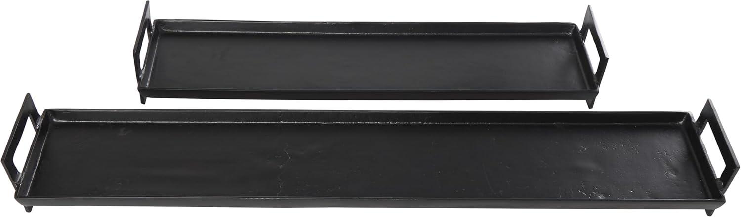 The trays are constructed with strong metal handles for easy carrying. With thin rectangle shapes, each tray has sturdy rectangular handles. Wipe clean with a dry cloth. These trays can be used for serving drinks, displaying items, and organizing items. Designed with felt or rubber stoppers at the base that prevent scratching furniture and table tops, as well as sliding around. This item ships in 1 carton. Please note that this item is for decorative purposes only and is not food safe. Suitable for indoor use only. This item ships fully assembled in one piece. Made in India. This black colored aluminum ottoman tray comes as a set of 2. Modern style.