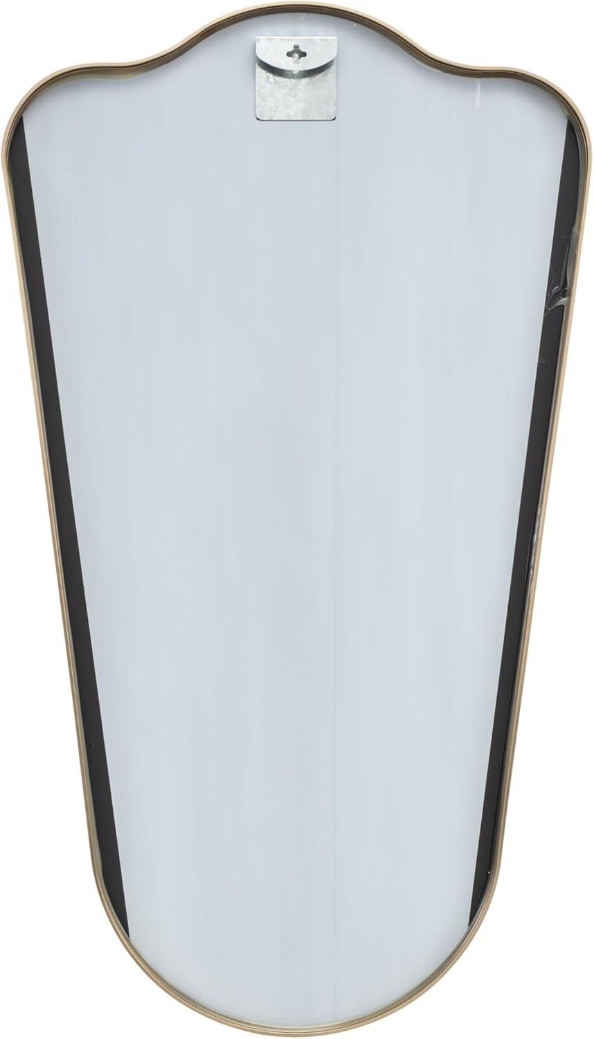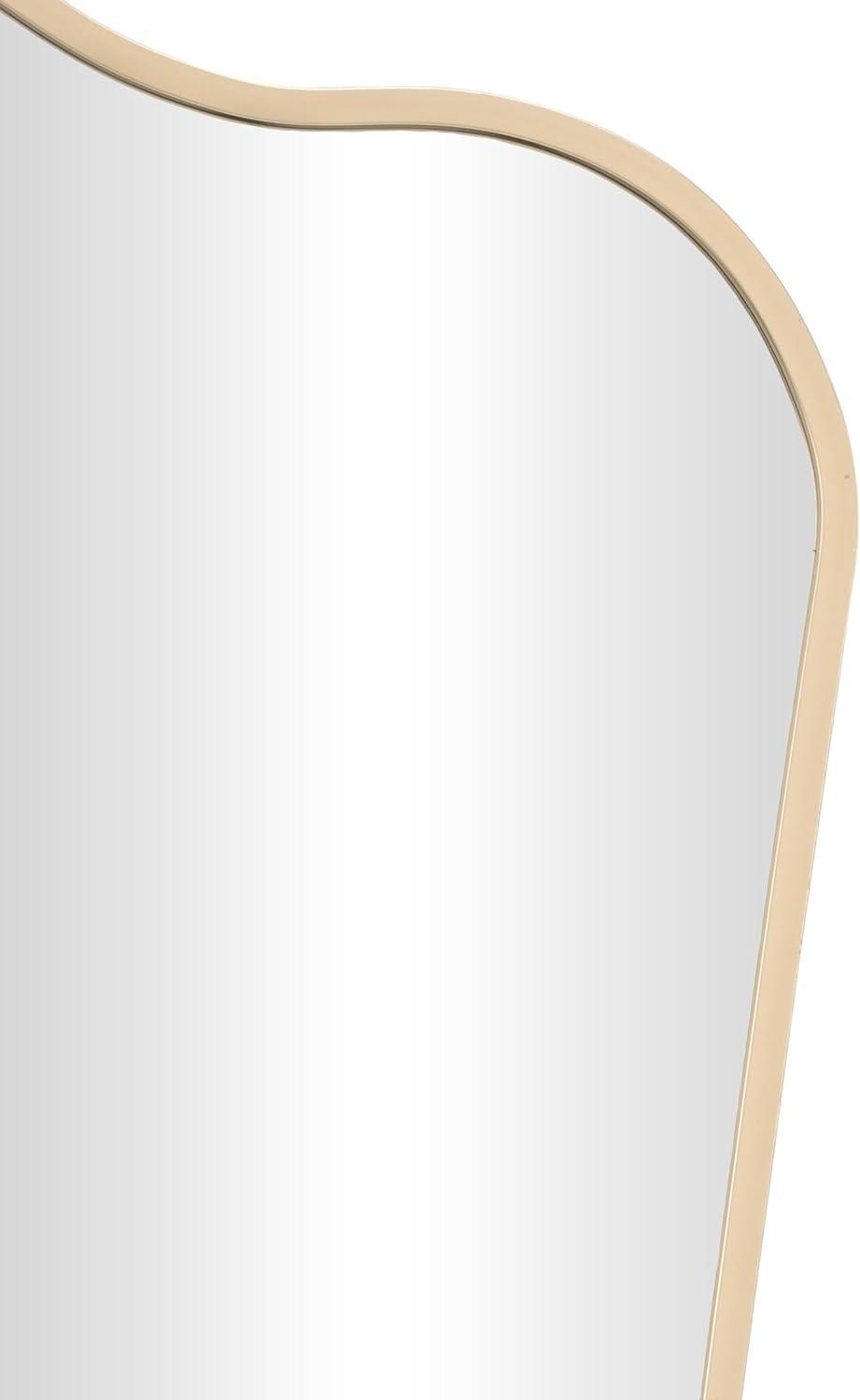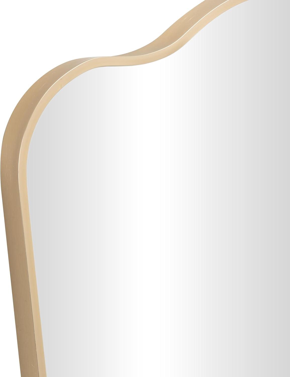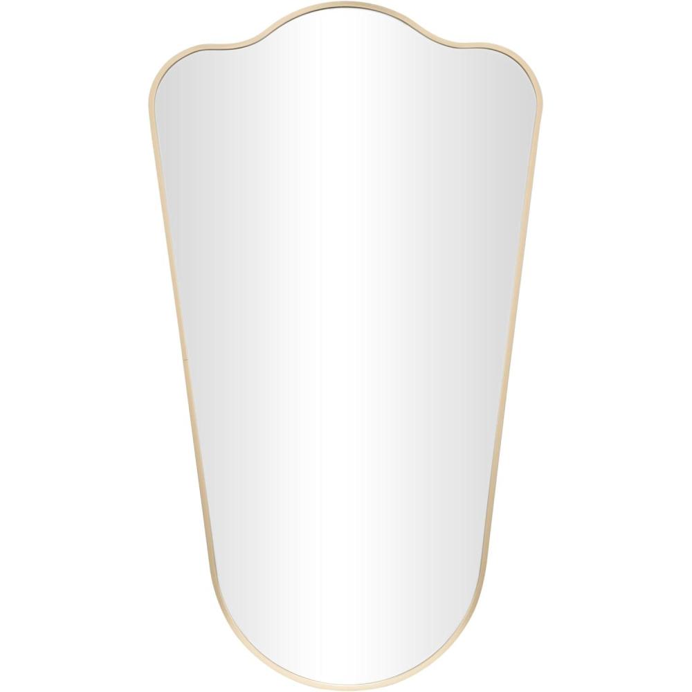 The transitional accent wall mirror is expertly crafted with the beveled mirror encased by an aluminum molded frame that is painted gold. This brushed gold mirror for wall has a graceful arched shape with a wavy top that complements various decor styles. Wipe clean with a dry cloth. This gold entryway mirror is perfect for enhancing the decor in hallways or living rooms. This item ships in 1 carton. Can be hung vertically using the holes; nails and screws not included. Suitable for indoor and outdoor use. This item ships fully assembled in one piece. Made in Vietnam. This is a single gold colored entryway mirror. Transitional style.