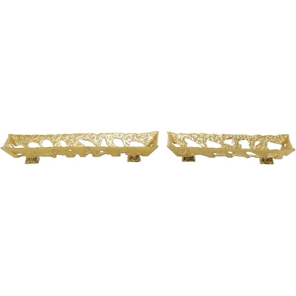 Aluminum are molded together to form an abstract structure with thick leg base for a sturdy design. Unique molten-like patterns decorate the open-style design of these rectangle gold trays. Wipe clean with a dry cloth. Whether in your kitchen, or on your coffee table, it's a great way to display and store your favorite things. Keep your table top protected as you display your memorabilia and belonging on these trays. These gold metal trays perfectly display home trinkets and decorative orbs on center and console tables. Designed with felt or rubber stoppers at the base that prevent scratching furniture and table tops, as well as sliding around. This item ships in 1 carton. Please note that this item is for decorative purposes only and is not food safe. Aluminum tray makes a great gift for any occasion. Suitable for indoor use only. This item ships fully assembled in one piece. Made in India. This gold colored aluminum ottoman tray comes as a set of 2. Contemporary style.