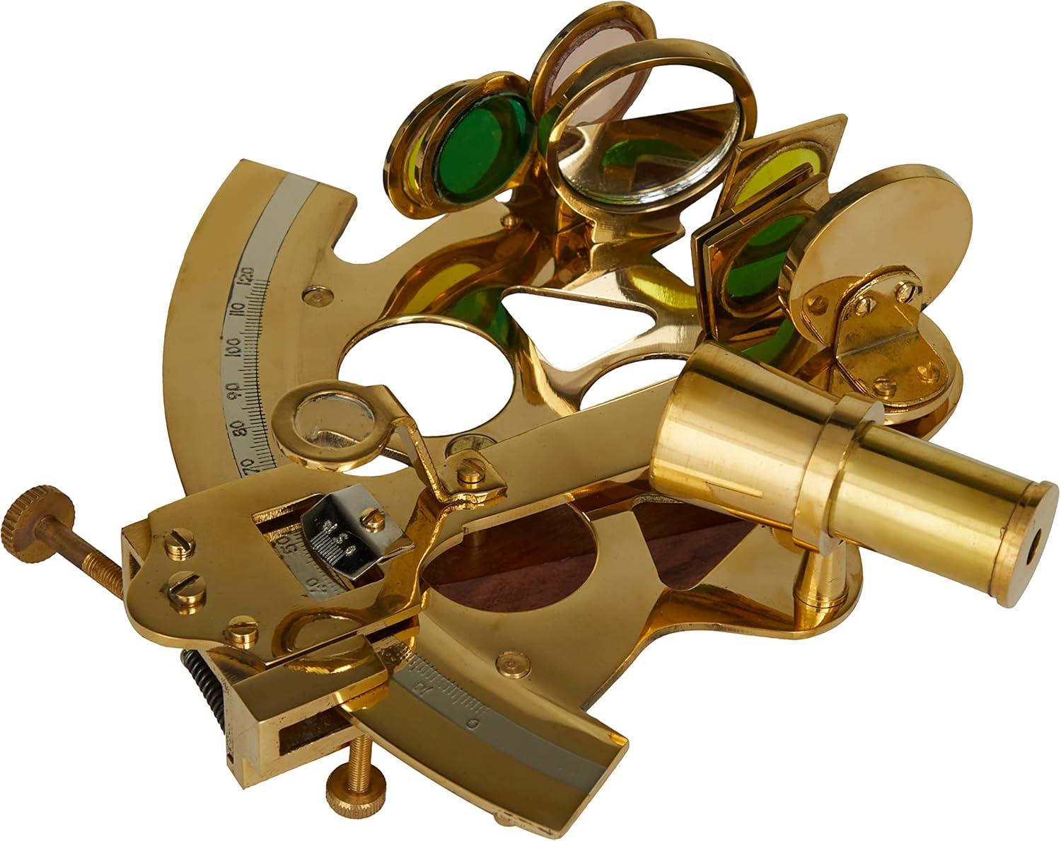 GOLD AND BROWN POLISHED FINISH An heirloom decor featuring a brown box and a gold sextant instrument replica