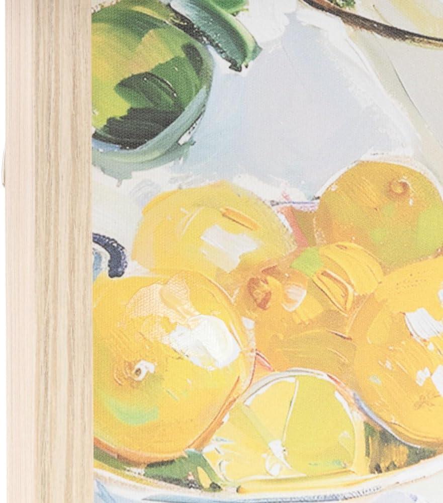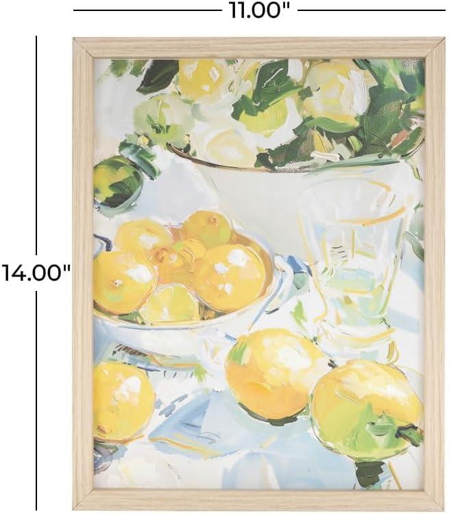 The natural framed canvas art is expertly crafted with acrylic paint meticulously applied to the canvas, which is then elegantly enclosed within a sturdy MDF frame and supported by an MDF backing. The textured yellow wall framed art maintains a rectangular shape with a painting of lemons and flowers, offering a balanced and harmonious look. Wipe clean with a dry cloth. This fruit canvas wall art is an ideal choice for infusing a burst of color and life into your living room or kitchen, creating a cheerful and inviting atmosphere. This item ships in 1 carton. Can be hung vertically using the d-rings; nails and screws not included. Suitable for indoor use only. This item ships fully assembled in one piece. This is a single yellow colored canvas wall art. Natural style.