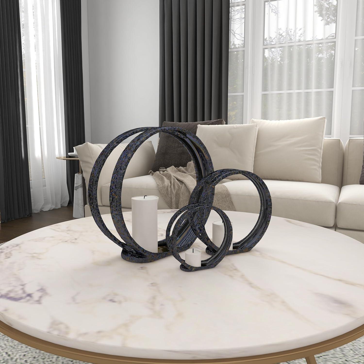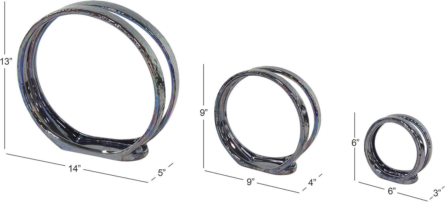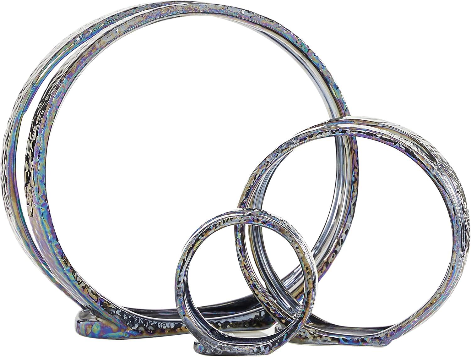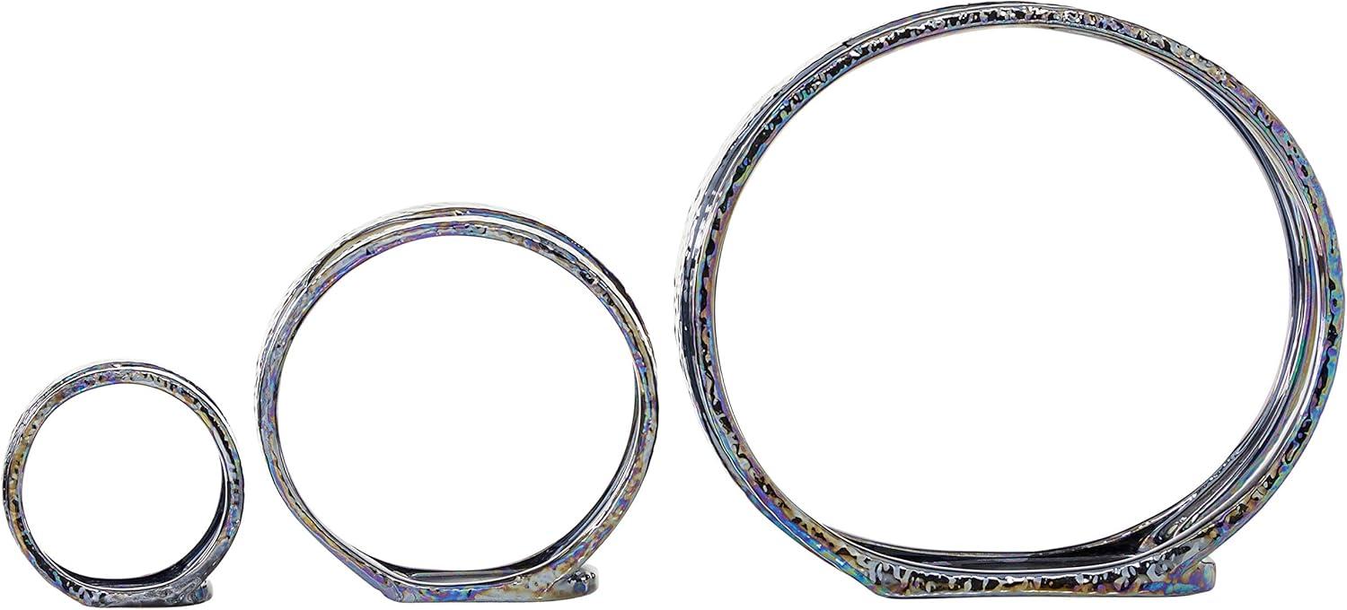 SILVER POLISHED FINISH Shiny, metallic silver electroplated finish with reflective rainbow colors over the 3 sizes of circle sculptures that sit upright on their flat bases