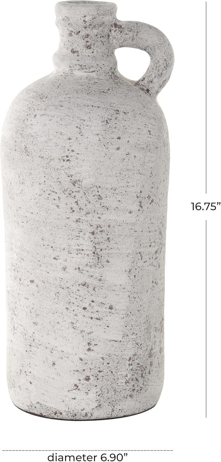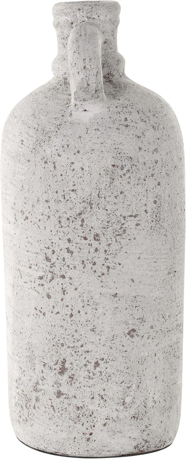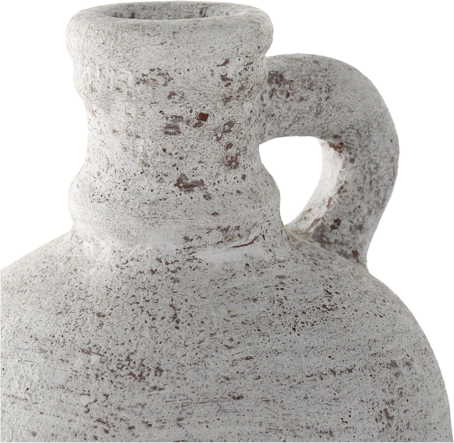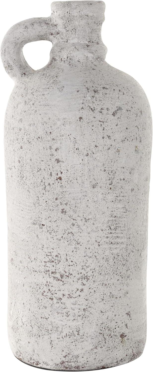 Terracotta is carefully molded, fired, and glazed, capturing both artistry and functionality in the form of a vase. A cylinder-shaped vase with a single handle boasts an abstract pattern of subtle cracks and imperfections, adding to its unique and charming character. Wipe clean with a dry cloth. Use this vase as a centerpiece on your farmhouse-style dining table or as an eye-catching display on a mantel, allowing it to house dried flowers or stand alone as a rustic decor accent. Designed with felt or rubber stoppers at the base that prevent scratching furniture and table tops, as well as sliding around. This item ships in 1 carton. Suitable for indoor use only. This item ships fully assembled in one piece. Made in Indonesia. This is a single cream colored vase. Farmhouse style. Vase has a 1.50 in mouth opening.
