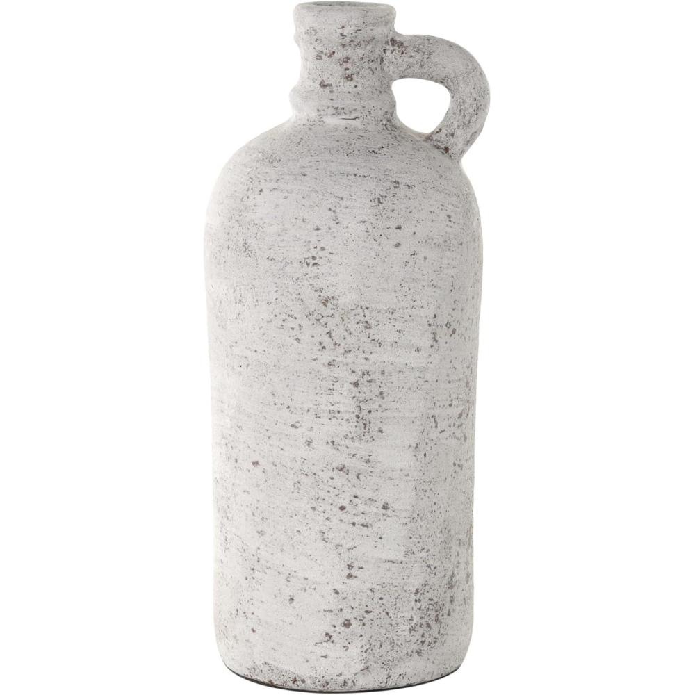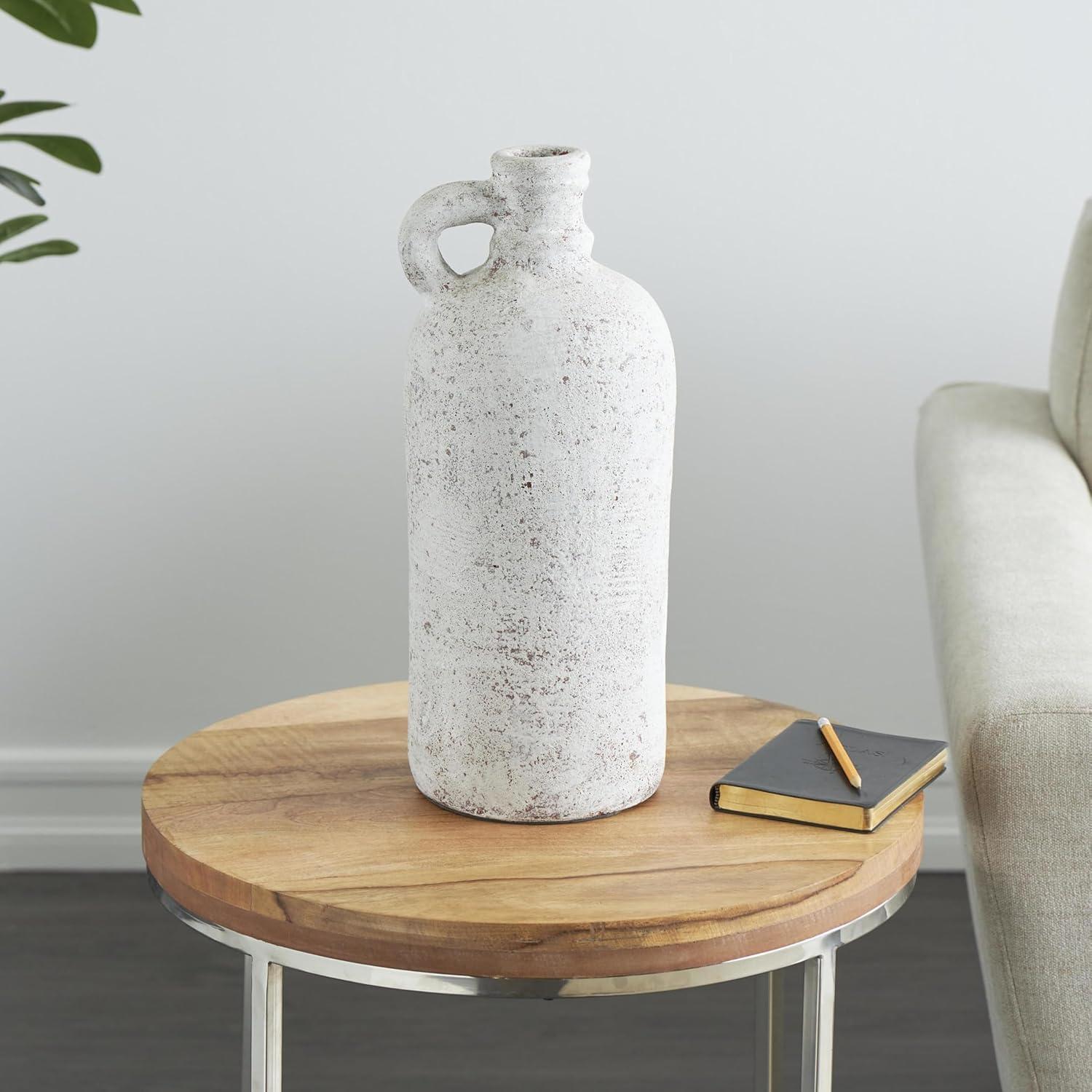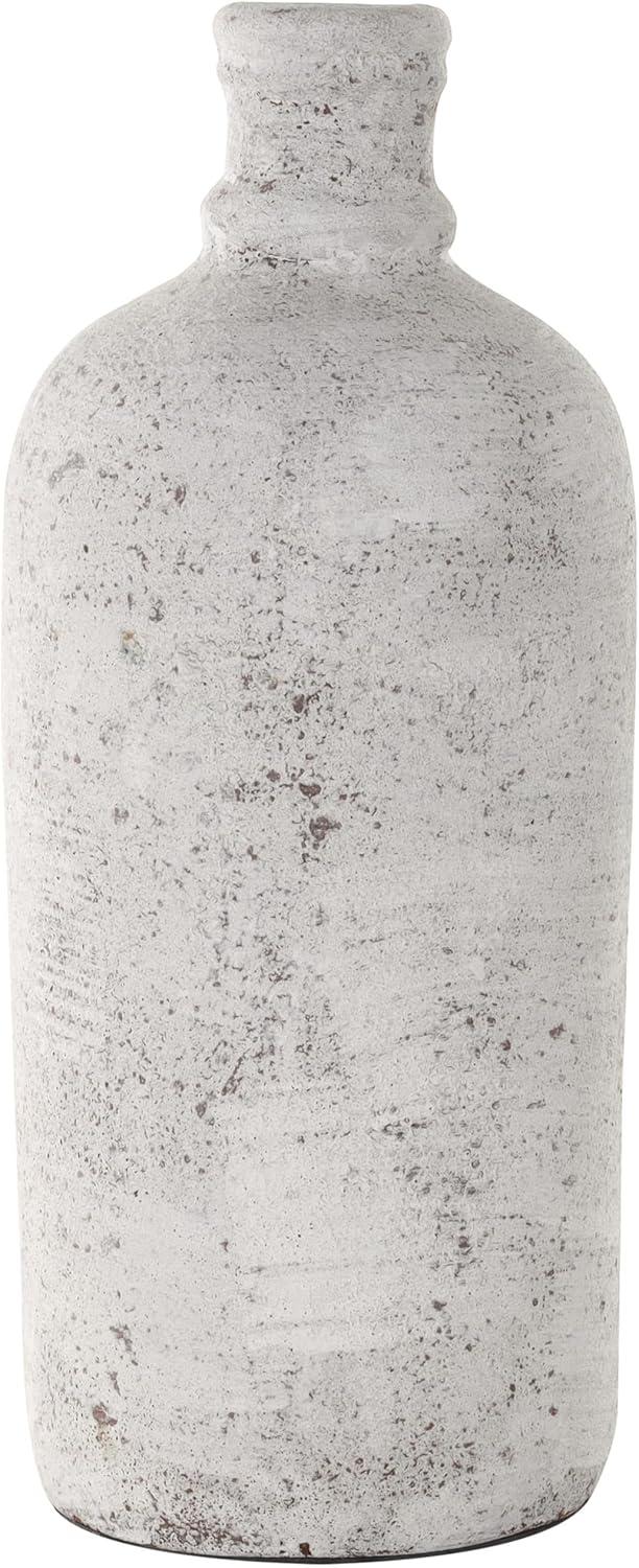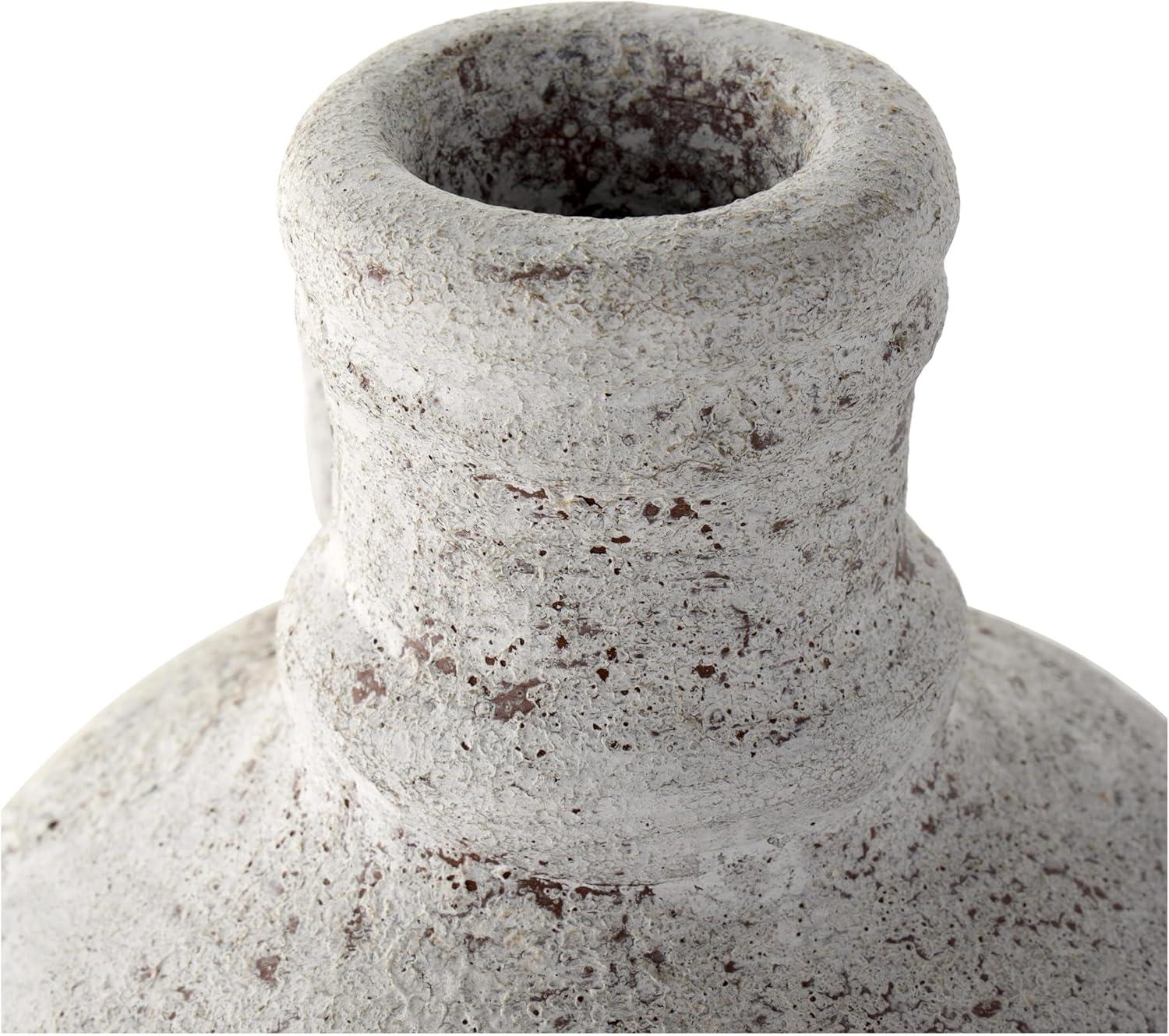 Terracotta is carefully molded, fired, and glazed, capturing both artistry and functionality in the form of a vase. A cylinder-shaped vase with a single handle boasts an abstract pattern of subtle cracks and imperfections, adding to its unique and charming character. Wipe clean with a dry cloth. Use this vase as a centerpiece on your farmhouse-style dining table or as an eye-catching display on a mantel, allowing it to house dried flowers or stand alone as a rustic decor accent. Designed with felt or rubber stoppers at the base that prevent scratching furniture and table tops, as well as sliding around. This item ships in 1 carton. Suitable for indoor use only. This item ships fully assembled in one piece. Made in Indonesia. This is a single cream colored vase. Farmhouse style. Vase has a 1.50 in mouth opening.