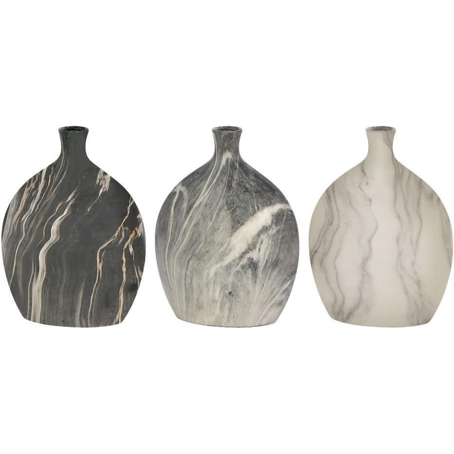 Three assorted 13 inch classic elegance marble-finish ceramic bottle vases, light Gray with white, Dark Gray with white and tan and white with Gray veining, tapered neck flat rounded stoneware bottles with flat oval bases. This product is manufactured in China.