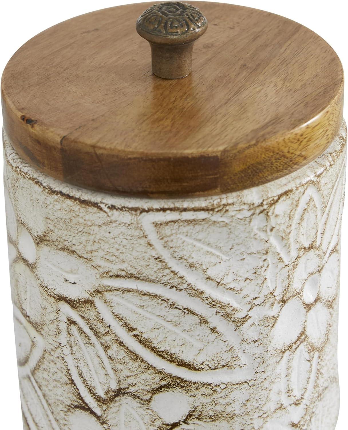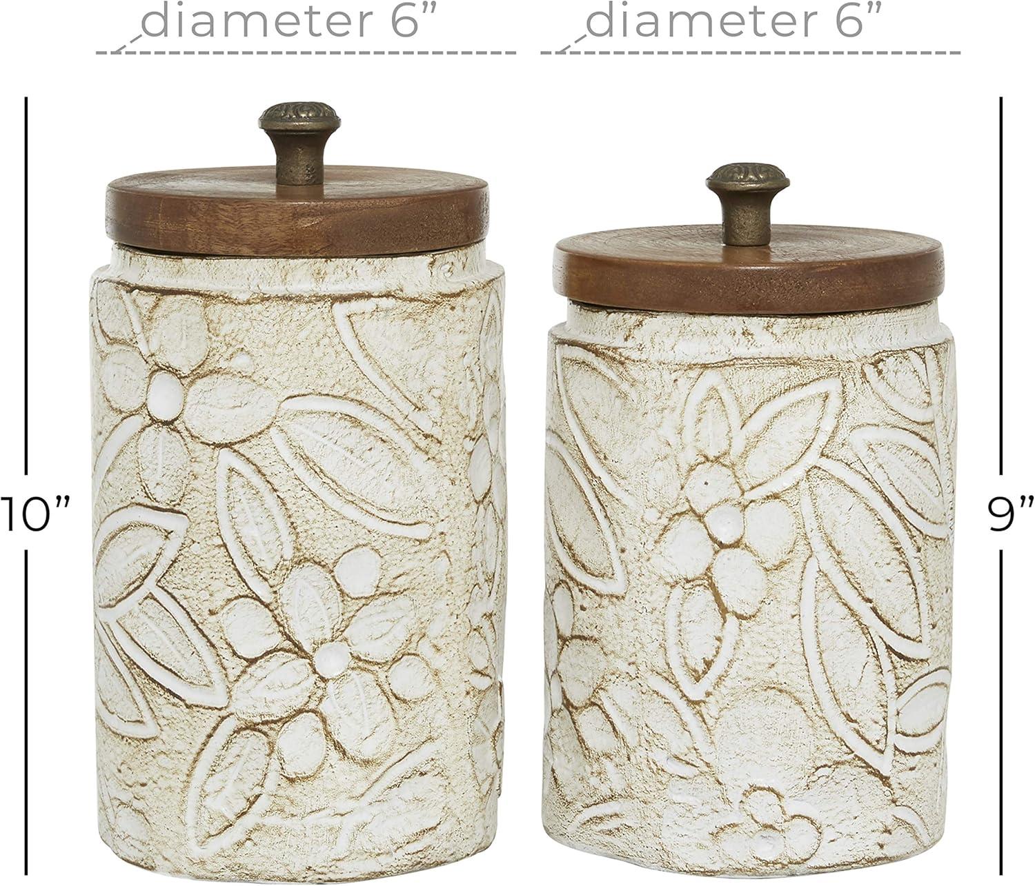 Deco 79 Ceramic Handmade Living Room Decorative Jars Intricately Carved Decorative Container with Wood Lids, Set of 2 Jar with Lid 9″, 10″H, White