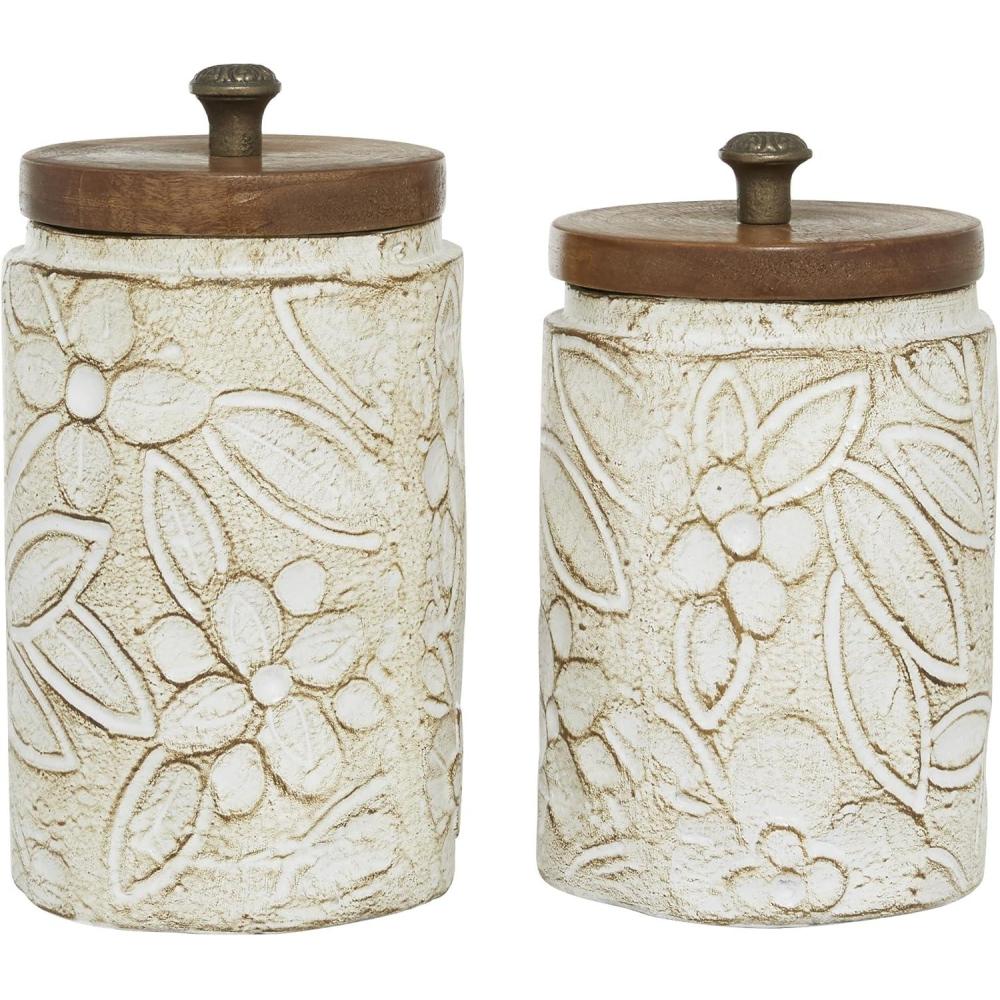 Each piece in this farmhouse set of 2 decorative jars for living room is carefully shaped and carved from dolomite materials and topped with wooden lids and metal knobs, demonstrating skilled craftsmanship. These distressed white centerpiece jars have a round shape, adorned with a floral design pattern on the exterior and completed with wooden lids. Wipe clean with a dry cloth. The perfect compact storage for your belongings while keeping your surface space protected. Give your surface space a finishing touch with these beautifully crafted decorative jars. This white set of 2 decorative containers can be used as standalone decor or as unique storage solutions on your kitchen counters. This item ships in 1 carton. Please note that this item is for decorative purposes only and is not food safe. Dolomite decorative jars make a great gift for any occasion. Due to the handmade nature of this item, no two will be alike, there will be slight differences in shape, size, and color. Suitable for indoor use only. This item ships fully assembled in one piece. Made in India. This white colored dolomite decorative containers comes as a set of 2. Farmhouse style. Vases have 4.50 in, and 4.50 in mouth openings.