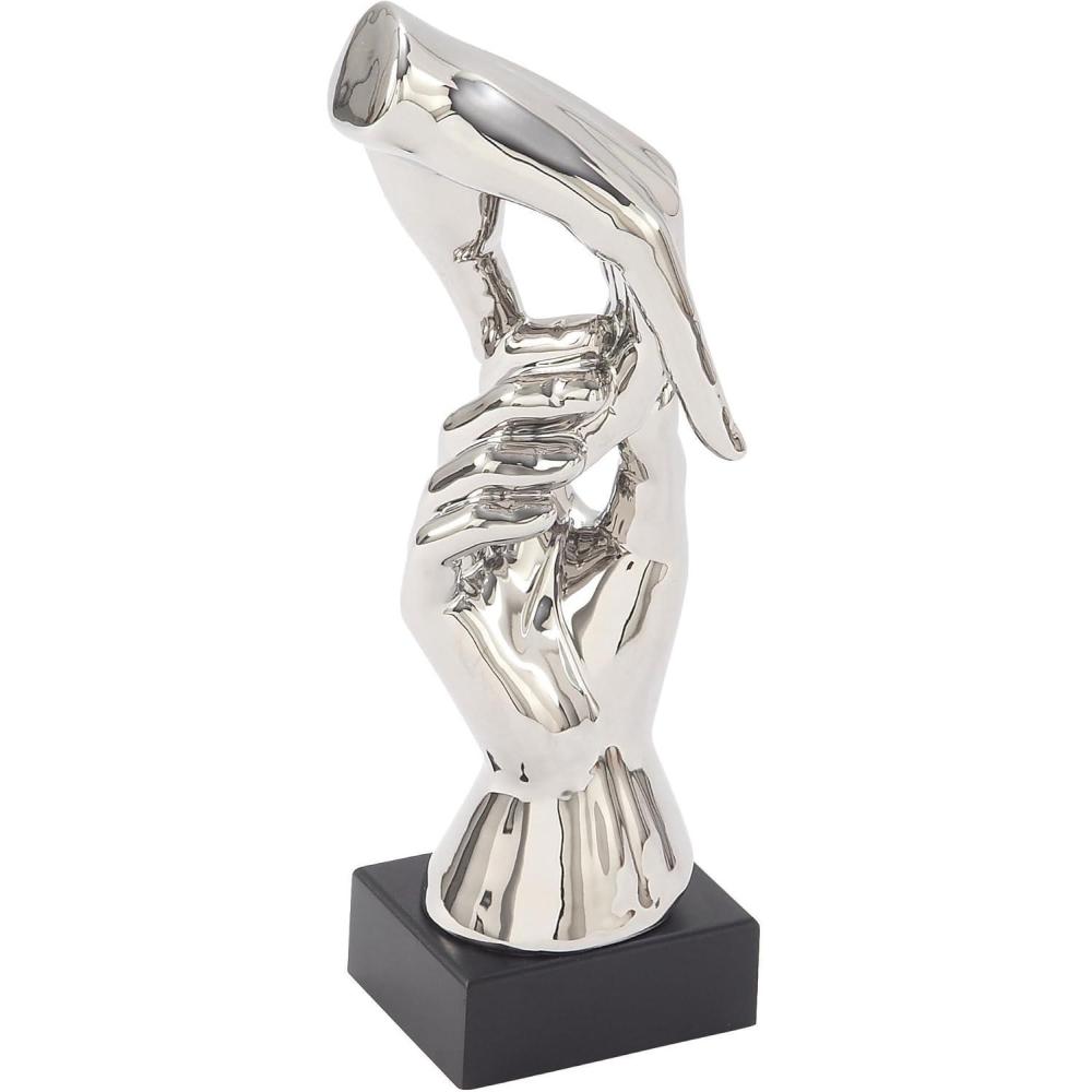 This modern accent statue is meticulously crafted with smooth ceramic and finished with a reflective silver coating. Shaped like hands gripping each other's wrists, this glossy silver home decor figurine makes a striking visual statement. Wipe clean with a dry cloth. Ideal for display in living rooms or offices, this hands home decor statue adds a modern touch. Designed with felt or rubber stoppers at the base that prevent scratching furniture and table tops, as well as sliding around. This item ships in 1 carton. Please note that this item is for decorative use only. Ceramic sculpture makes a great gift for any occasion. Suitable for indoor use only. This item ships fully assembled in one piece. This is a single silver colored statue. Modern style.