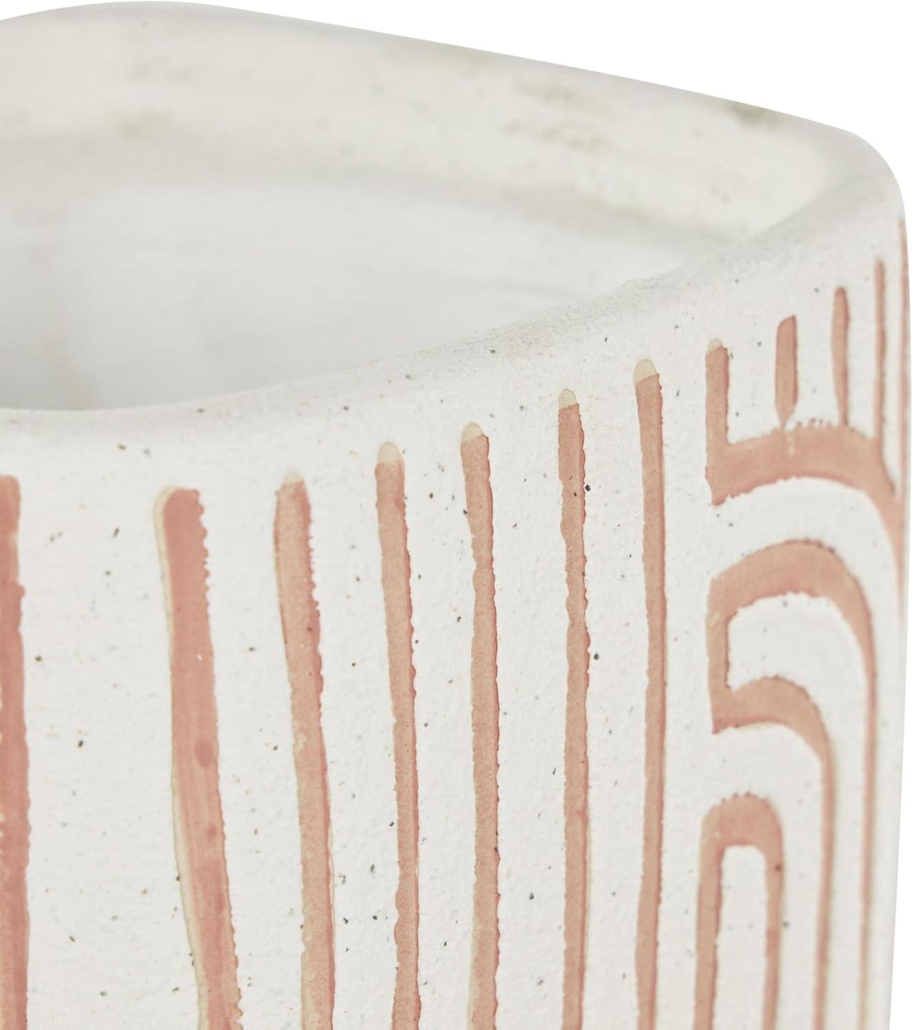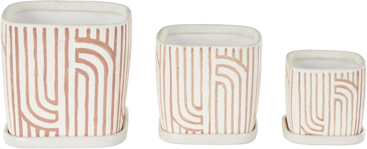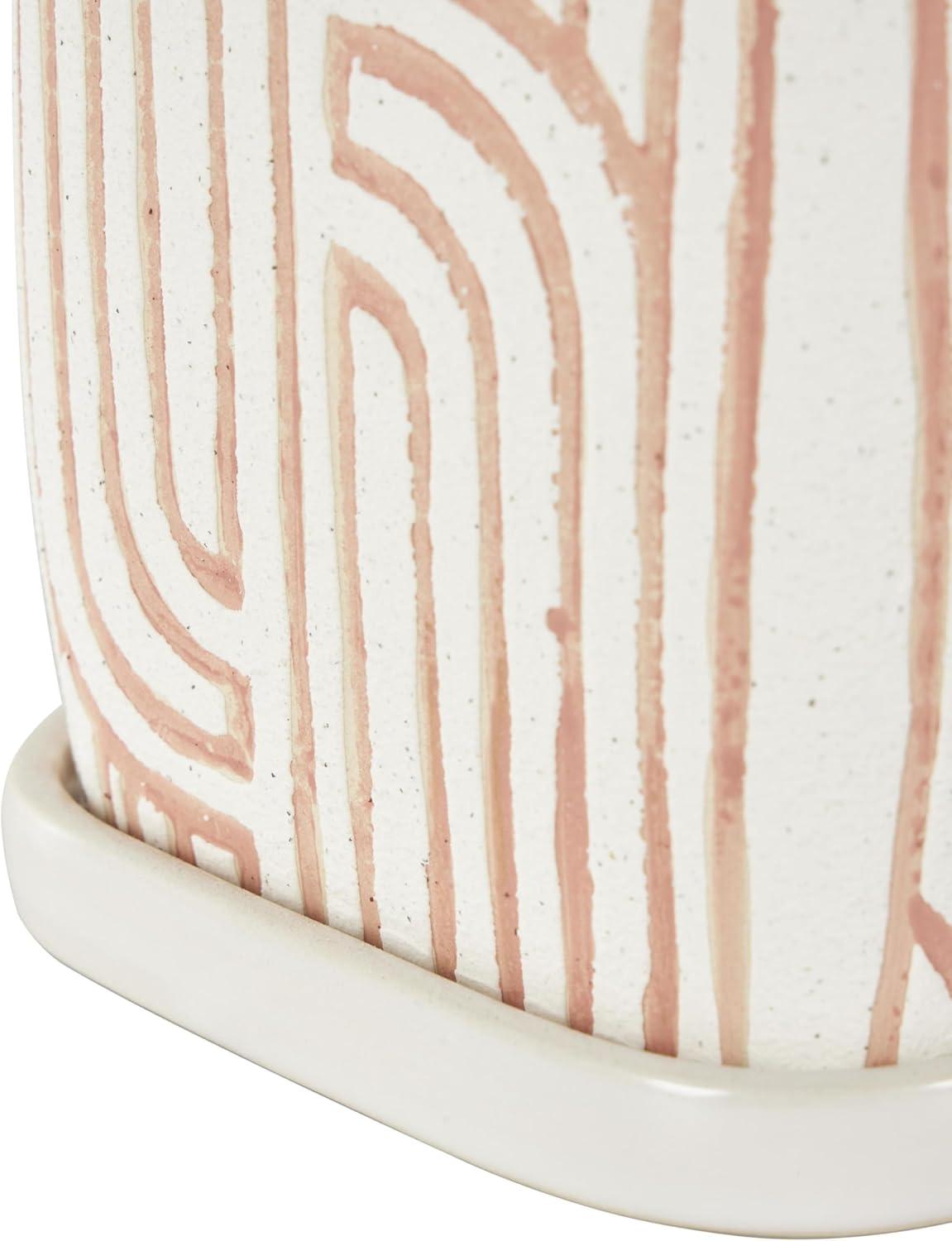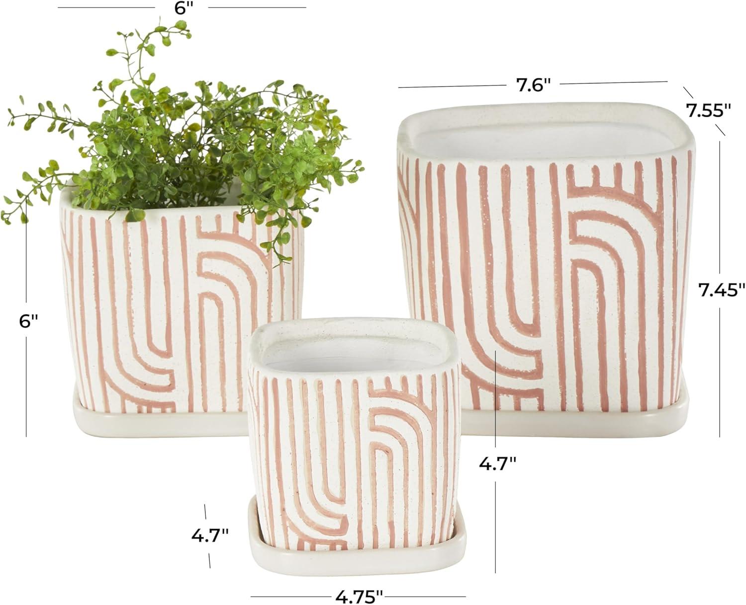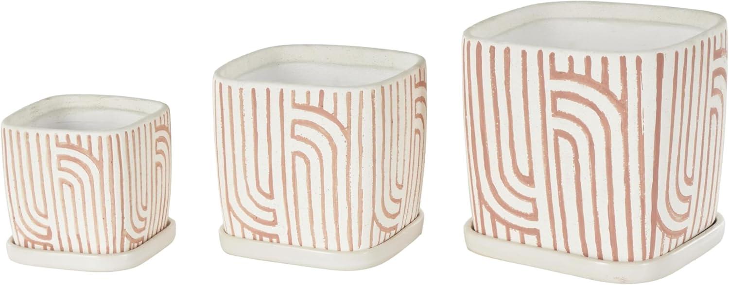 Deco 79 Ceramic Indoor Outdoor Planter Small Planter Pot with Overlapping Green Arches and Attached Saucer, Set of 3 Planters 7',6',5'H, White(Pink)