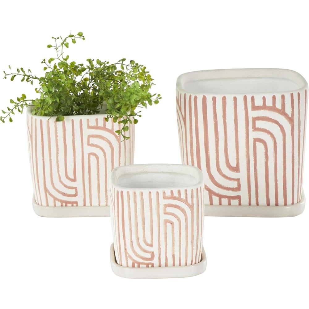 image:imageDeco 79 Ceramic Indoor Outdoor Planter Small Planter Pot with Overlapping Green Arches and Attached Saucer Set of 3 Planters 765H WhitePink
