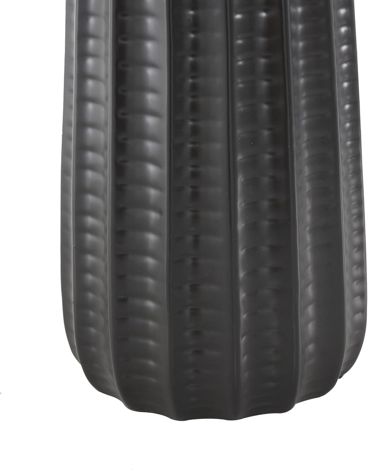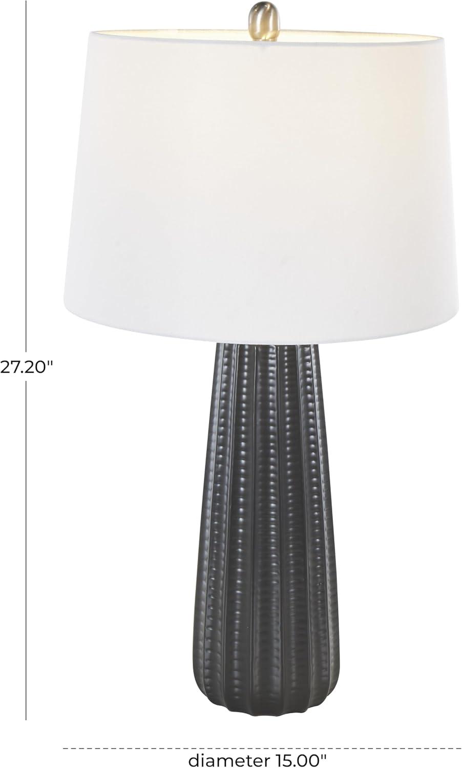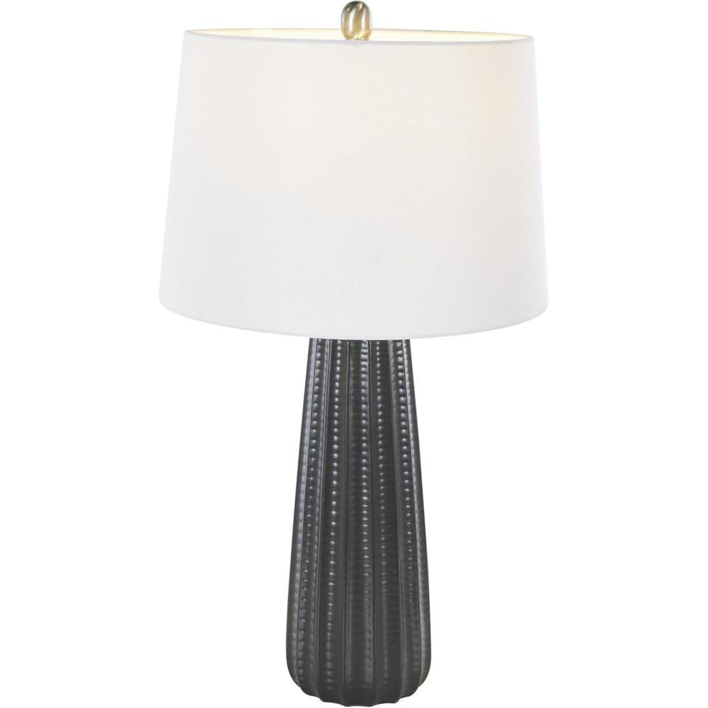 This modern living room table lamp has been crafted with the ceramic base providing a sturdy foundation and the white drum shade diffusing soft light. Matte black accent lamp for table showcases its distinctive round shape with ribbed textures and a drum shaped shade, making it a standout piece in any home decor. Wipe clean with a dry cloth. This black accent lamp would be a perfect addition to any living room or bedroom, creating an intimate atmosphere. Requires 1 60W Type A E26/Medium (Standard) bulb. This item ships in 1 carton. Comes with a 63″ cord length. Suitable for indoor use only. This item ships fully assembled in one piece. Table lamp comes with a white drum shaped shade that measures 15 x 15 x 10 inches. Includes a rotary switch. This is a single black colored accent lamp. Modern style.