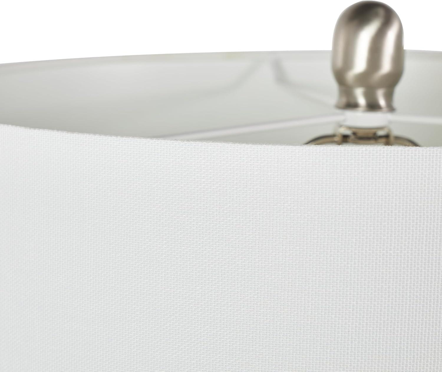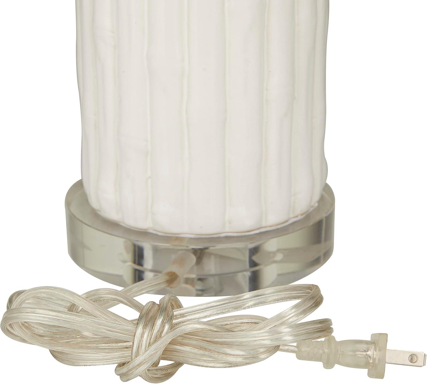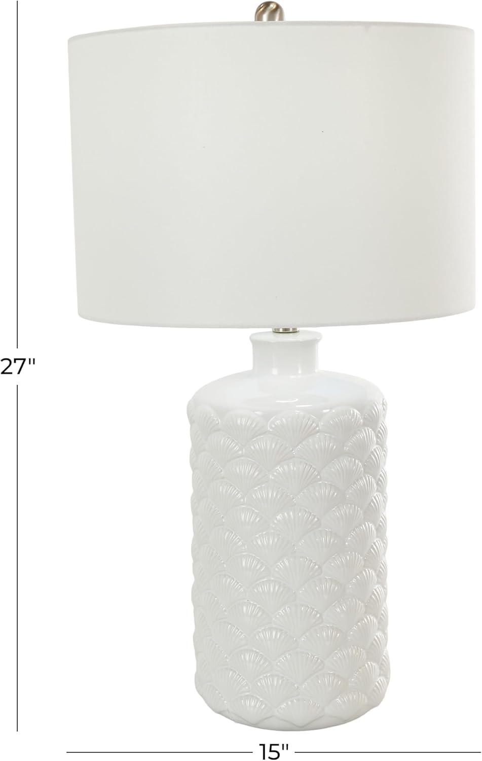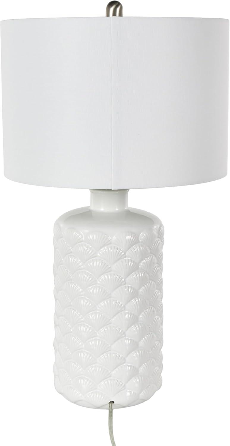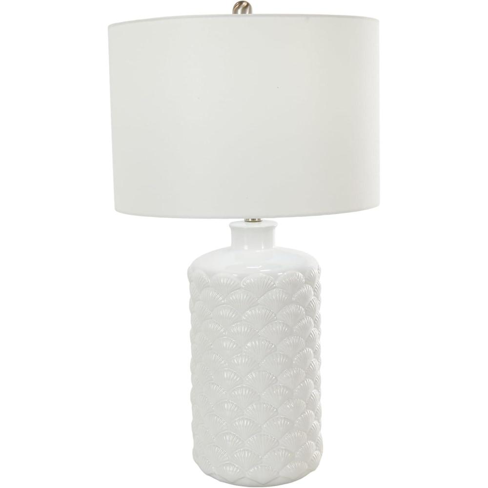 Coastal living room table lamp is masterfully crafted from high-quality ceramic, featuring delicately embedded seashells, and finished with a lustrous white glaze that captures the essence of seaside elegance. The shiny white accent lamp for table has a round shape, drum shade, and embedded shell patterns that complements various decor styles. Wipe clean with a dry cloth. The shell accent lamp is perfect for bringing light to coastal-themed living rooms or bedrooms. Requires 1 60W Type A E26/Medium (Standard) bulb. This item ships in 1 carton. Comes with a 77″ cord length. Suitable for indoor use only. This item ships fully assembled in one piece. Table lamp comes with a white drum shaped shade that measures 15 x 15 x 10 inches. Includes a rotary switch. This is a single white colored accent lamp. Coastal style.