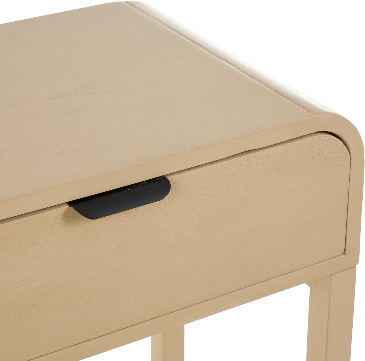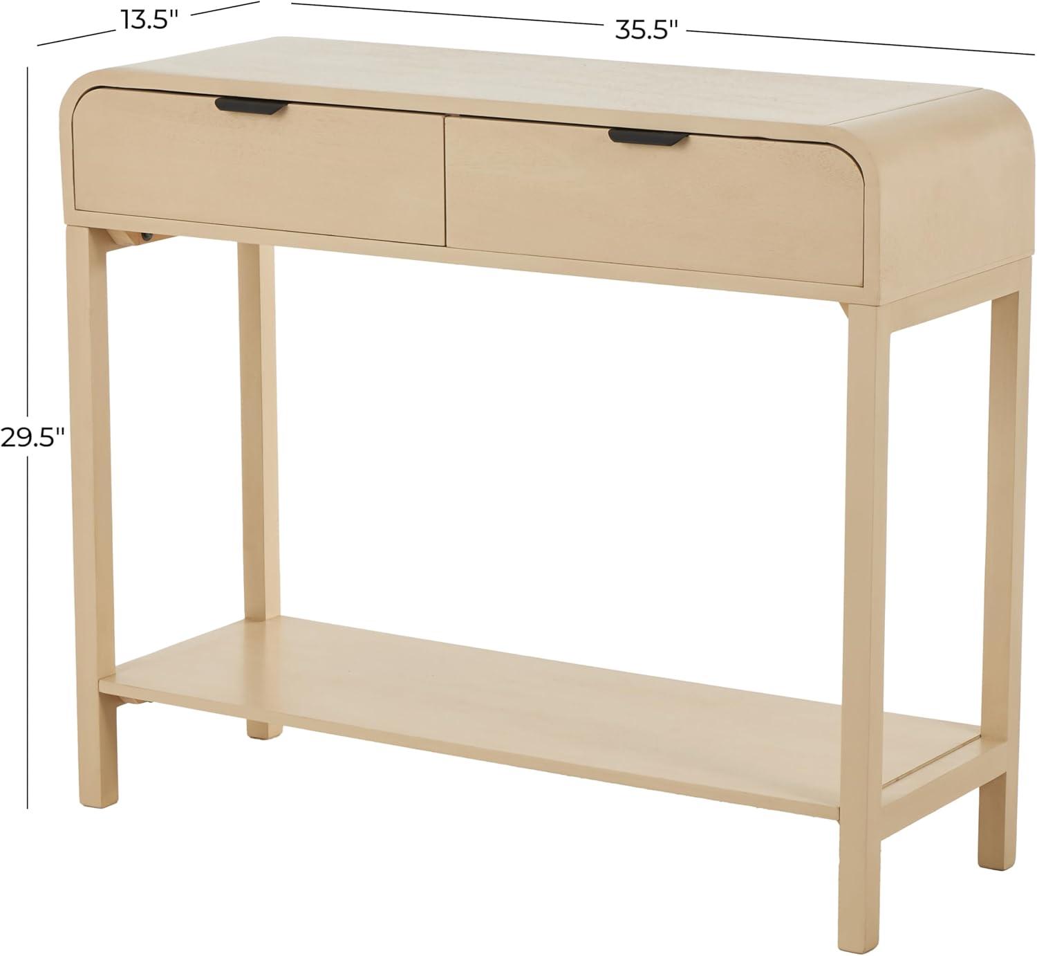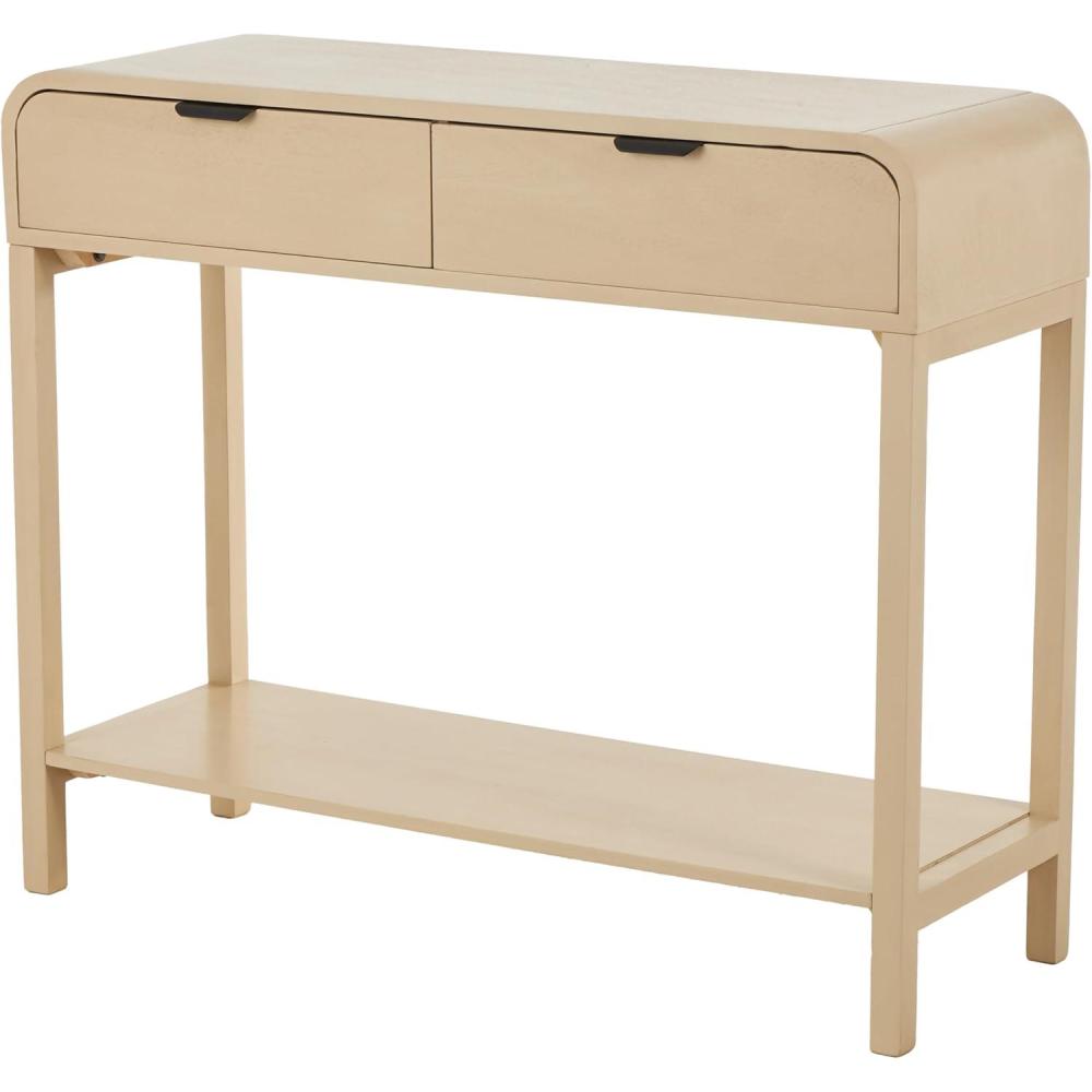 This contemporary home console table is carved from pine wood to create an elegant structure with two drawers, which is painted in beige and furnished with sleek black handles. The brushed beige home table features a rectangular shape with curved edges and handles that enhance its modern appeal. Wipe clean with a dry cloth. This beige table can be placed in the living room or entryway, offering both functionality and elegance. This item ships in 1 carton. Beige console table features 2 drawers with a 15 lbs weight limit, and side wood glides. Due to the handmade nature of this item, no two will be alike, there will be slight differences in shape, size, and color. Suitable for indoor use only. This item ships fully assembled in one piece. Maximum weight limit is 100 lbs. This is a single beige colored kitchen table. Contemporary style.