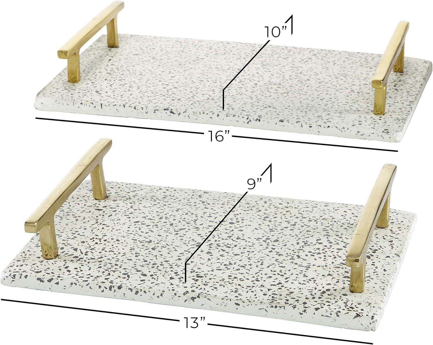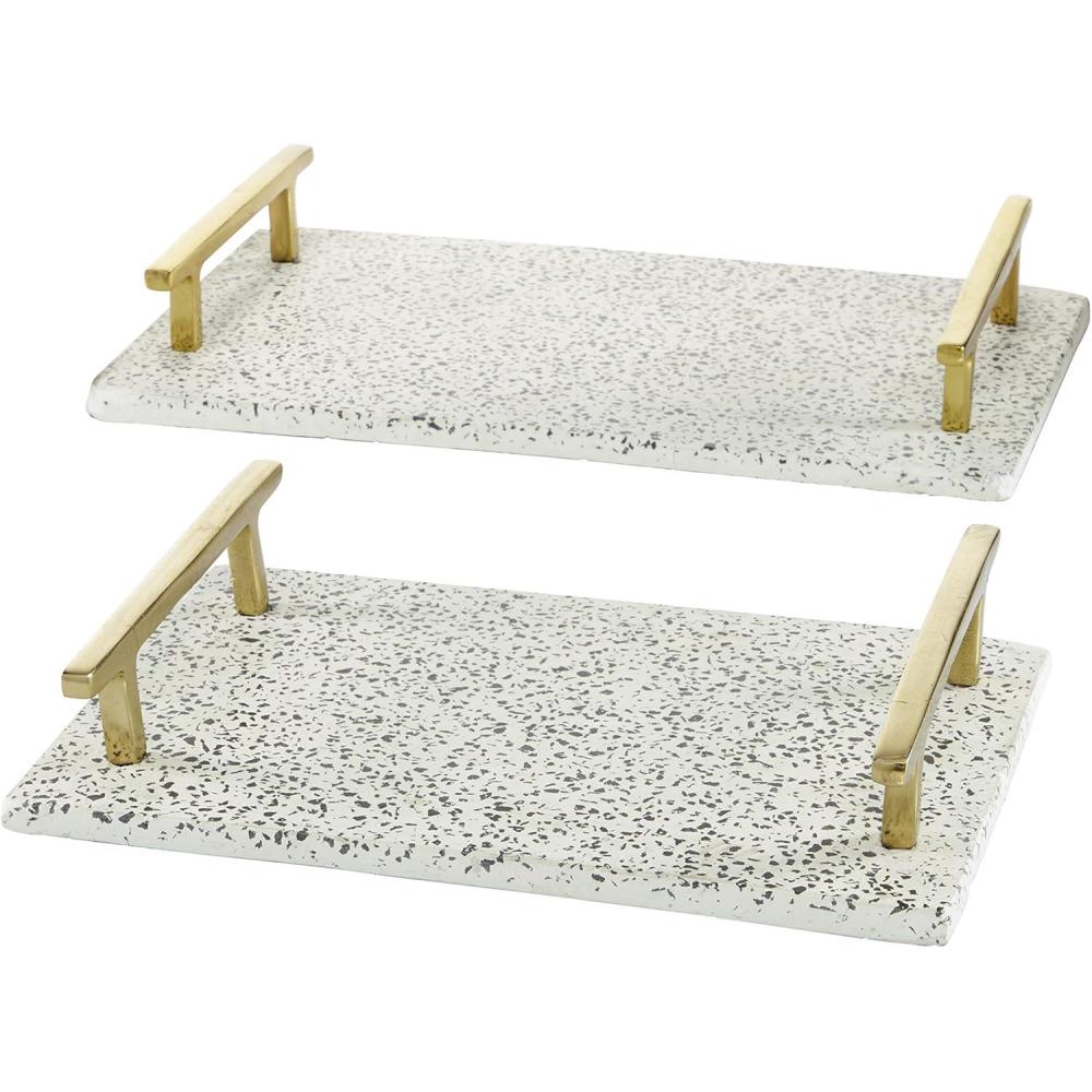 Get organizing and decorating an elegant vibe with these contemporary-themed decorative trays placed on your counters or console tables. Whether in your kitchen, or on your coffee table, it's a great way to display and store your favorite things. A storage piece that is spacious for your trinkets or decorative goods on your mantle, coffee table or kitchen counter. This item comes shipped in one carton. Please note that this item is for decorative purpose use only and are not food safe. Suitable for indoor use only. Made in India. Each set comes with 2 decorative trays. Contemporary theme.
