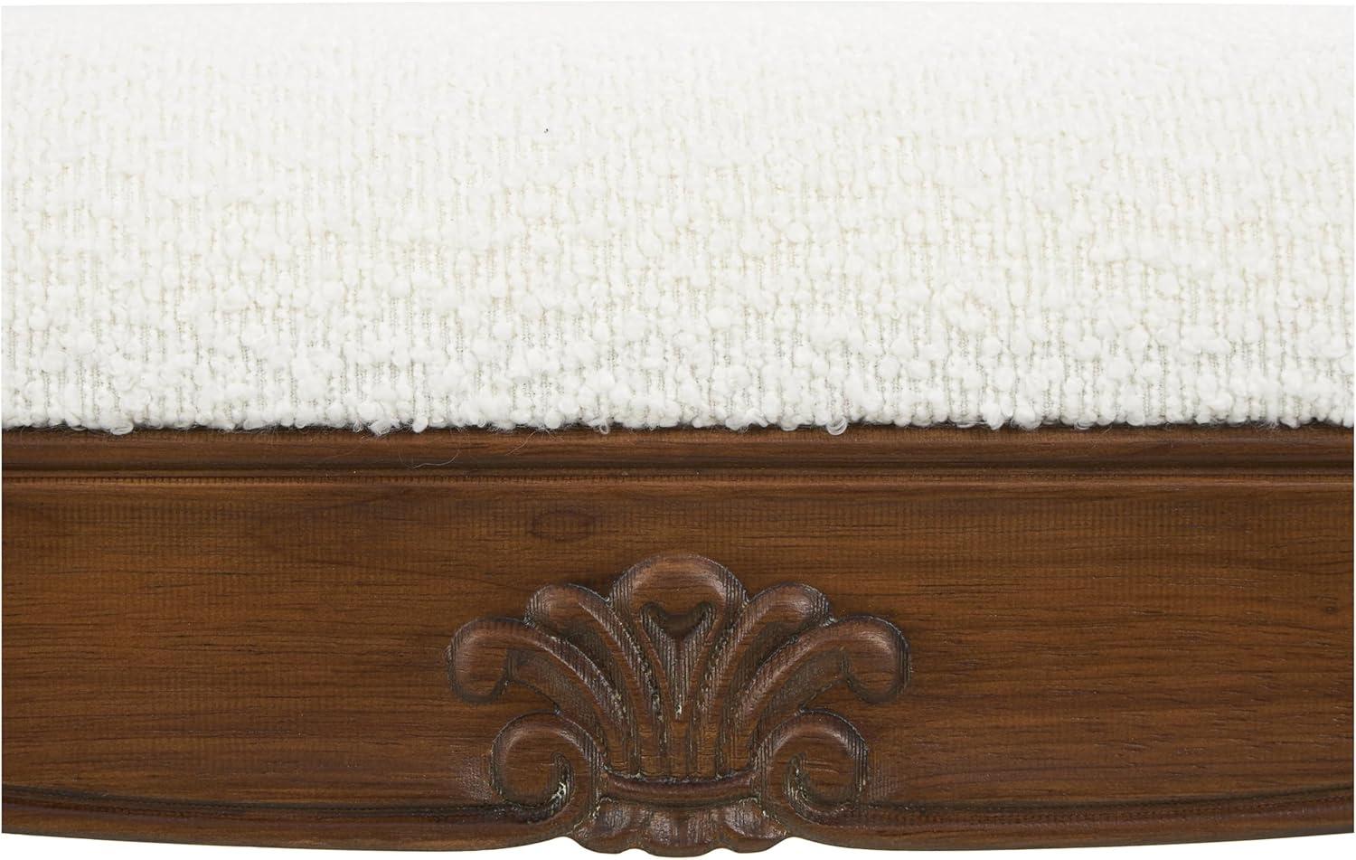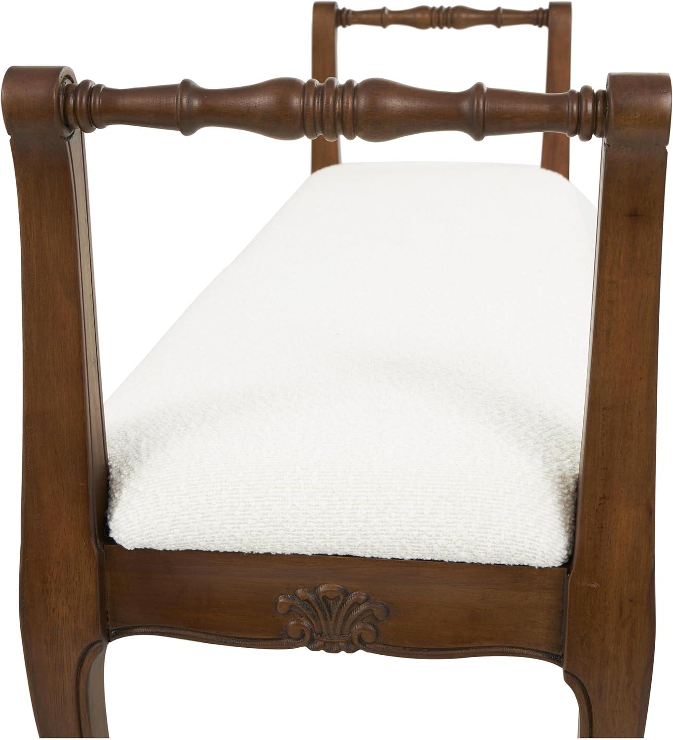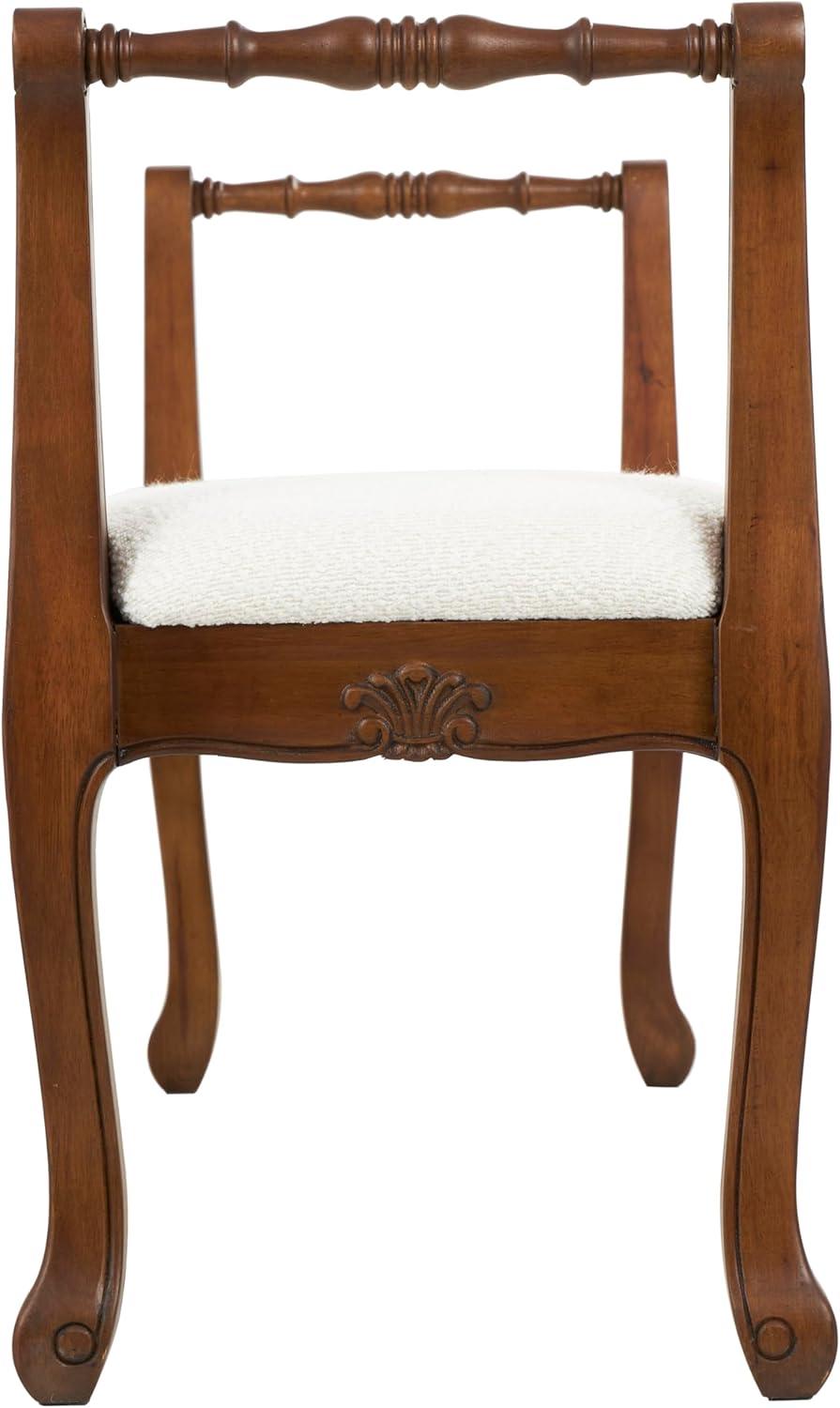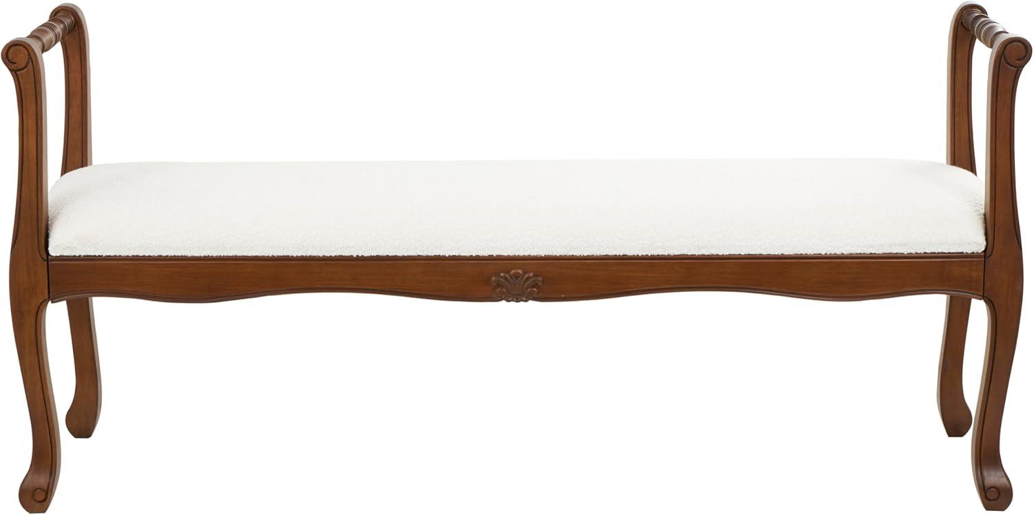The foam material is covered with fabric and attached to the carved wooden frame creating this traditional bench for entryway. The slim rectangular shape fits nicely into any space, while the traditional wood legs and turned wood armrests add a touch of timeless elegance to this varnished cream entry bench. Wipe clean with a dry cloth. Use this cream entryway bench as an accent piece in your living room or bedroom, or place it in an entryway or hallway to provide a beautiful seating option. This item ships in 1 carton. A foam cushion is upholstered with the polyester fabric. Spot clean or have the upholstery professionally cleaned. Suitable for indoor use only. This item ships fully assembled in one piece. Maximum weight limit is 400 lbs. Can accommodate 2 people. This is a single cream colored entryway bench. Traditional style.