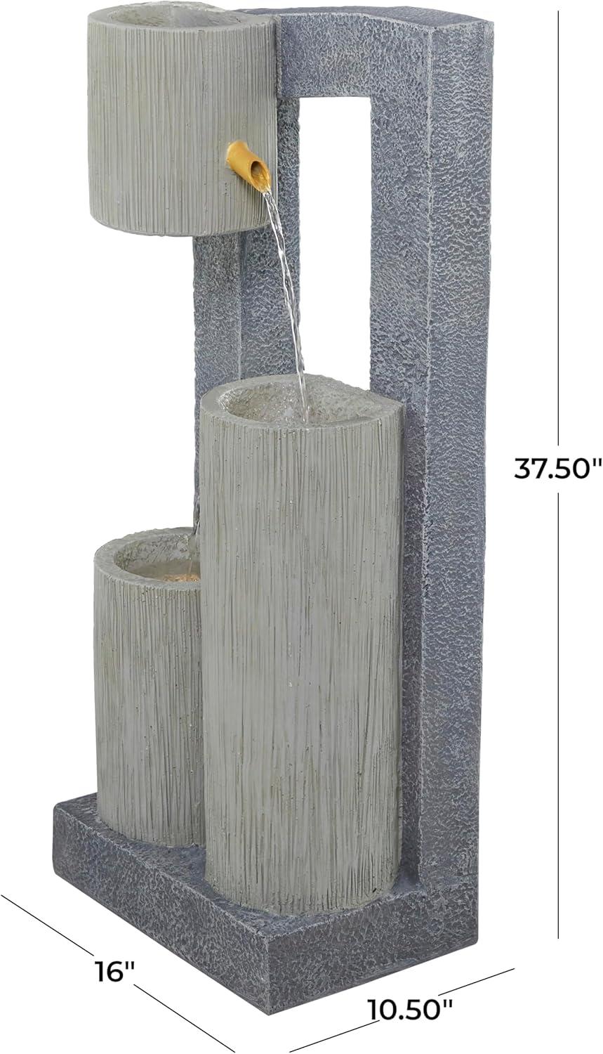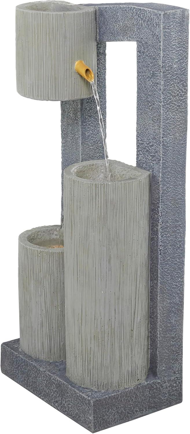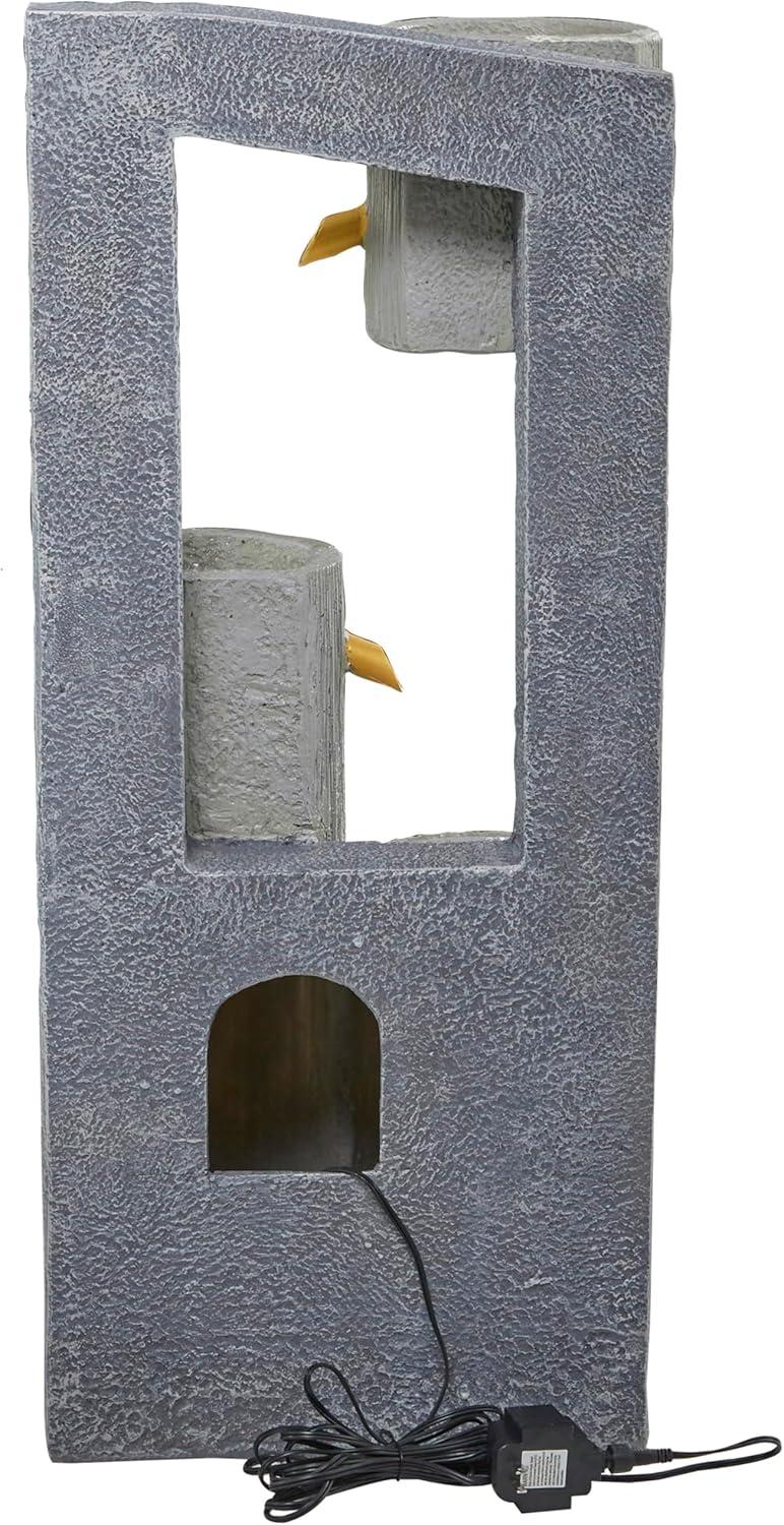 Garden fountain is molded and sculpted from fiberglass to form cylindrical water pots with protruding spouts, which are mounted to the back frame and base of the fountain. Outdoor fountain is designed with a rectangular fountain base with 1 floating water pot and 2 standing cylinder posts on a curved cutout frame, and features spot LED lighting for an added visual aesthetic. Avoid using abrasive cleaning pads or detergents, use a sponge with mild soap and warm water, then rinse with a garden hose. Elevate the style of your outdoor patio with the addition of this easily assembled garden fountain, and decorate its sides with small to large plants for a relaxing escape. This item ships in 1 carton. Outdoor use only. This item ships fully assembled in one piece. This is a single gray colored outdoor floor water fountain. Contemporary style.