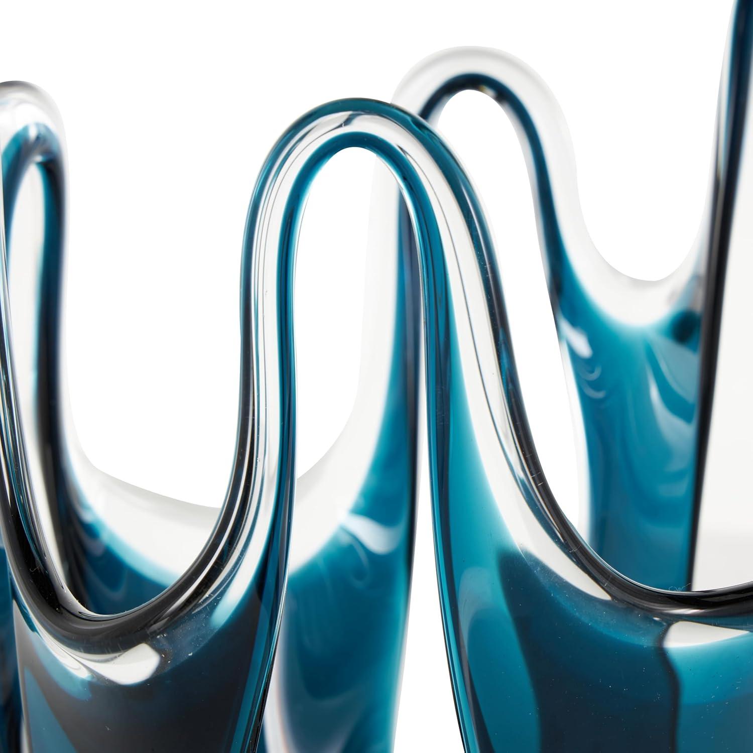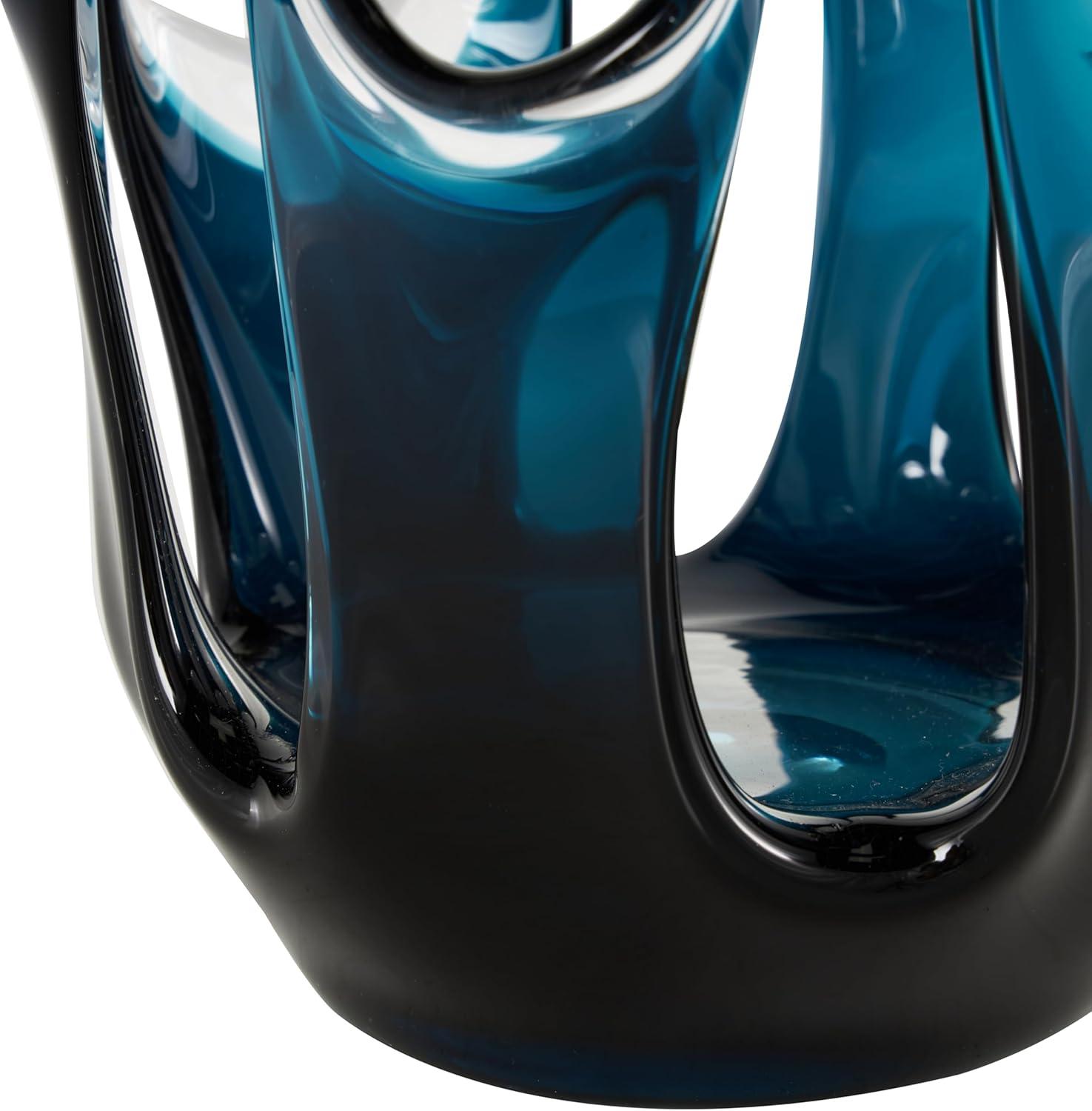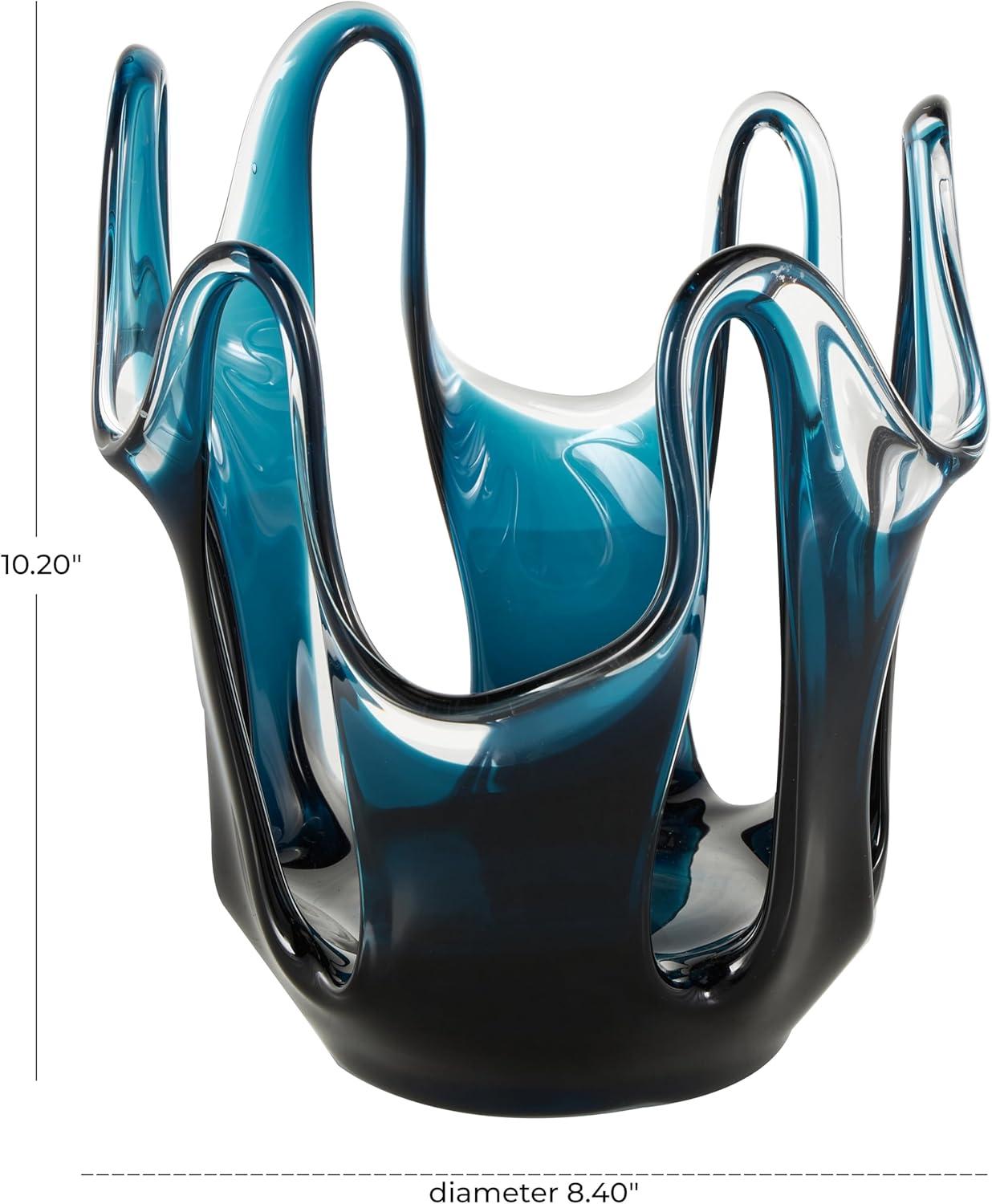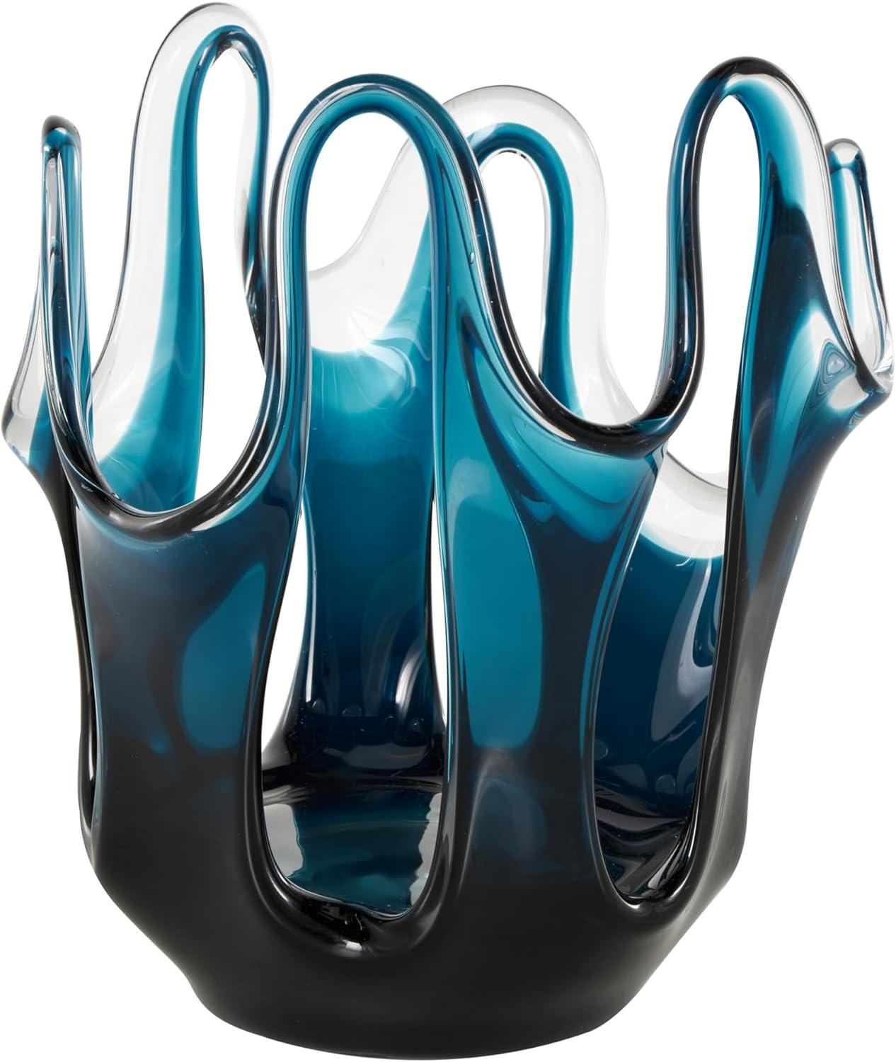Carefully crafted from premium glass materials with perfectly cut wavy oval cutouts and a blue ombre pattern, this eclectic vase for home decor embodies both style and craftsmanship. Polished blue vase for dried flowers has a distinct round shape with wavy oval cutouts and an ombre pattern that enhances its visual appeal. Wipe clean with a dry cloth. Perfect for living rooms or dining areas, this abstract centerpiece vase serves as a stunning focal point. Designed with felt or rubber stoppers at the base that prevent scratching furniture and table tops, as well as sliding around. This item ships in 1 carton. Suitable for indoor use only. This item ships fully assembled in one piece. This is a single blue colored vase. Eclectic style. Vase has a 8 in mouth opening.