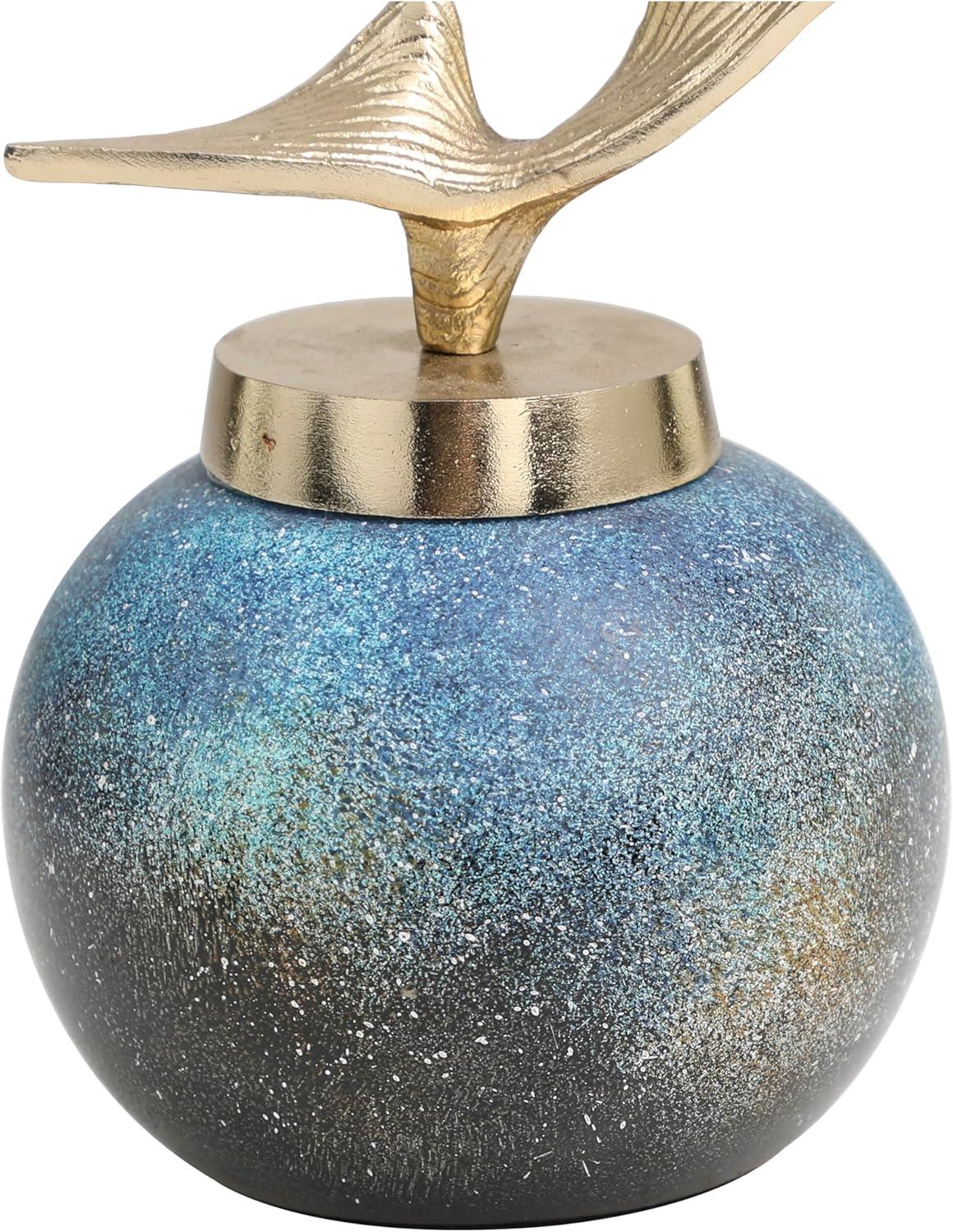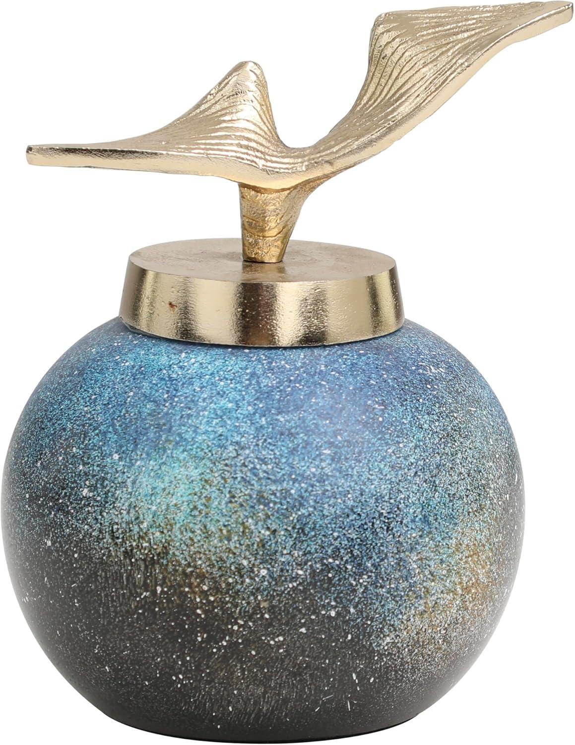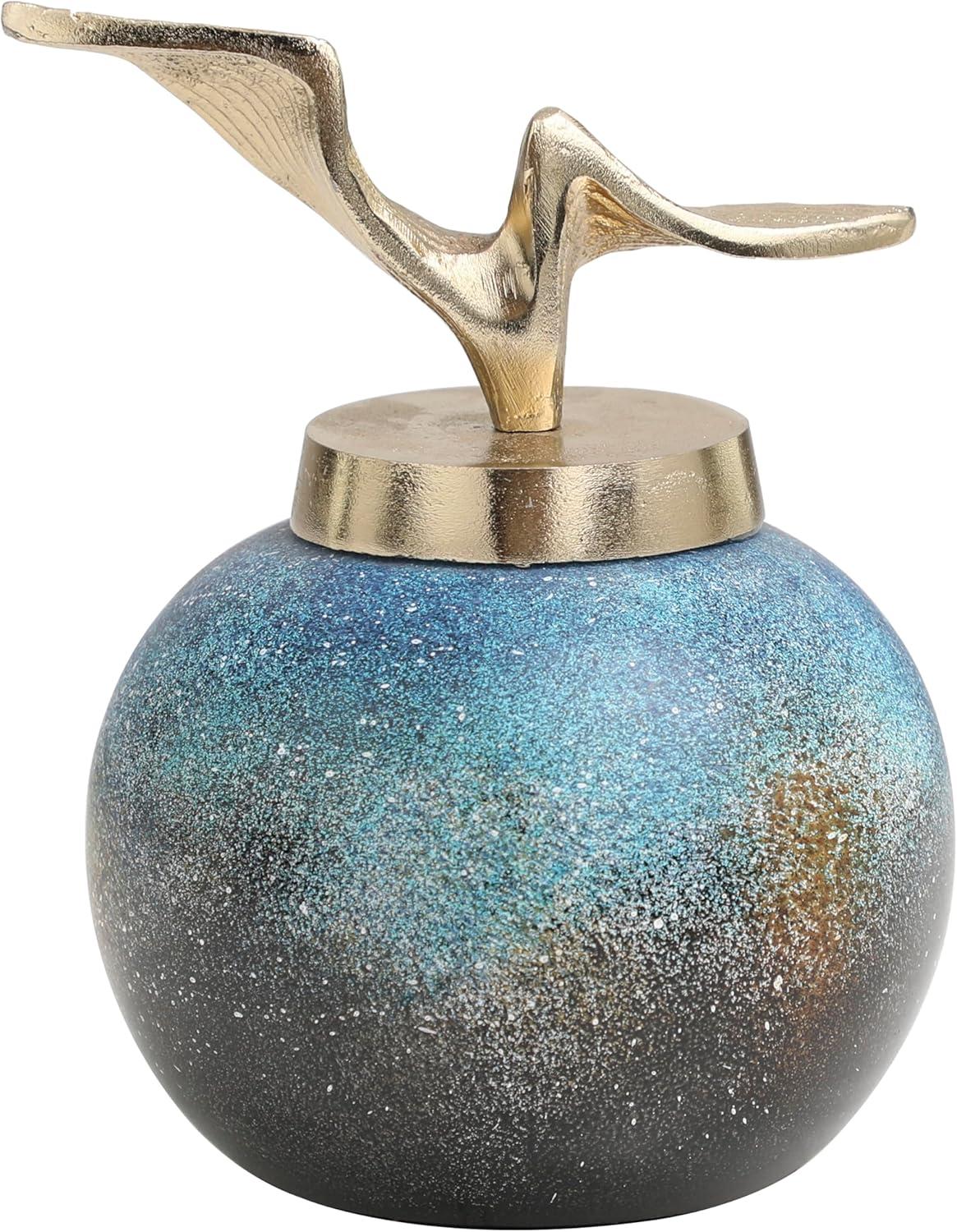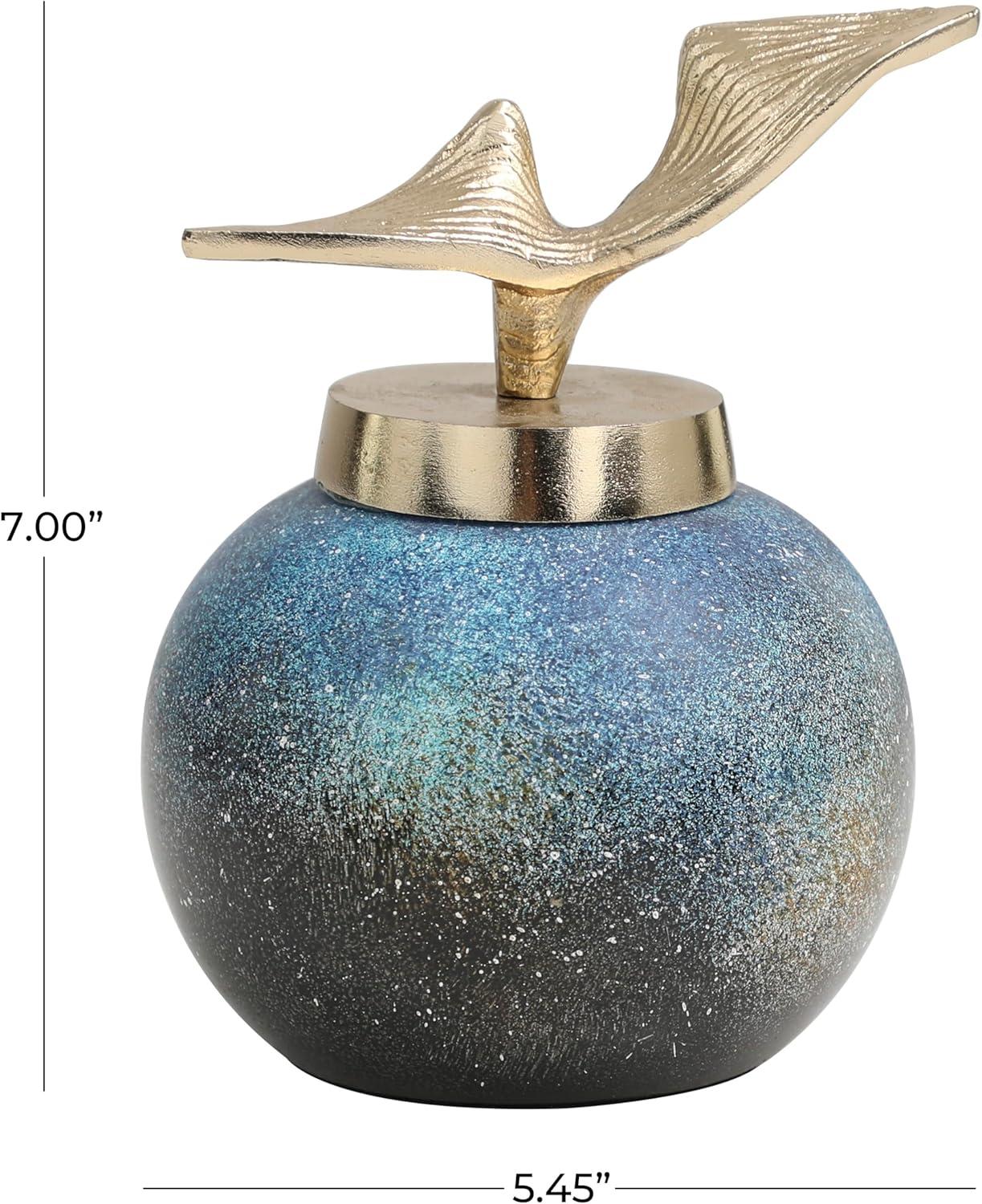 Accessorize your space effortlessly by displaying a beautiful floral arrangement or greenery with this decorative vase. Create a balanced surface space and added dimension with this beautifully crafted vase. Place this small multicolored jar on any accent table, bookshelf, or mantle to fill empty spaces and add a hint of color. Designed with felt or rubber stoppers at the base that prevent scratching furniture and table tops, as well as sliding around. This item ships in 1 carton. Please note that this item is for decorative purposes only and is not food safe. Glass decorative jars make a great gift for any occasion. Suitable for indoor use only. This item ships fully assembled in one piece. Made in India. This is a single blue colored decorative containers. Contemporary style. Vase has a 0 in mouth opening.