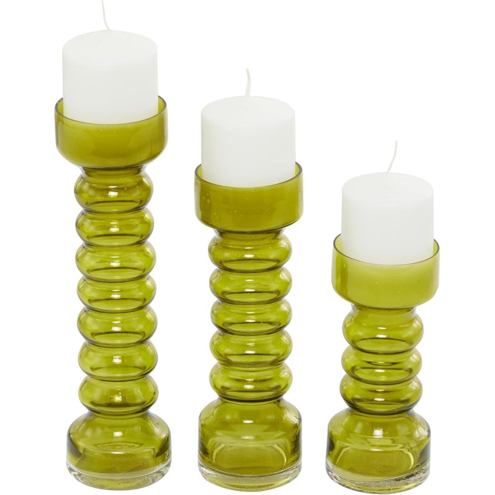 This modern set of 3 candle holders for home decor consists of glass bodies molded into a unique shape. Tinted green candle holders for centerpiece carry bubble-shaped silhouettes with deep sockets and slightly elevated bases, adding an artistic touch to any setting. Wipe clean with a dry cloth. Display this green set of 3 candle stands as a set or as individual decor pieces to complement your console table and simplistic vases in your modern living room space. Designed with felt or rubber stoppers at the base that prevent scratching furniture and table tops, as well as sliding around. Can hold 3 pillar candles, not included. This item ships in 1 carton. Glass candle holder makes a great gift for any occasion. Suitable for indoor use only. This item ships fully assembled in one piece. Made in India. This green colored glass candle stand comes as a set of 3. Modern style.