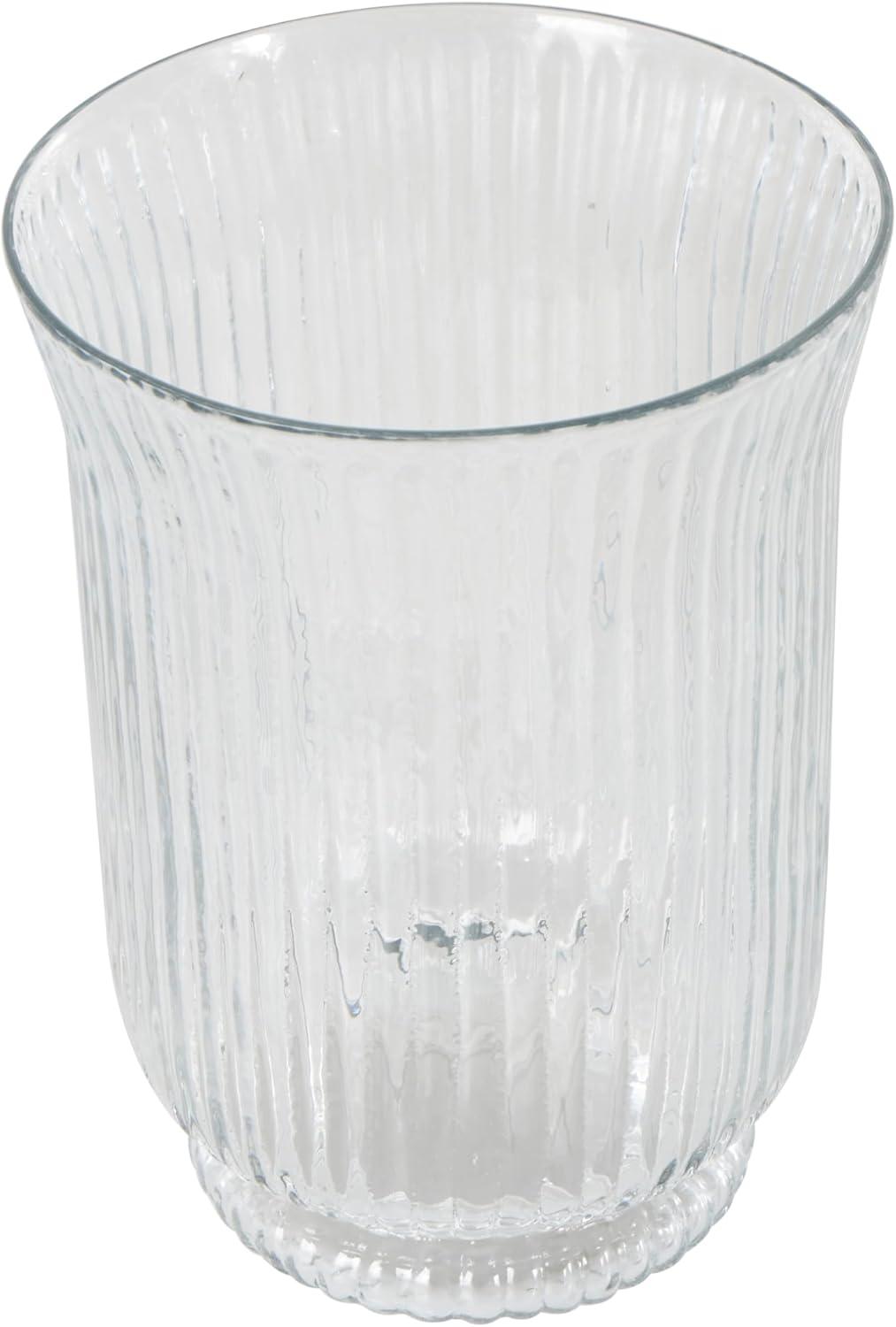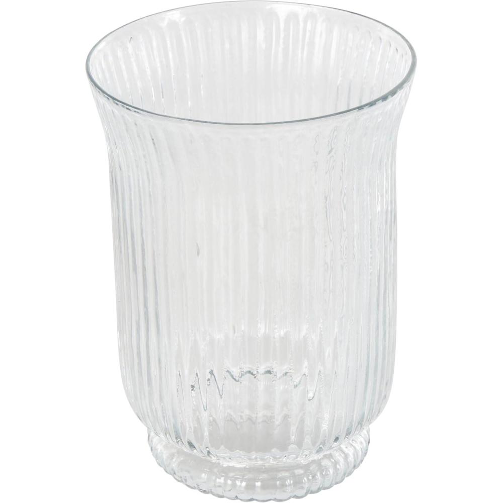 This modern candle holder for home decor has been molded from blow glass with ribbed body, showcasing its fine craftsmanship. With its round shape, these polished clear candle holders for centerpiece adds a touch of elegance to any space it graces. Wipe clean with a dry cloth. This clear candle stand is versatile enough to enhance any room's decor, be it your living room, dining area, or bedroom. Designed with felt or rubber stoppers at the base that prevent scratching furniture and table tops, as well as sliding around. Can hold 1 pillar candle, not included. This item ships in 1 carton. Suitable for indoor use only. This item ships fully assembled in one piece. Made in India. This is a single clear colored candle stand. Modern style. Vase has a 5.50 in mouth opening.