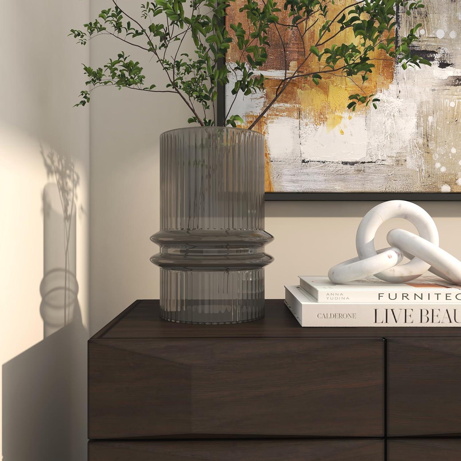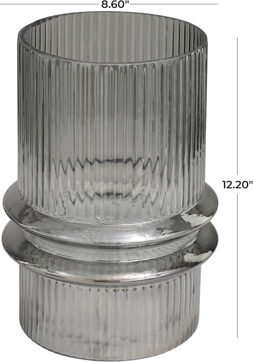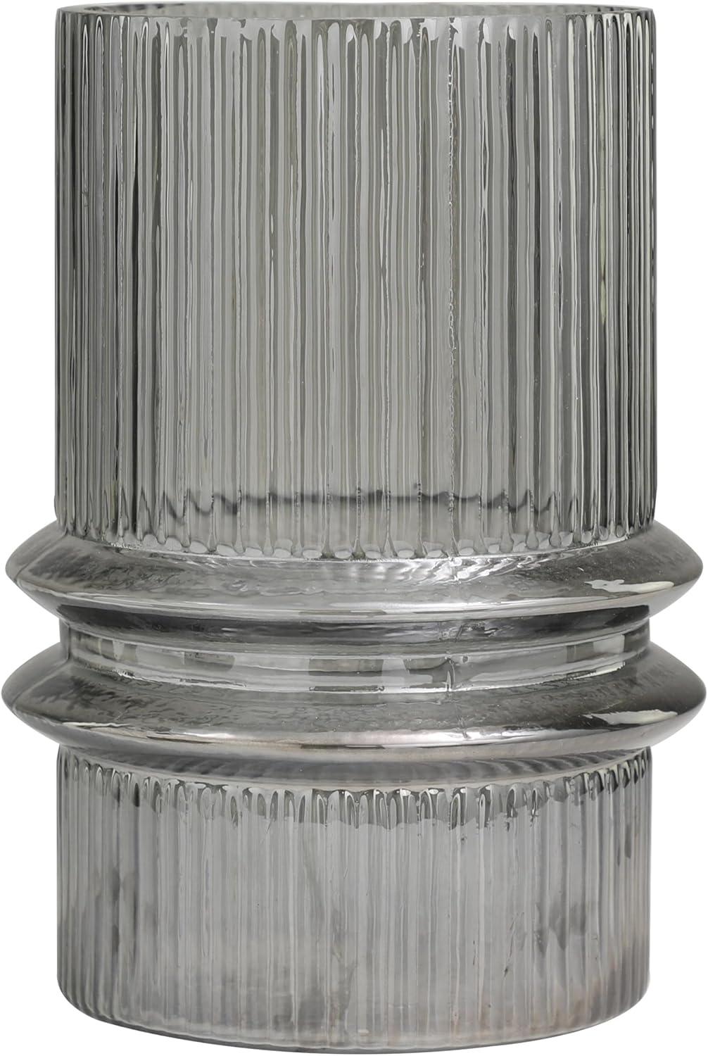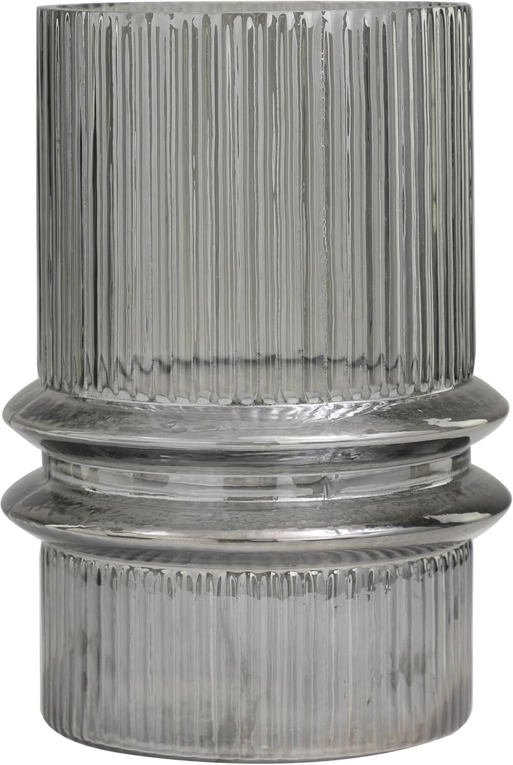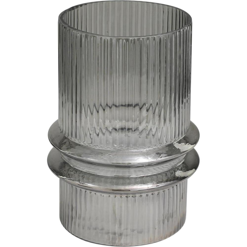 Glass is molded to form a textured wide shape with a flared center, and then colored with a gray hue to create the classy design. Gray smoked candle holder accentuates a wide cylinder form with a fluted center and intricate ribbed detailing throughout. Wipe clean with a dry cloth. Accessorize your space effortlessly by displaying a beautiful floral arrangement or greenery with this decorative candle holder. Create a balanced surface space and added dimension with this beautifully crafted candle holder. Appreciate the design as an accent piece on a console table or mantle, add a candle to create a warm atmosphere, or enhance the look with fresh floral or green stems for added depth and beauty. Designed with felt or rubber stoppers at the base that prevent scratching furniture and table tops, as well as sliding around. Can hold 1 pillar candle, not included. This item ships in 1 carton. Glass candle holder makes a great gift for any occasion. Suitable for indoor use only. This item ships fully assembled in one piece. Made in India. This is a single gray colored hurricane candle holder. Modern style. Vase has a 6.70 in mouth opening.