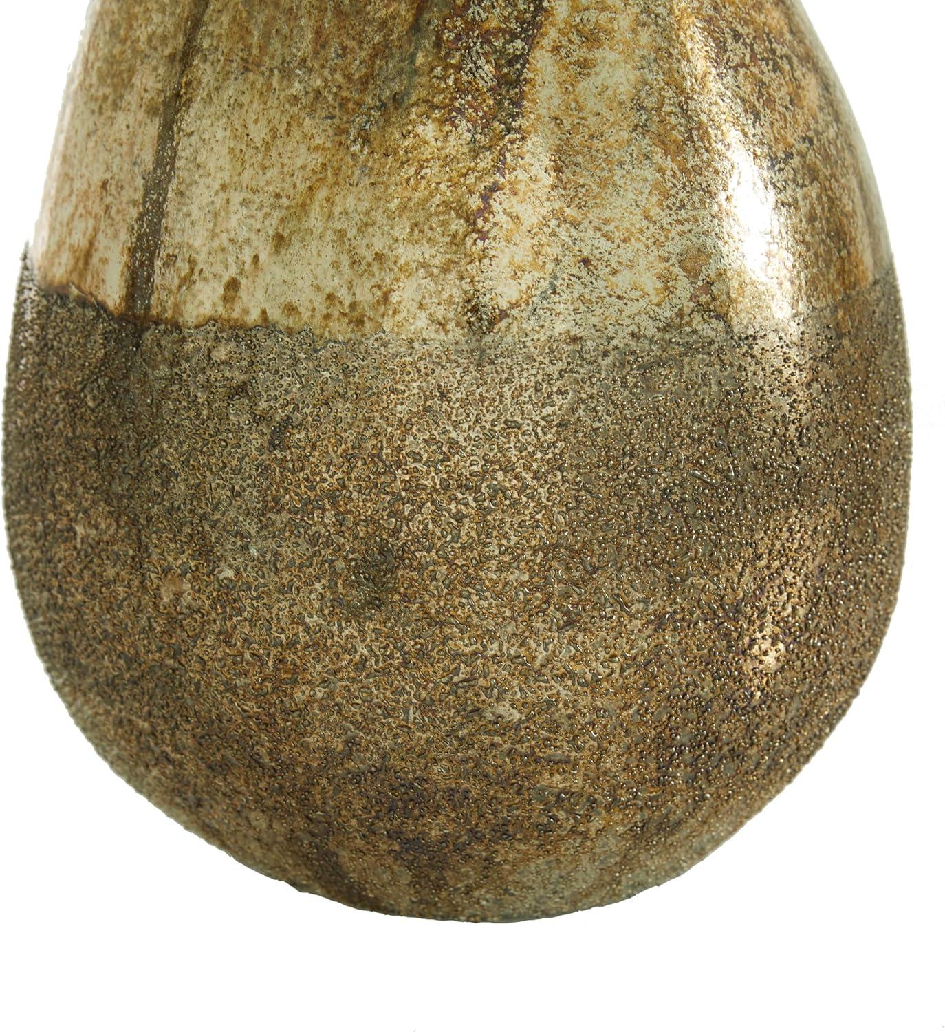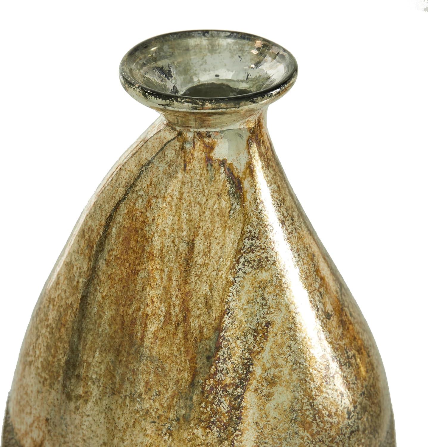 Glass is molded to form small, rounded vases and colored with a gray hue to create a classy shape and design, showcasing the craftsmanship behind this rustic set of 2 vases for home decor. The polished gold vases for faux flowers have a teardrop form with a narrow neck and gradual bubble style texturing at the base. Wipe clean with a dry cloth. The gold set of 2 centerpiece vases can be placed in living rooms and dining areas to create a modern rustic feel while adding elegance to the space. This item ships in 1 carton. Glaze design creates two interior surface textures. Suitable for indoor use only. This item ships fully assembled in one piece. Made in India. This gold colored glass vase comes as a set of 2. Rustic style. Vases have 1.50 in, and 1 in mouth openings.