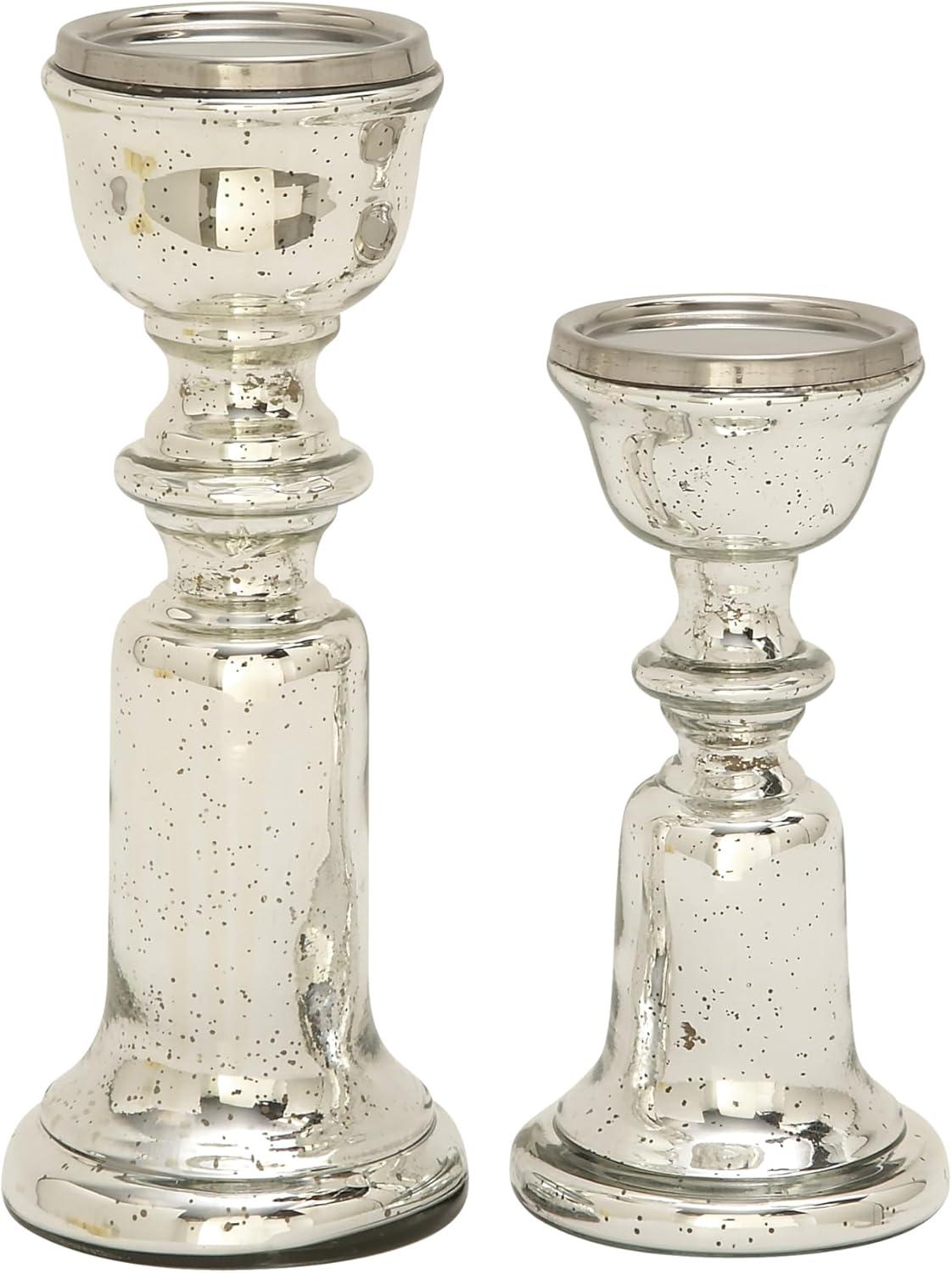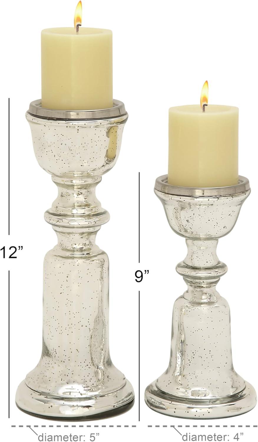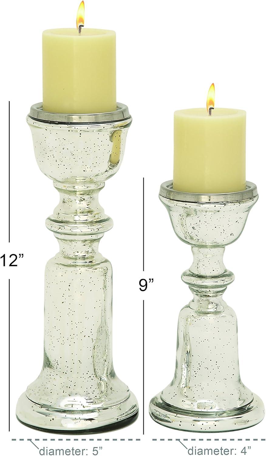 Deco 79 Glass Handmade Decorative Candle Holder Turned Style Pillar Candle Stand, Set of 2 Candlestick Holder 9", 12"H, Silver(Silver)