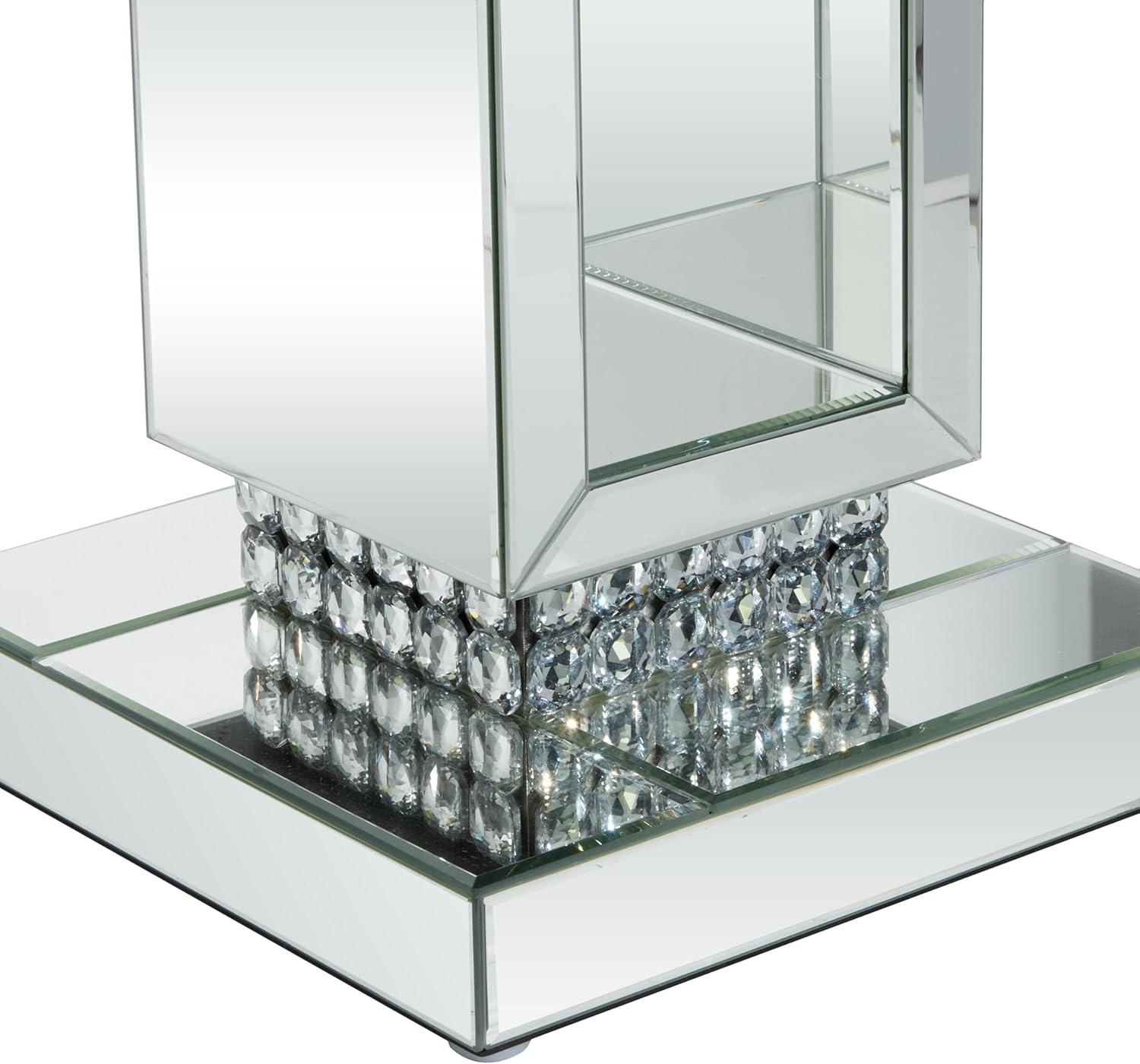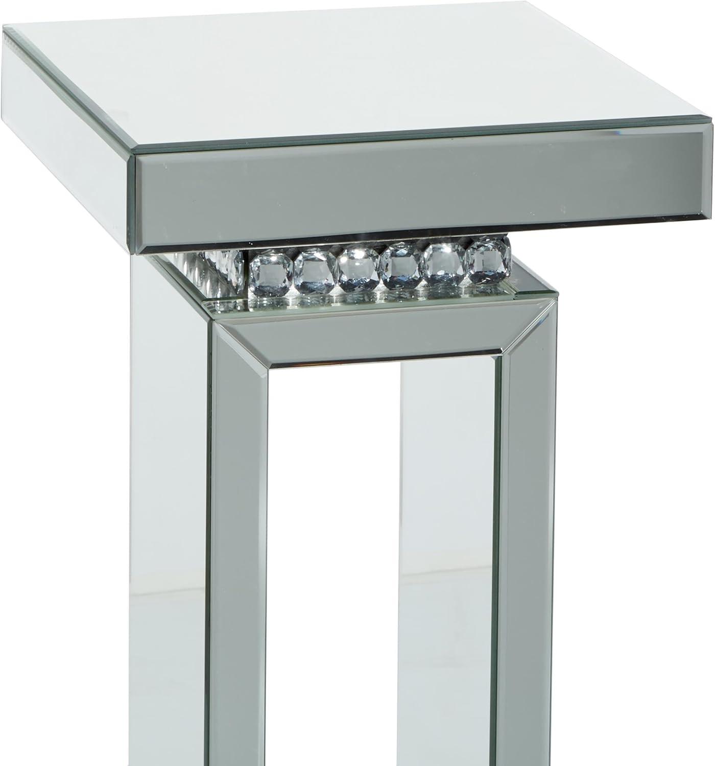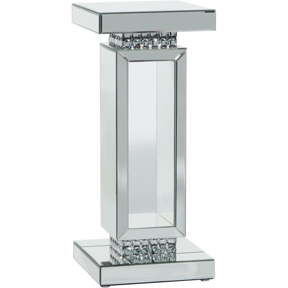 The round crystal bead embellishments are securely attached to the corners of this pedestal glass table. Wood and mirror side table features a square shape top and base with pedestal style frame and crystal accent embellishments. Wipe clean with a dry cloth. A practical yet stylish upgrade that instantly elevate the look of your room. Display your plants, decor or your favorite art piece on this beautifully crafted pedestal table. This wood and glass accent table is sure to make a bold statement in your lobby, living room, or home office. Designed with felt or rubber stoppers at the base that prevent scratching furniture and table tops, as well as sliding around. This item ships in 1 carton. Suitable for indoor use only. This item ships fully assembled in one piece. Maximum weight limit is 25 lbs. This is a single silver colored drink table. Glam style.