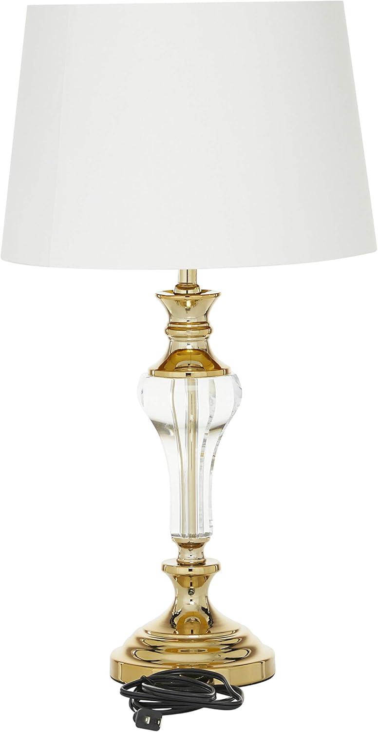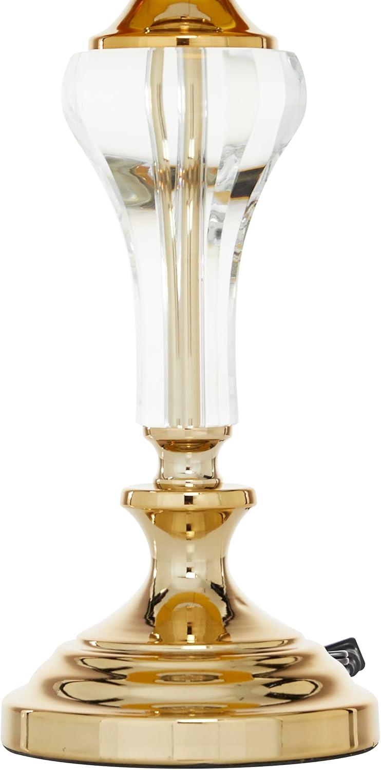 The glam living room table lamp is crafted with metal accents mounted onto its curved glass body, showcasing attention to detail. With its rounded and tapered crystal and metal body, combined with the drum shade, this polished gold accent lamp for table embodies stylish design. Wipe clean with a dry cloth. This gold accent lamp looks stunning on an end table or desk where it can provide beautiful accent lighting. Requires 1 60W Type A E26/Medium (Standard) bulb. This item ships in 1 carton. Comes with a 63″ cord length. Features a metallic copper shade interior for a warm diffused glow. Suitable for indoor use only. This item ships fully assembled in one piece. Table lamp comes with a white drum shaped shade that measures 15 x 15 x 10 inches. Includes a on/off switch. This is a single gold colored accent lamp. Glam style.