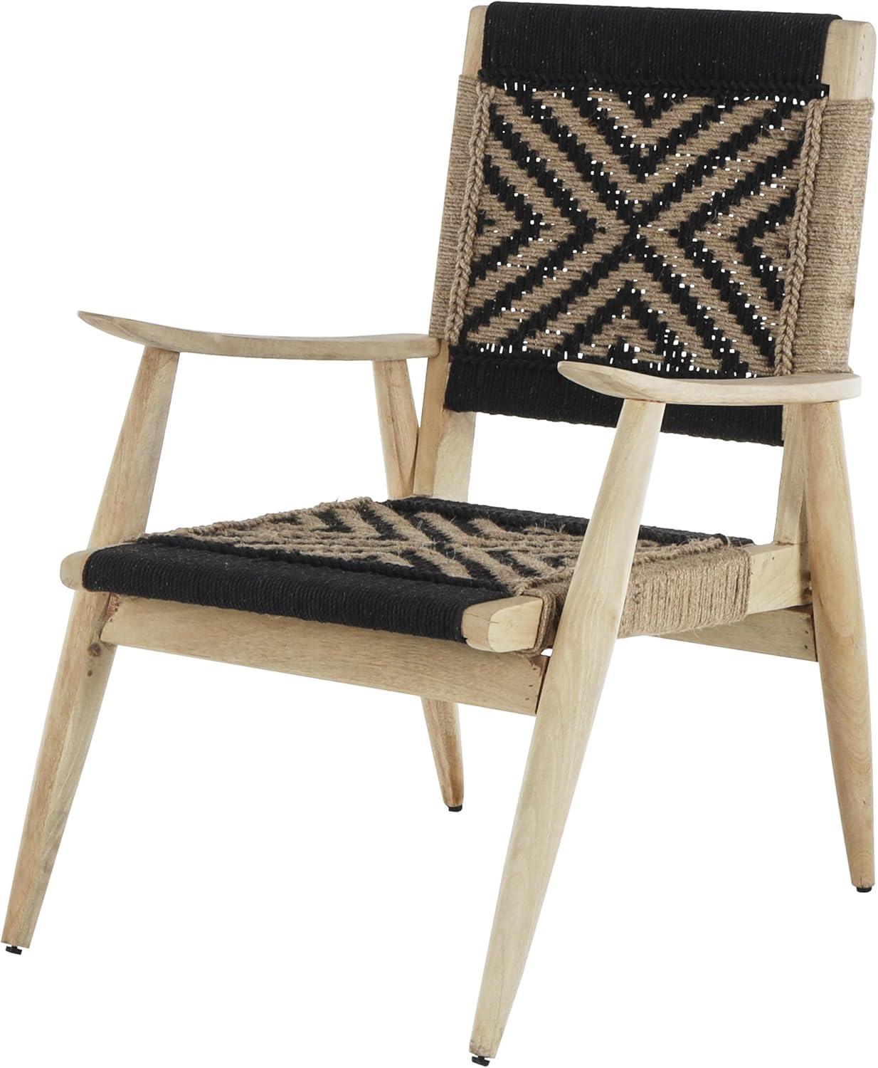 The traditional small space accent chair is constructed with carved mango wood frame where the woven rope seat is attached. The textured black living room chair's features a square shape and chevron pattern, adding a modern yet traditional appeal. Wipe clean with a dry cloth. The black side chair can be used as both a functional seating option and a stylish décor piece in your living room or study. This item ships in 1 carton. Due to the handmade nature of this item, no two will be alike, there will be slight differences in shape, size, and color. Suitable for indoor use only. This item ships fully assembled in one piece. Maximum weight limit is 200 lbs. Made in India. Can accommodate 1 person. This is a single black colored side chair. Traditional style.