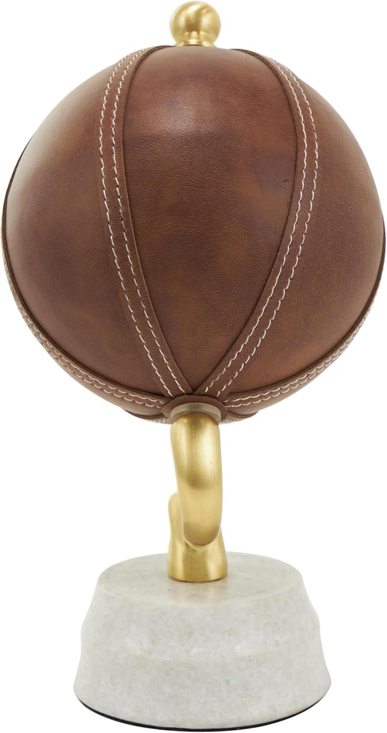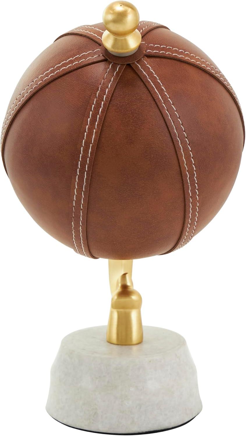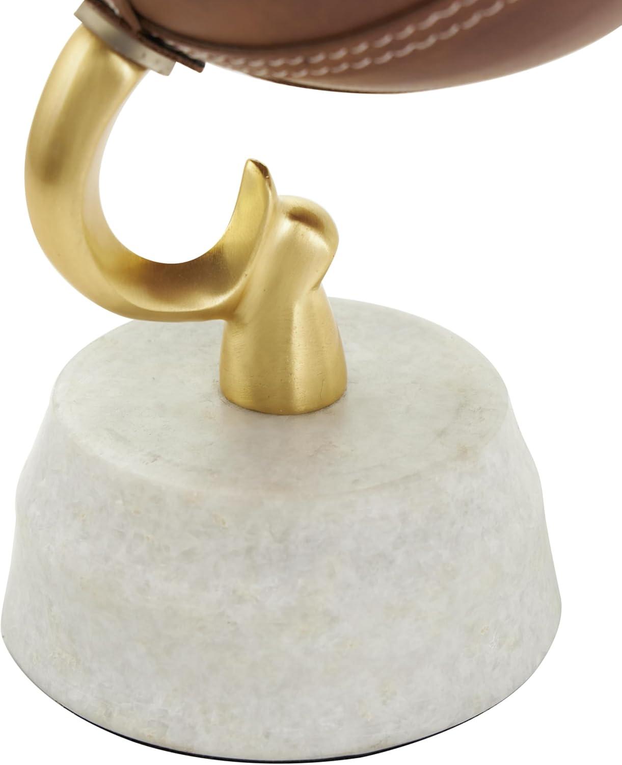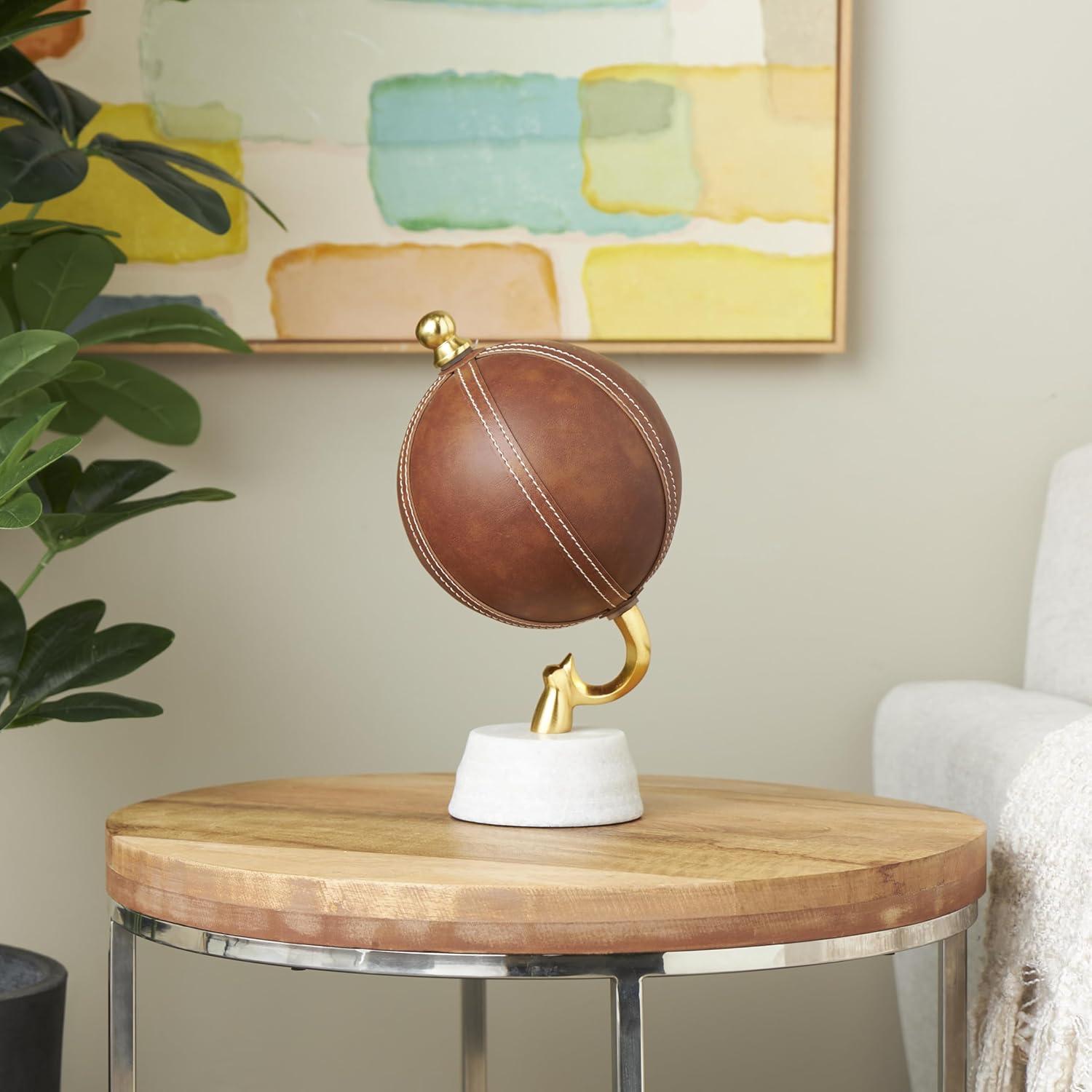 BROWN AND WHITE GLOBE ON A STAND: The round leather globe features a rich brown color with a smooth finish, gold stand, and white marble base, adding warmth and sophistication to your decor