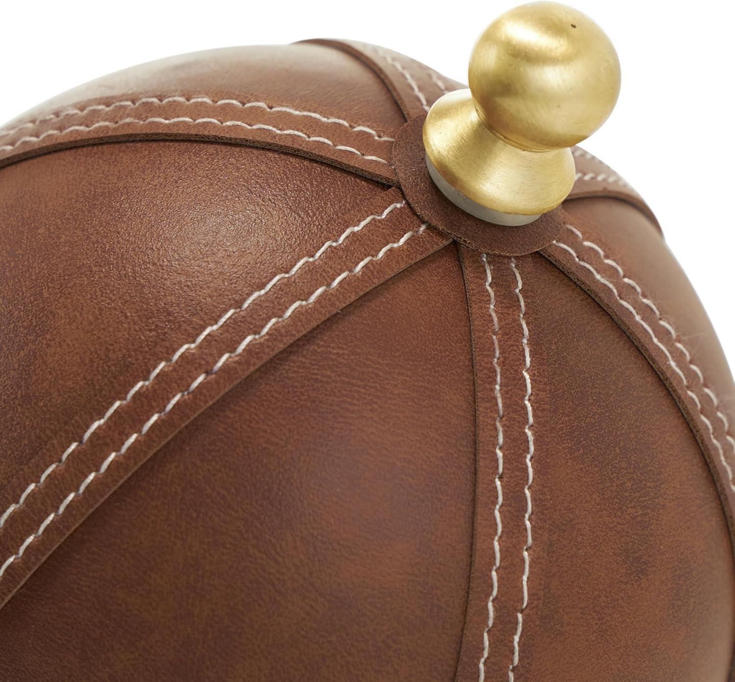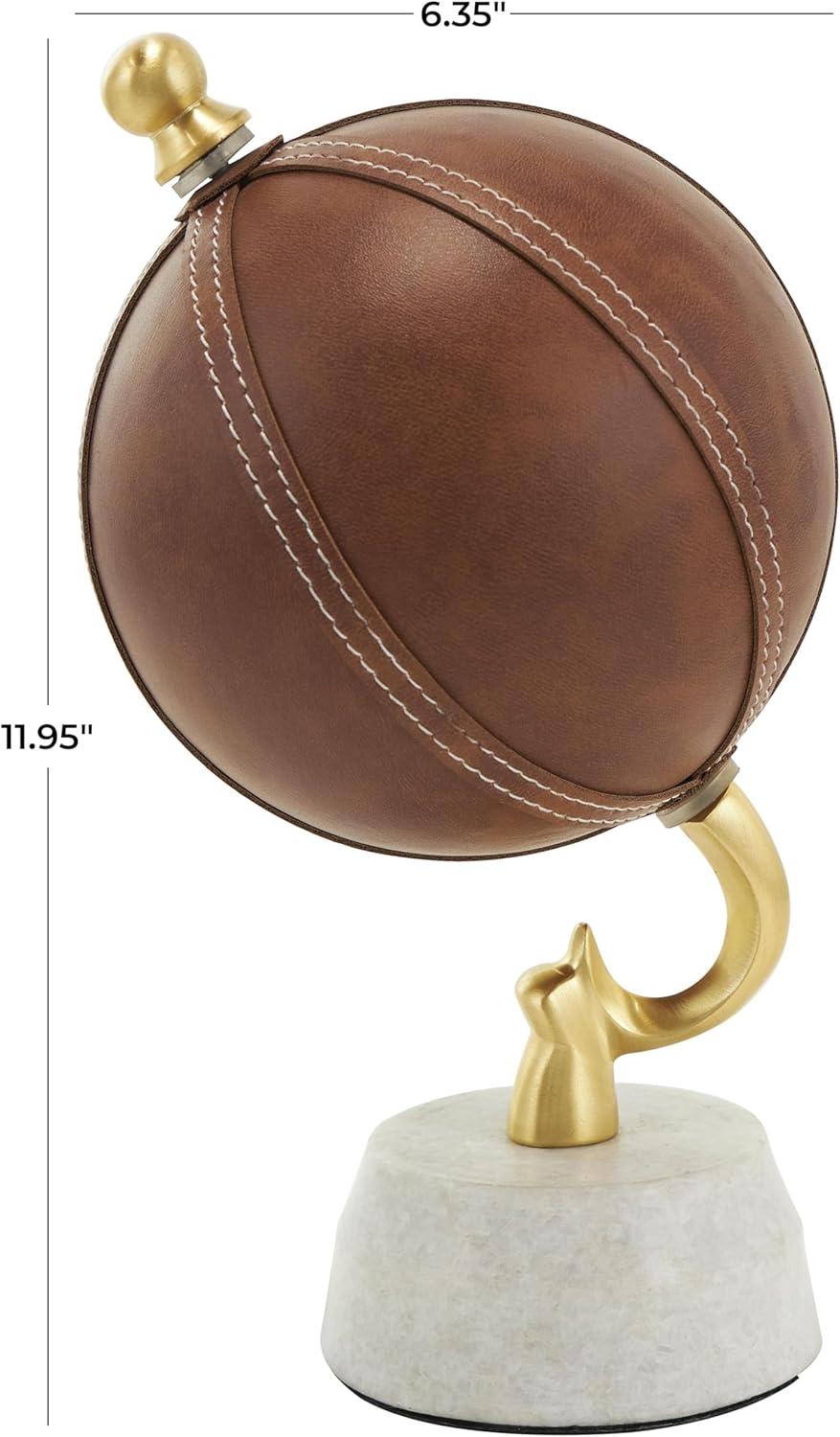 Contemporary decorative globe for living room is meticulously crafted with precise stitching on welded aluminum and elegantly mounted on a molded marble base. Smooth brown globe on a stand offers a classic round shape resembling Earth's form, round finial, curved stand, and cone-shaped base for added charm. Wipe clean with a dry cloth. Style this globe on a desk, bookshelf, or as a centerpiece, adding an element of exploration and worldly charm to your space. Designed with felt or rubber stoppers at the base that prevent scratching furniture and table tops, as well as sliding around. This item ships in 1 carton. Leather globe makes a great gift for any occasion. Table top globe measures 6in diameter. Due to the handmade nature of this item, no two will be alike, there will be slight differences in shape, size, and color. Suitable for indoor use only. This item ships fully assembled in one piece. Leather and hair on hide are natural products, and therefore no two will be alike. There may slight variations in pattern, natural blemishes, colors, and overall aesthetic of the product. Marble is a product of nature and no two pieces are exactly alike. It is prone to variations in color and/or patterns in the material that add to the beauty and charm of the piece.. Made in India. This is a single brown colored decorative world globe. Contemporary style.
