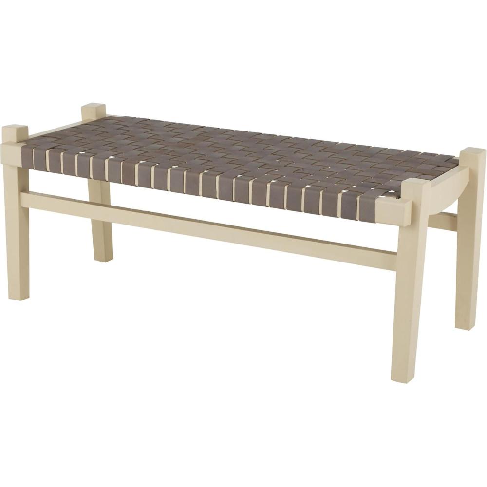 This contemporary bench for entryway is meticulously crafted, with a sturdy wood base woven with brown leather. Matte brown entry bench showcases a modern rectangular shape with a woven leather seat in a grid pattern. Wipe clean with a dry cloth. This brown entryway bench is perfect for enhancing any hallway or foyer space. This item ships in 1 carton. Due to the handmade nature of this item, no two will be alike, there will be slight differences in shape, size, and color. Suitable for indoor use only. This item ships fully assembled in one piece. Leather and hair on hide are natural products, and therefore no two will be alike. There may slight variations in pattern, natural blemishes, colors, and overall aesthetic of the product. Maximum weight limit is 250 lbs. Made in India. Can accommodate 2 people. This is a single brown colored entryway bench. Contemporary style.