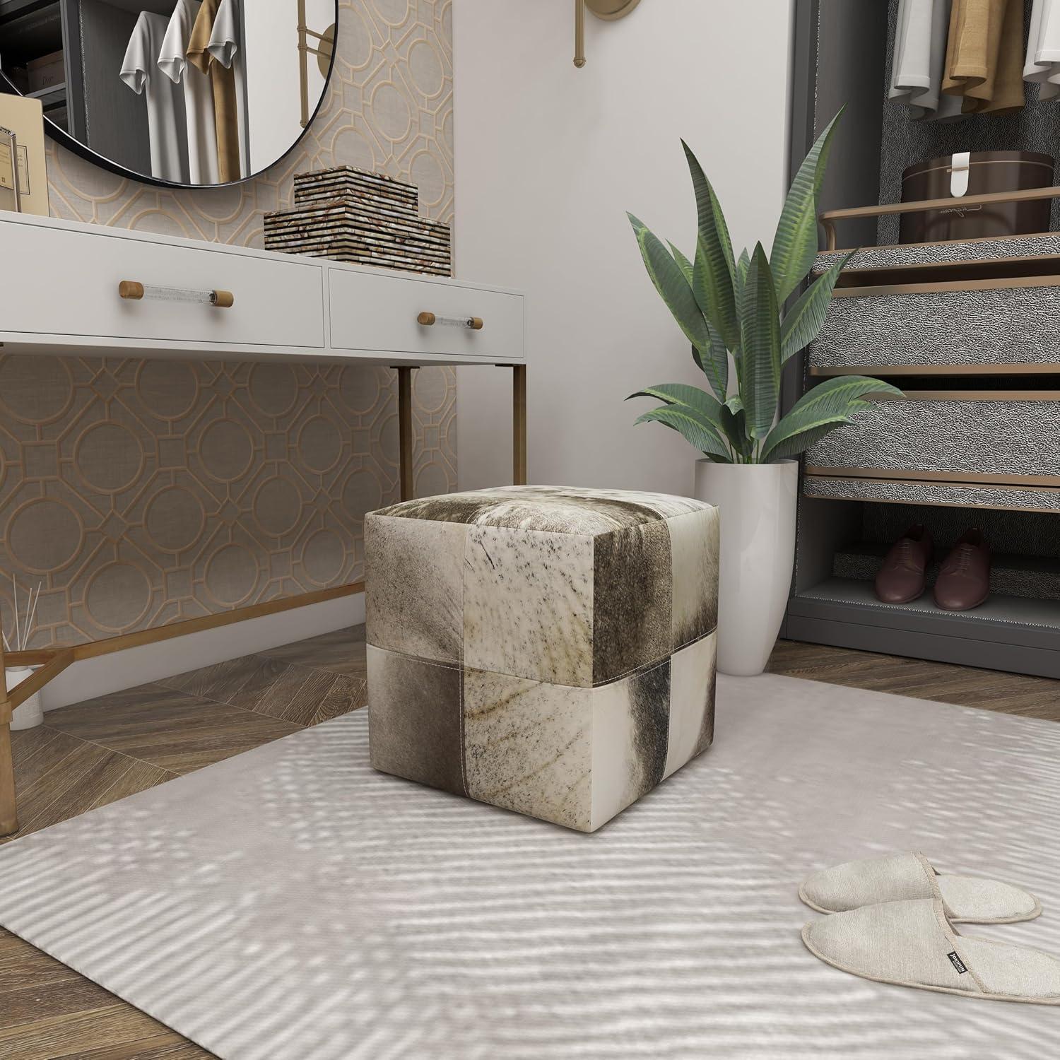 Cube leather accent stool will complement an upholstered velvet sofa with light colored pillows for a luxurious appeal. This item ships in 1 carton. Due to the handmade nature of this item, no two will be alike, there will be slight differences in shape, size, and color. Suitable for indoor use only. Leather and hair on hide are natural products, and therefore no two will be alike. There may slight variations in pattern, natural blemishes, colors, and overall aesthetic of the product. Maximum weight limit is 200 lbs. Made in India. This is a single stool. Contemporary style.