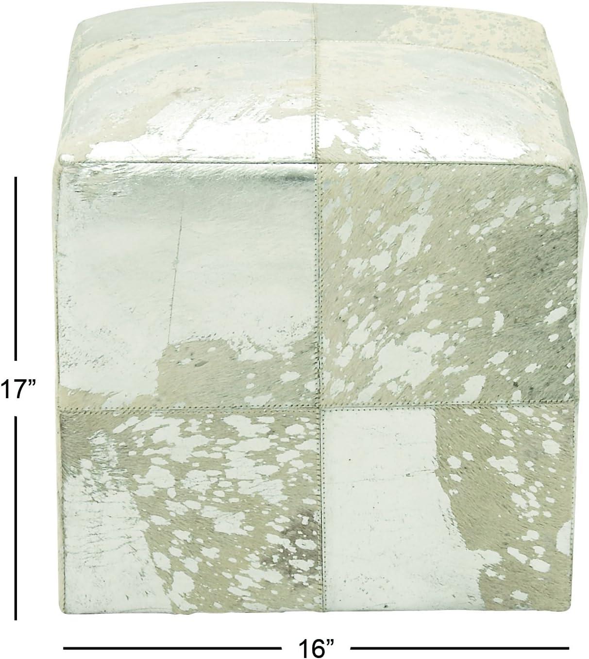 Cube leather accent stool will complement an upholstered velvet sofa with light colored pillows for a luxurious appeal. This item ships in 1 carton. Due to the handmade nature of this item, no two will be alike, there will be slight differences in shape, size, and color. Suitable for indoor use only. Leather and hair on hide are natural products, and therefore no two will be alike. There may slight variations in pattern, natural blemishes, colors, and overall aesthetic of the product. Maximum weight limit is 200 lbs. Made in India. This is a single stool. Contemporary style.
