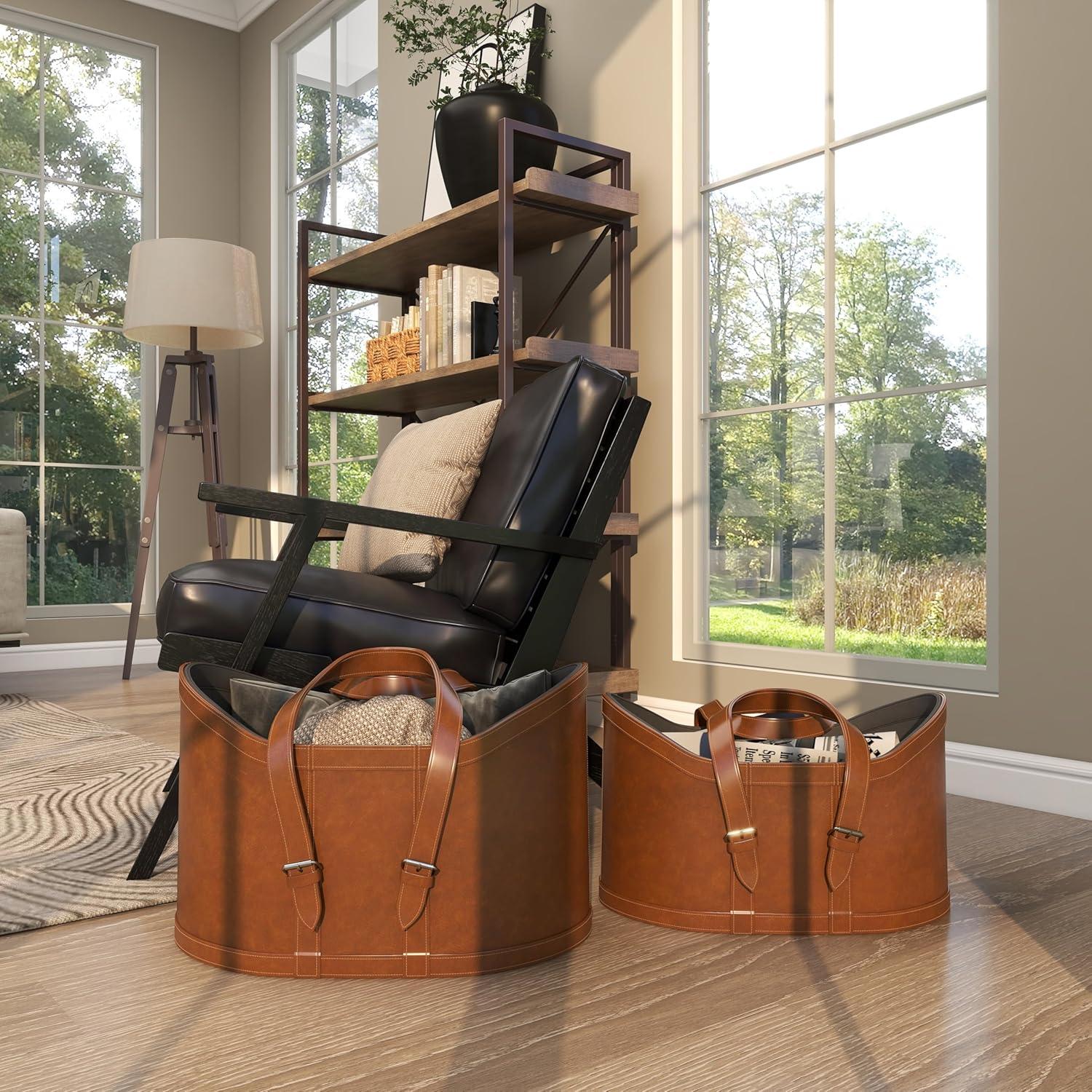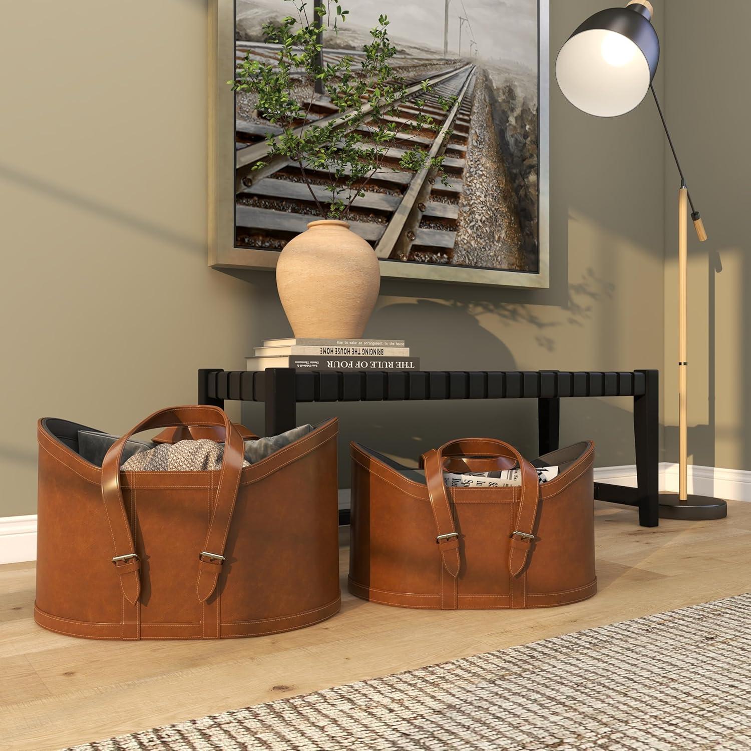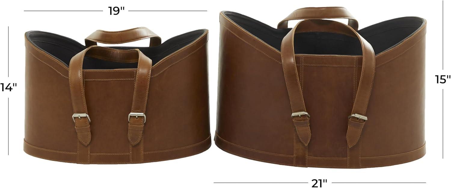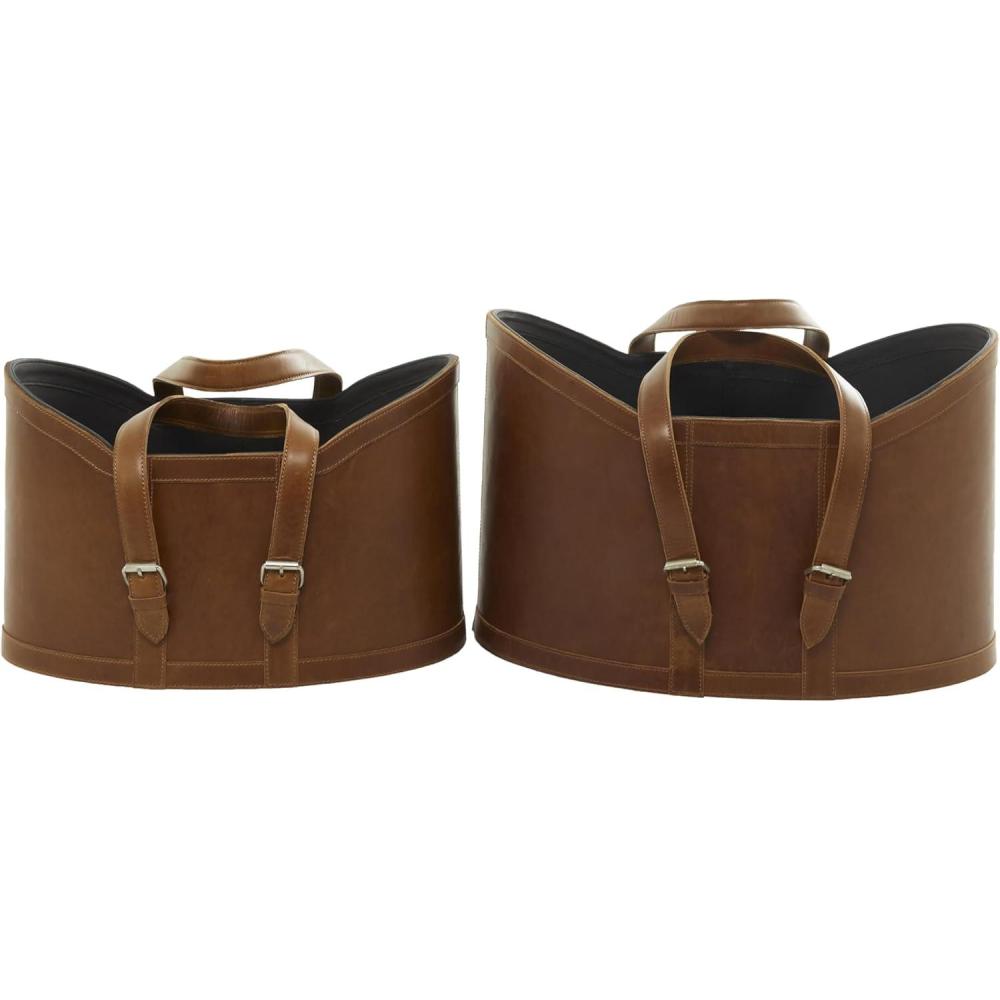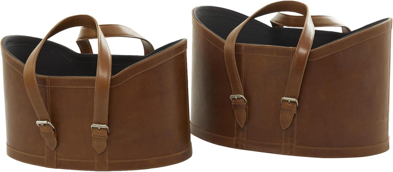 The modern set of 2 basket for decor has an MDF base covered and sewn with leather for durability. The smooth brown basket for home decor accentuates an oval form with edges that extend upward, creating a striking appearance. Wipe clean with a dry cloth. Keep your space tidy and neat with the help of these storage baskets. Place them by your bedside, laundry room or living room to keep your space free of clutter. Store your blankets and other linen in this dark blue set of 2 basket organizers for a chic display. This item ships in 1 carton. Due to the handmade nature of this item, no two will be alike, there will be slight differences in shape, size, and color. Suitable for indoor use only. This item ships fully assembled in one piece. Leather and hair on hide are natural products, and therefore no two will be alike. There may slight variations in pattern, natural blemishes, colors, and overall aesthetic of the product. Maximum weight limit is 5 lbs. Made in India. This brown colored leather magazine holder comes as a set of 2. Modern style.