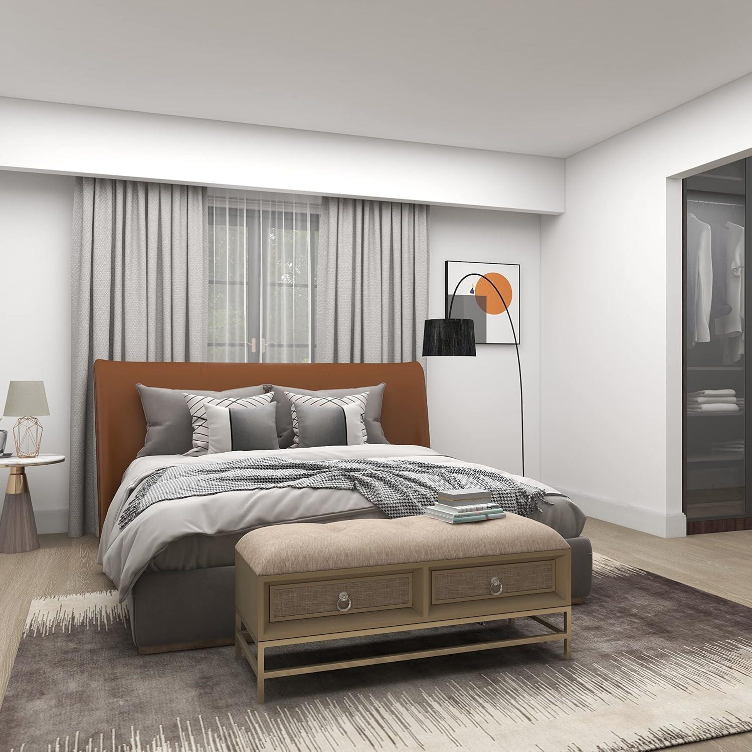 RECTANGLE ENTRYWAY STORAGE BENCH: Long rectangular bench features two pull out drawers with ring handles and tufted seat cushion for maximum comfort, and spacious under clearance for easy clean