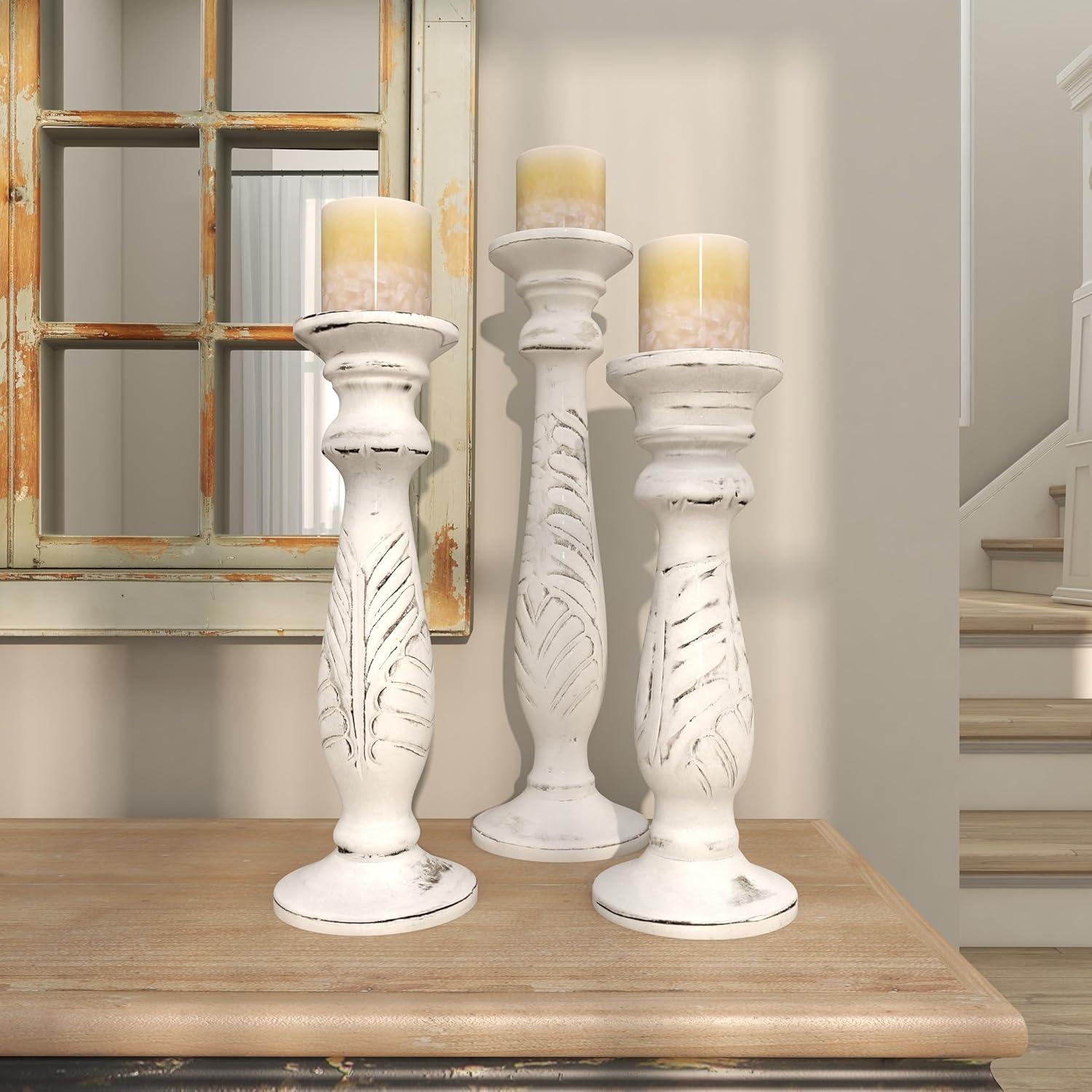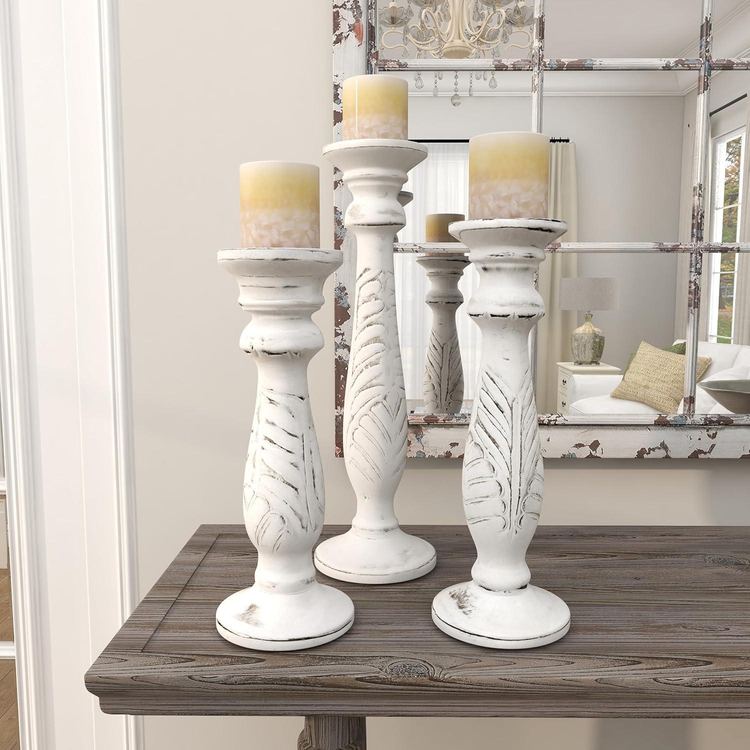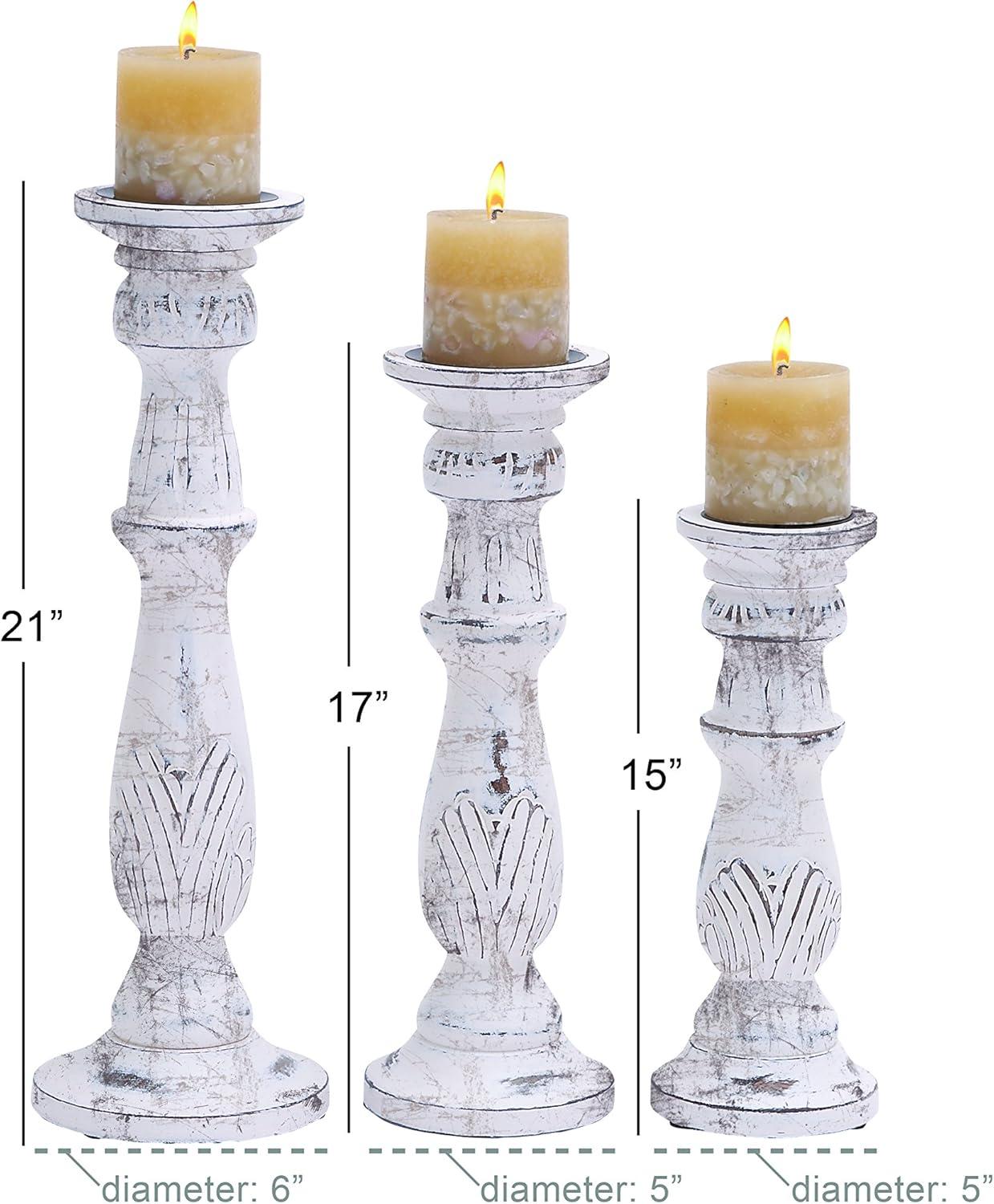 Set of three 18″, 15″ and 12″ Updated Traditional Distressed White Finish Mango Wood Carved Chevron Motif Pillar Candle Holders, tiered circular bases. This product is made in India.