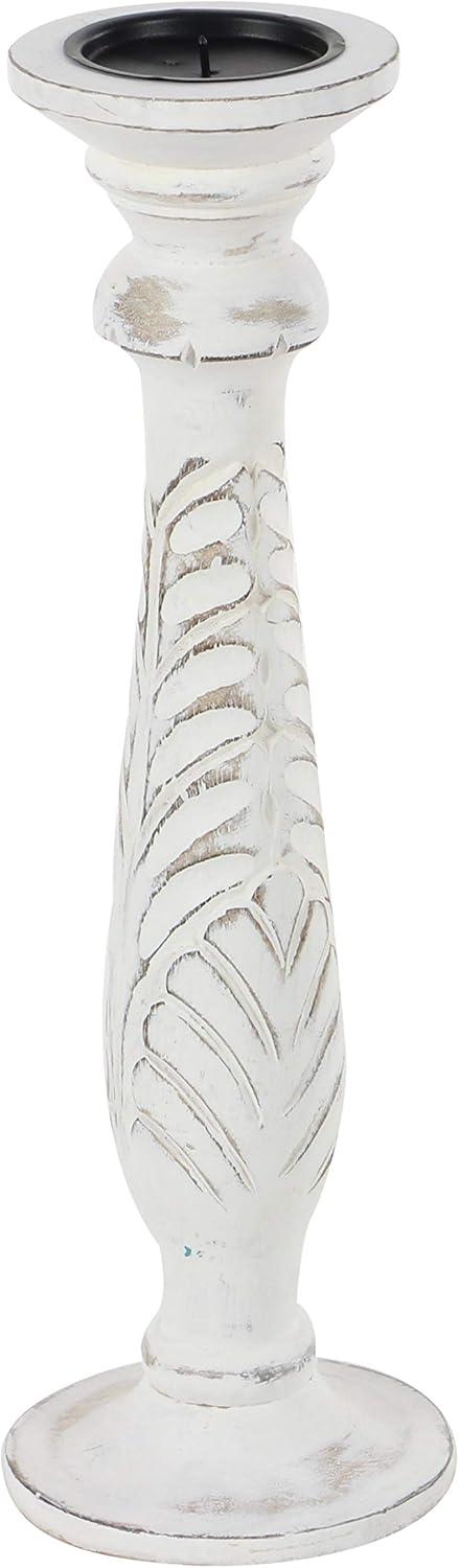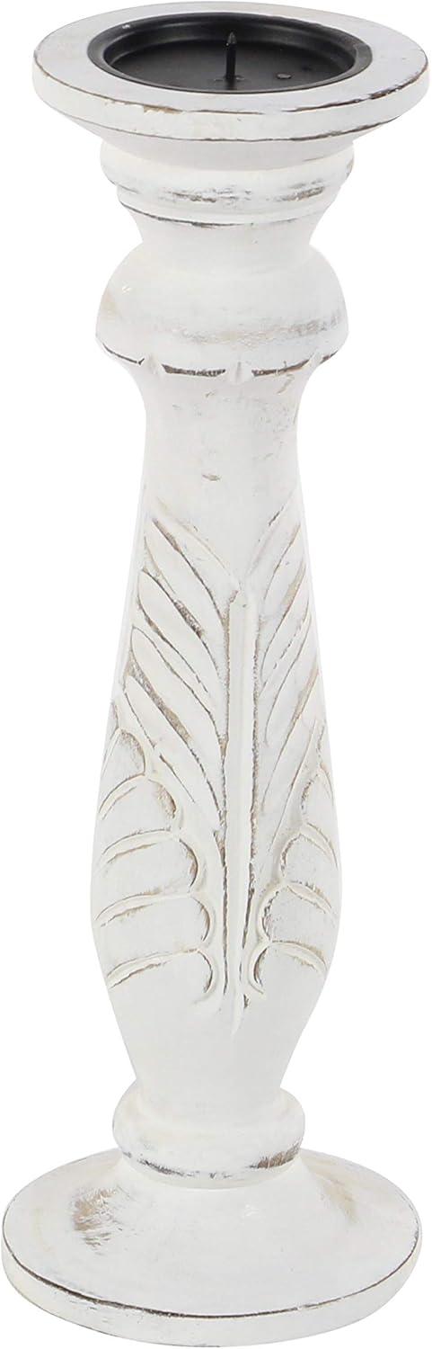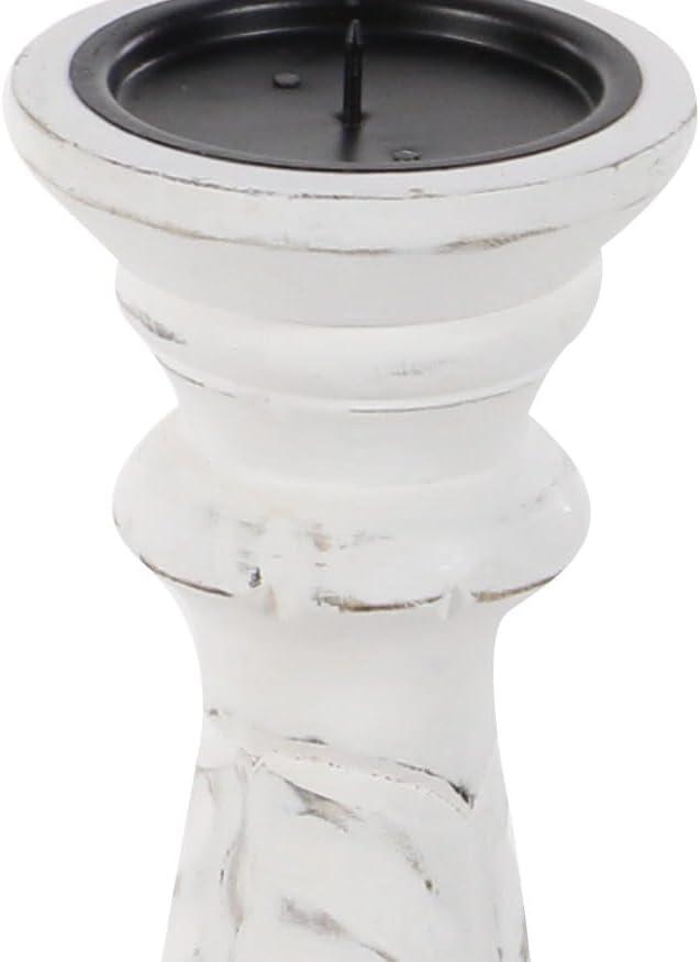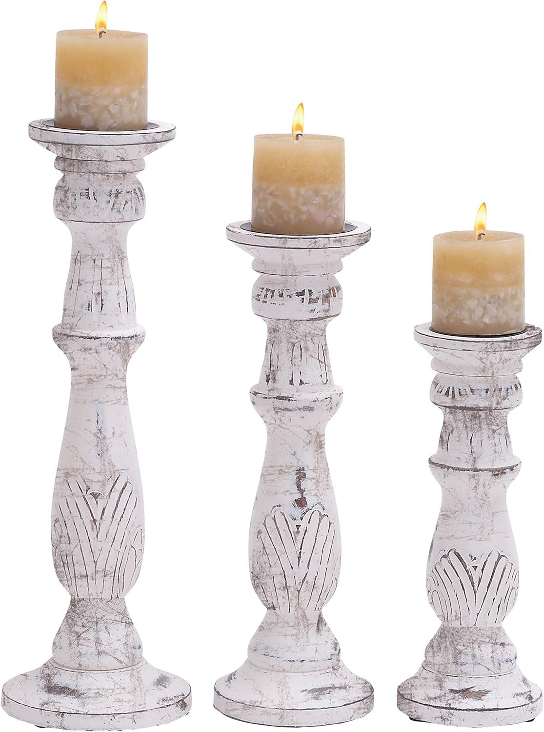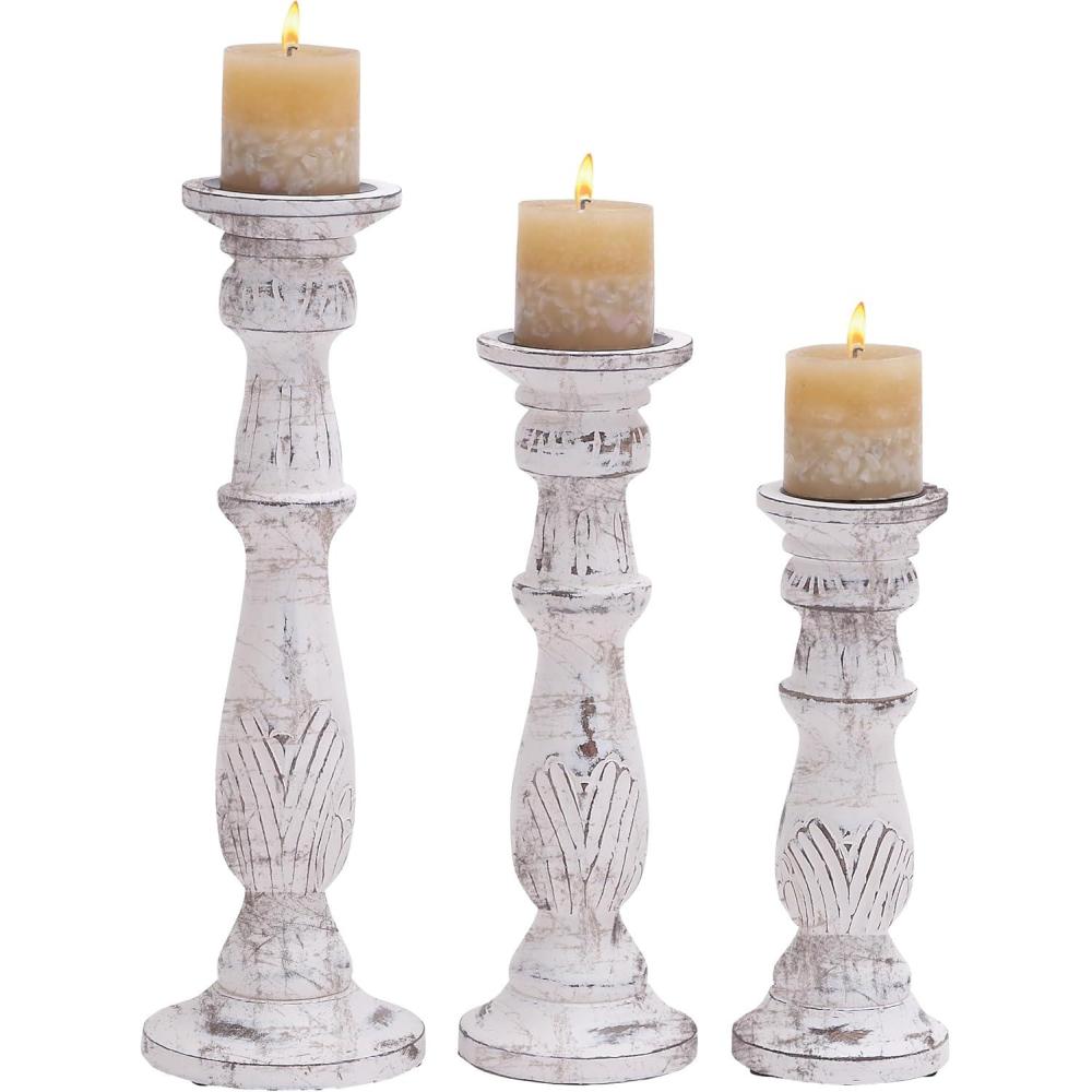 Set of three 18″, 15″ and 12″ Updated Traditional Distressed White Finish Mango Wood Carved Chevron Motif Pillar Candle Holders, tiered circular bases. This product is made in India.