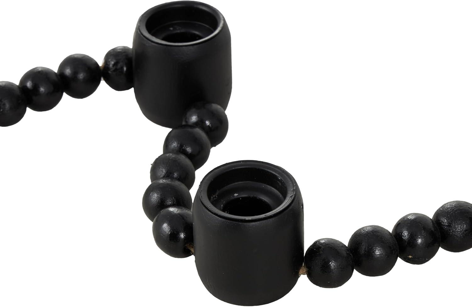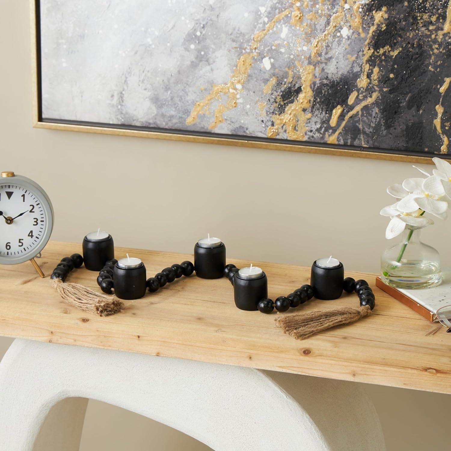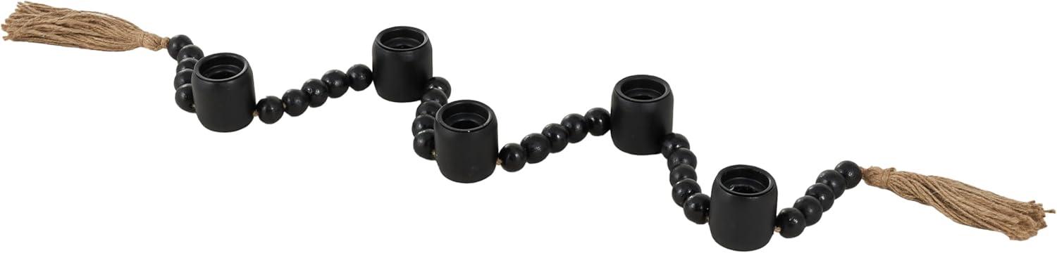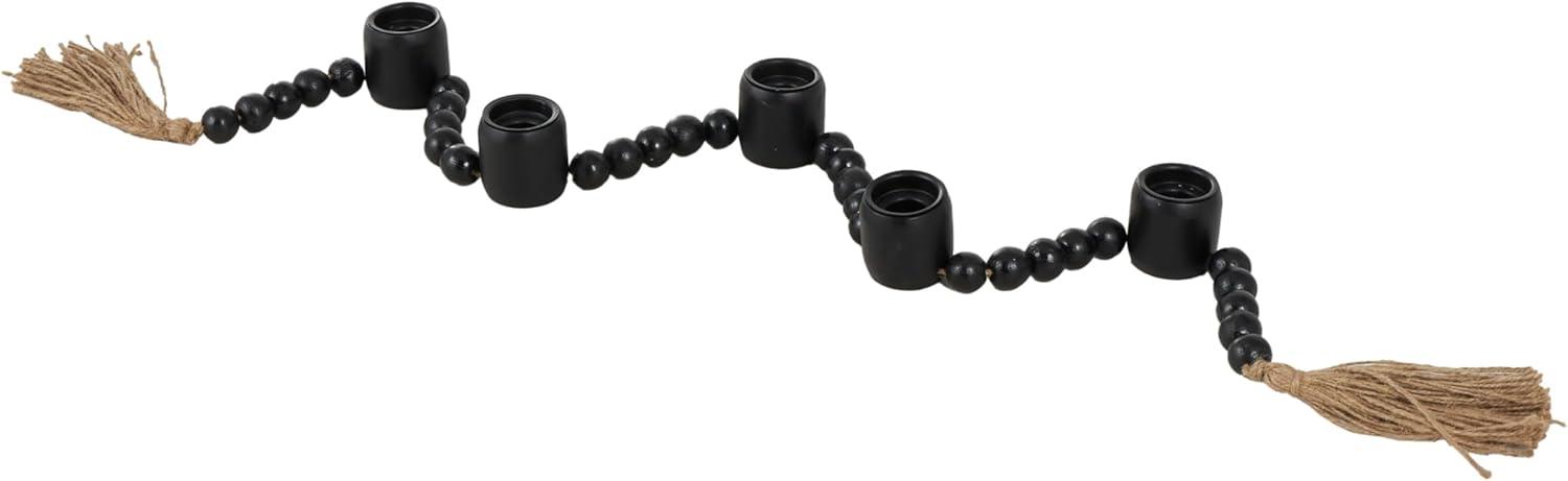 Traditional candle holder for home decor is welded from iron, adorned with intricately carved mango wooden beads, and is elegantly bound with jute rope, ensuring both durability and style. The varnished black candle holder for centerpiece boasts a classic round shape and round beads, making it a standout piece. Wipe clean with a dry cloth. Perfect for living rooms or dining areas, this black candle stand enhances any décor. Designed with felt or rubber stoppers at the base that prevent scratching furniture and table tops, as well as sliding around. Can hold 5 tealight candles, not included. This item ships in 1 carton. Mango wood candle holder makes a great gift for any occasion. Suitable for indoor use only. This item ships fully assembled in one piece. Made in India. This is a single black colored candle stand. Traditional style.