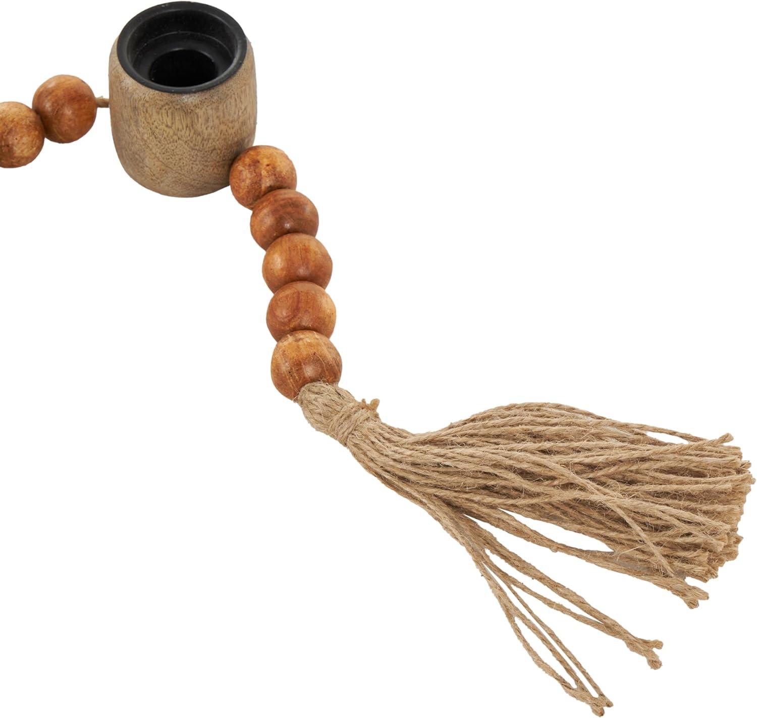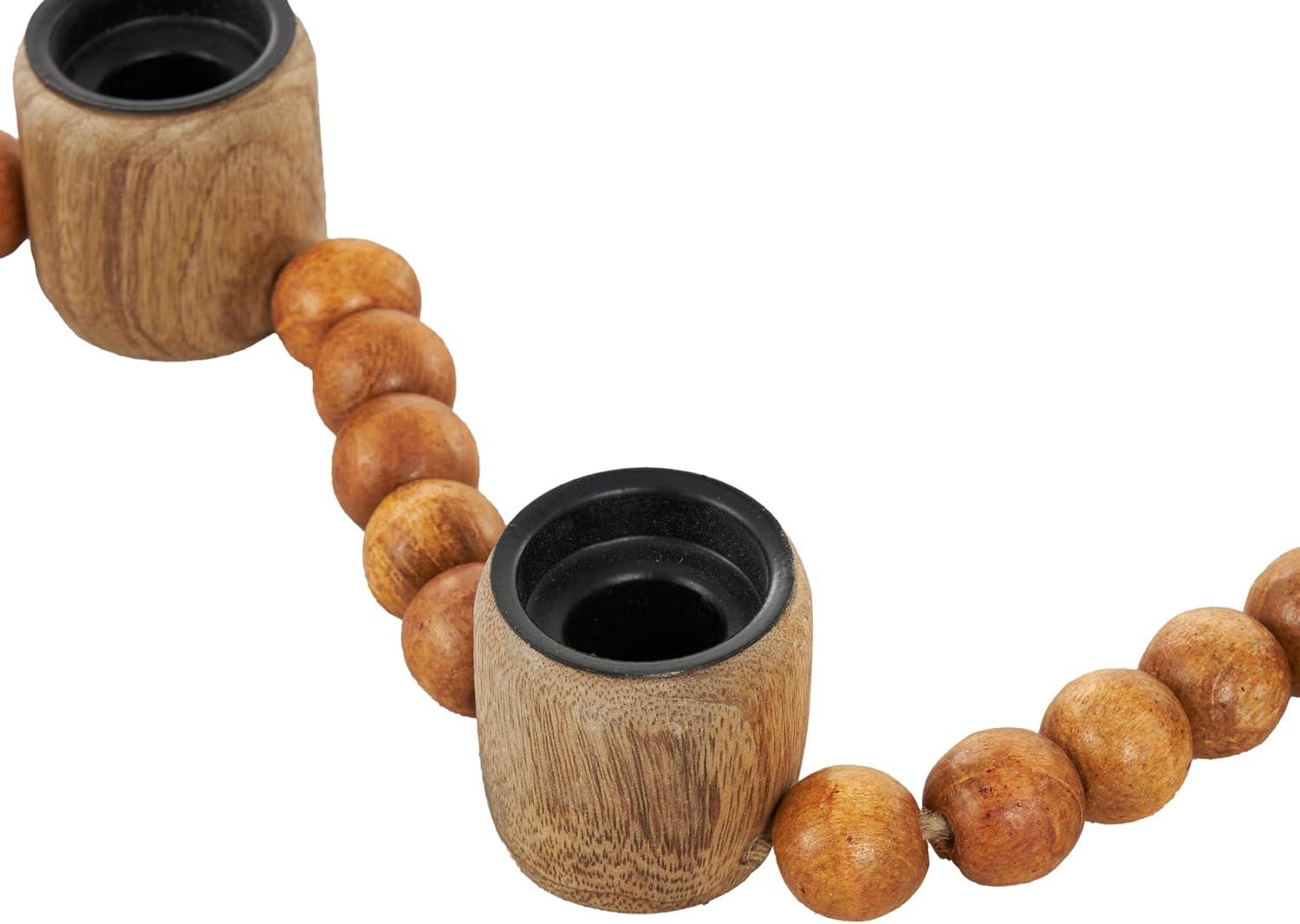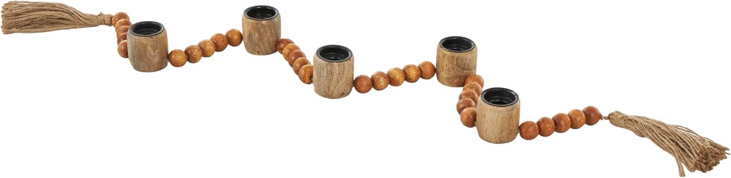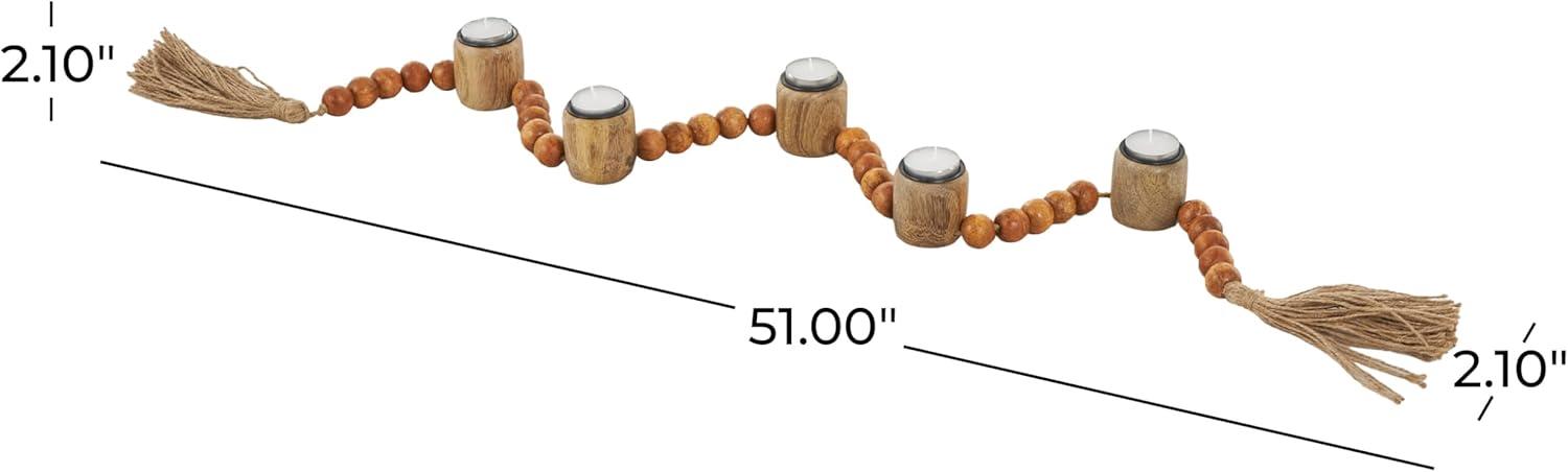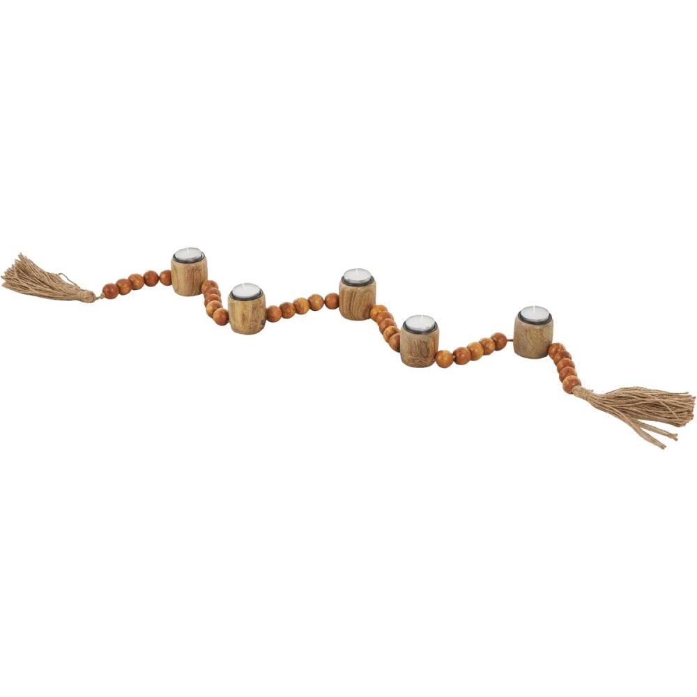 Traditional candle holder for home decor is welded from iron, adorned with intricately carved mango wooden beads, and is elegantly bound with jute rope, ensuring both durability and style. The varnished brown candle holder for centerpiece boasts a classic round shape and round beads, making it a standout piece. Wipe clean with a dry cloth. Perfect for living rooms or dining areas, this brown candle stand enhances any decor. Designed with felt or rubber stoppers at the base that prevent scratching furniture and table tops, as well as sliding around. Can hold 5 tealight candles, not included. This item ships in 1 carton. Mango wood candle holder makes a great gift for any occasion. Suitable for indoor use only. This item ships fully assembled in one piece. Made in India. This is a single brown colored candle stand. Traditional style.