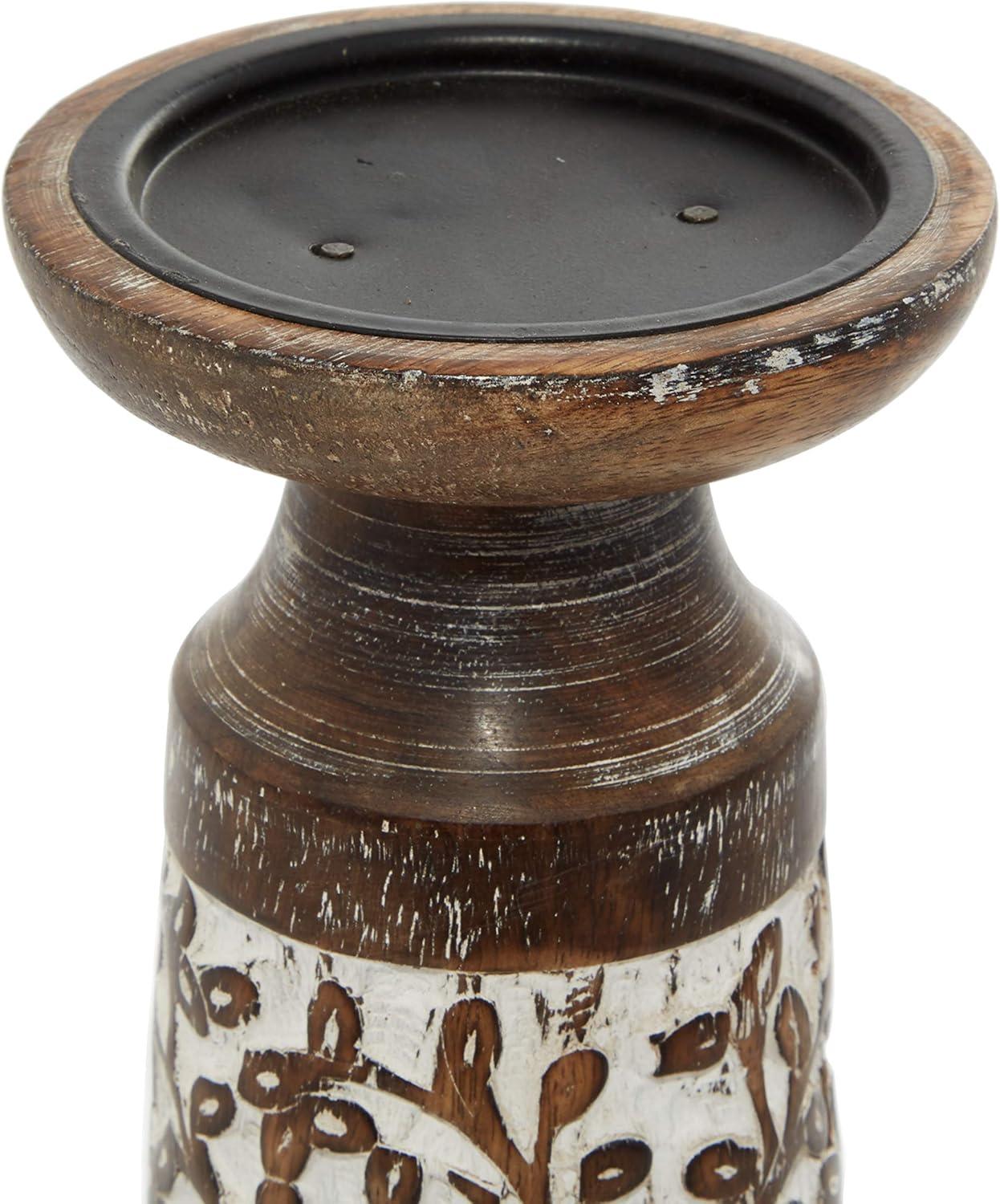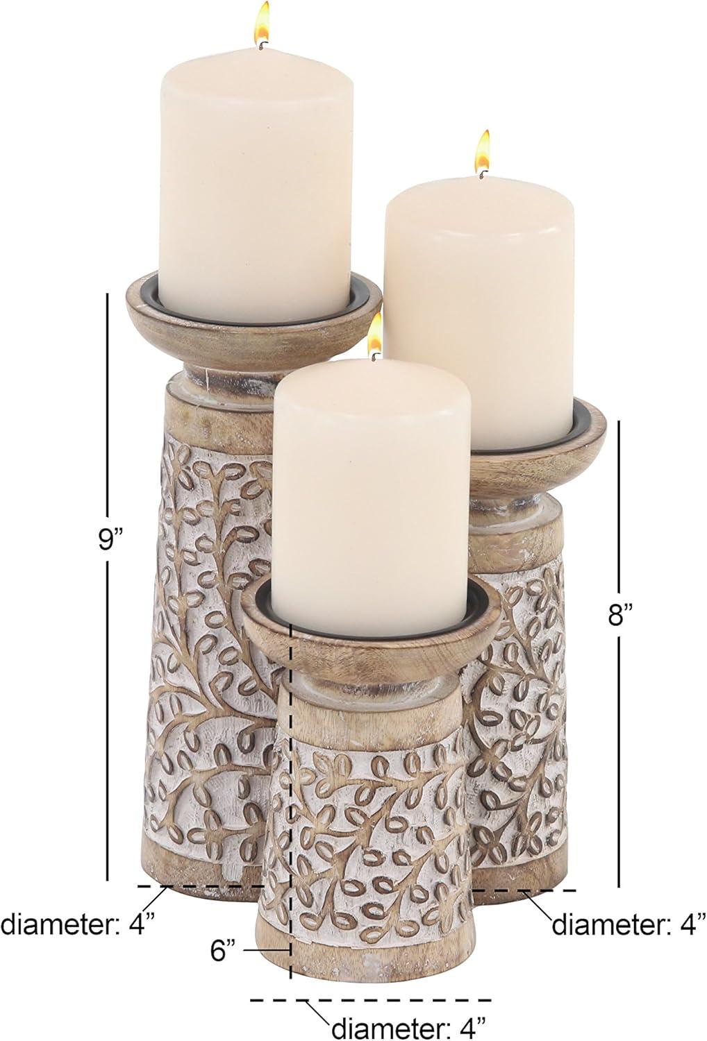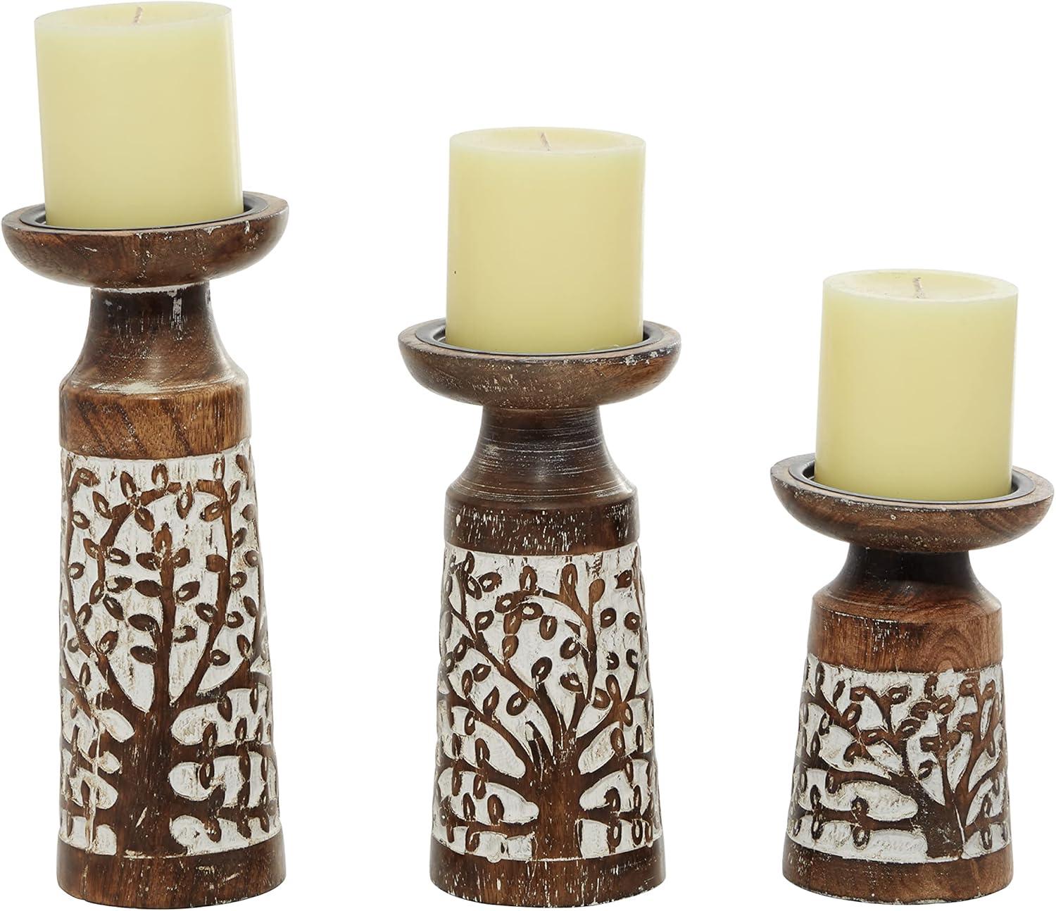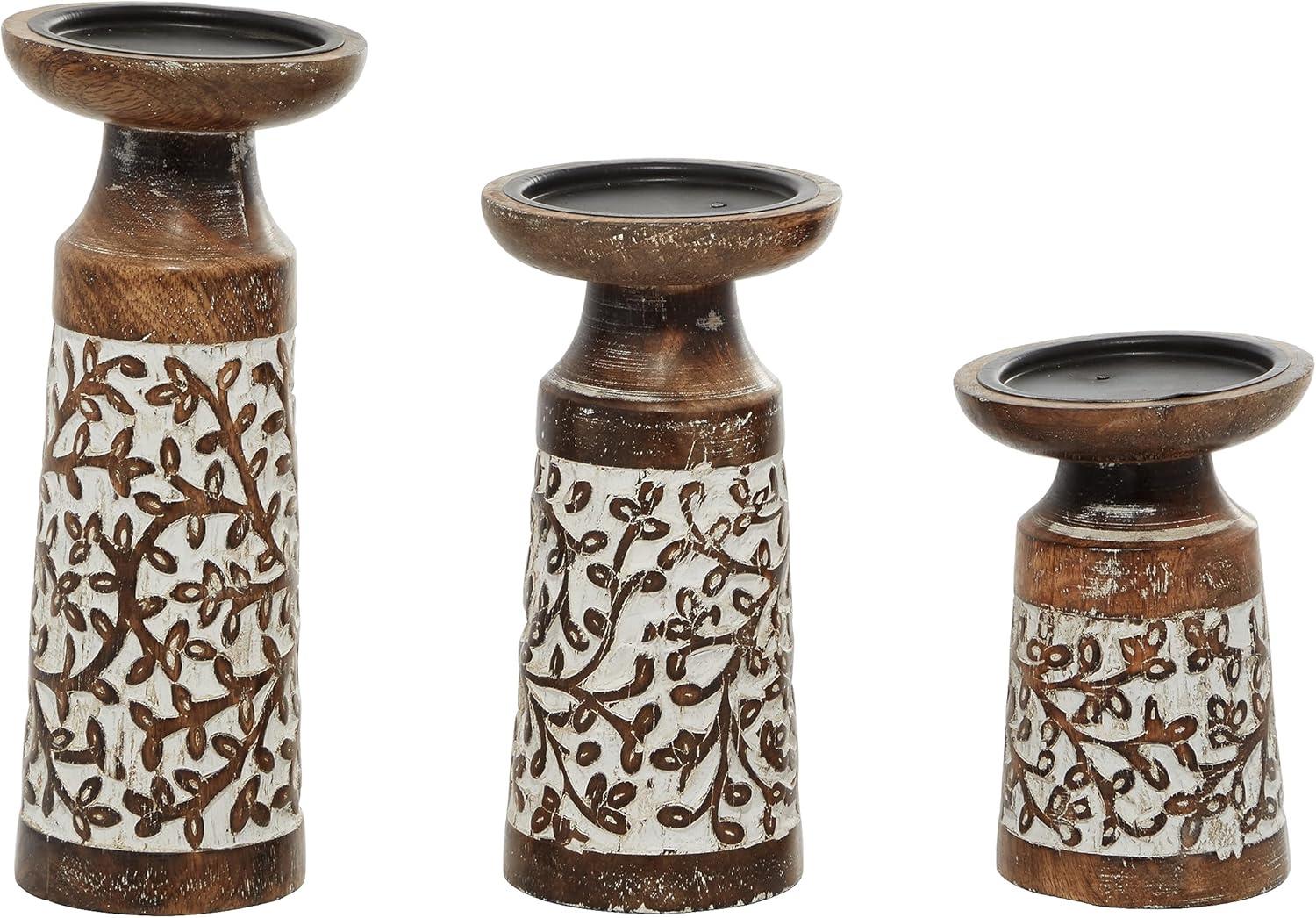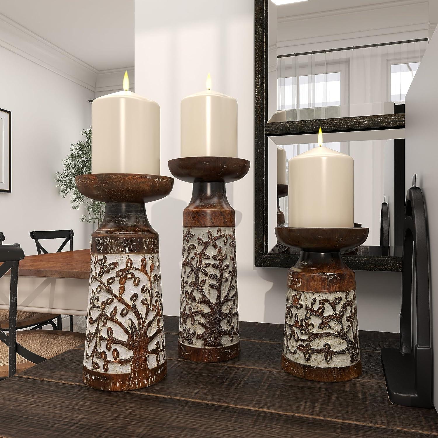 FEATURES ABSTRACT CANDLE HOLDER: This set features 3 pillar candle holders with round candle plates and tumbler-shaped bodies with carved floral details