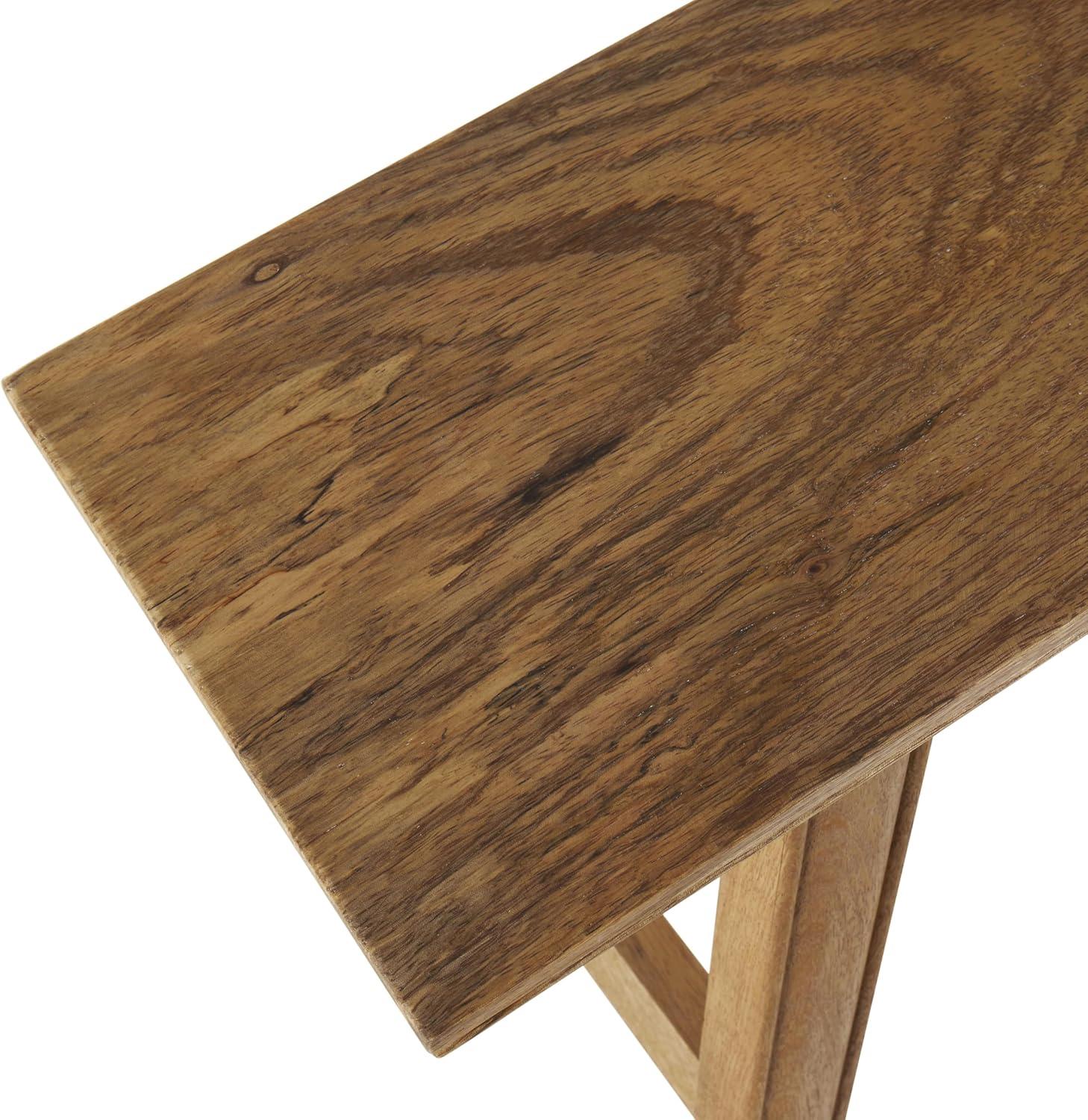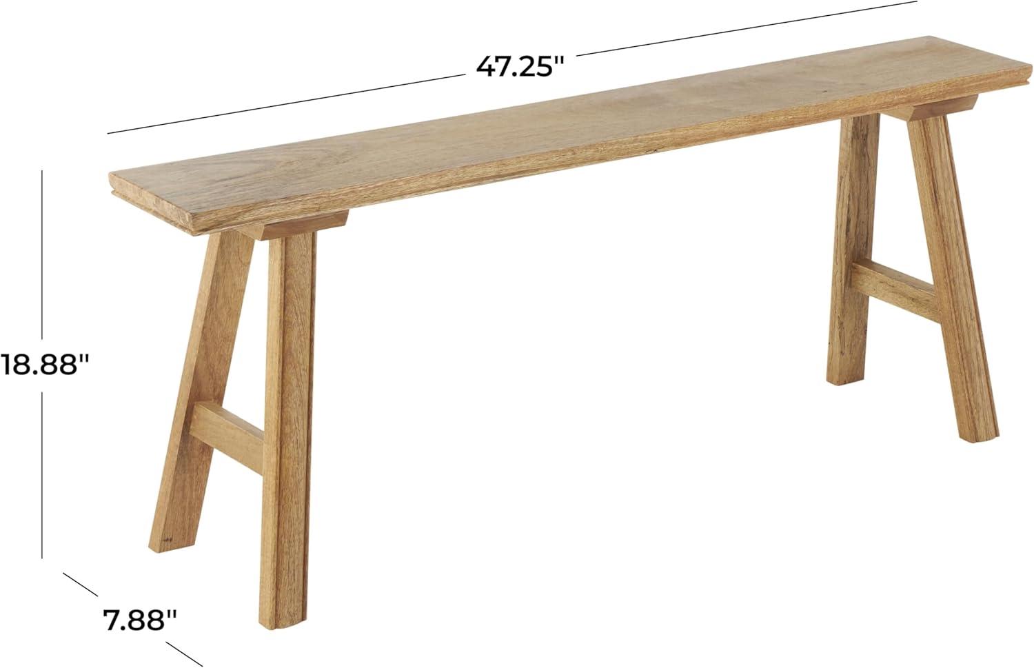 The farmhouse bench for entryway is expertly carved with mango wood and applied with a matte brown finish. This matte brown entry bench's rectangular shape makes it easy to fit into different layouts and styles, providing both function and aesthetic appeal. Wipe clean with a dry cloth. This brown entryway bench can be used in various spaces around your home, such as additional seating in the living room or at the foot of your bed. This item ships in 1 carton. Due to the handmade nature of this item, no two will be alike, there will be slight differences in shape, size, and color. Suitable for indoor use only. This item ships fully assembled in one piece. Maximum weight limit is 250 lbs. Can accommodate 2 people. This is a single brown colored entryway bench. Farmhouse style.