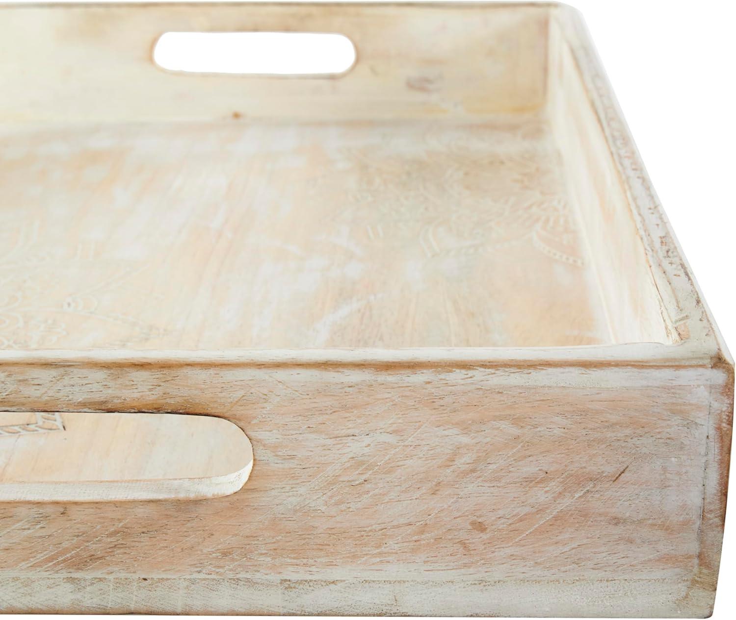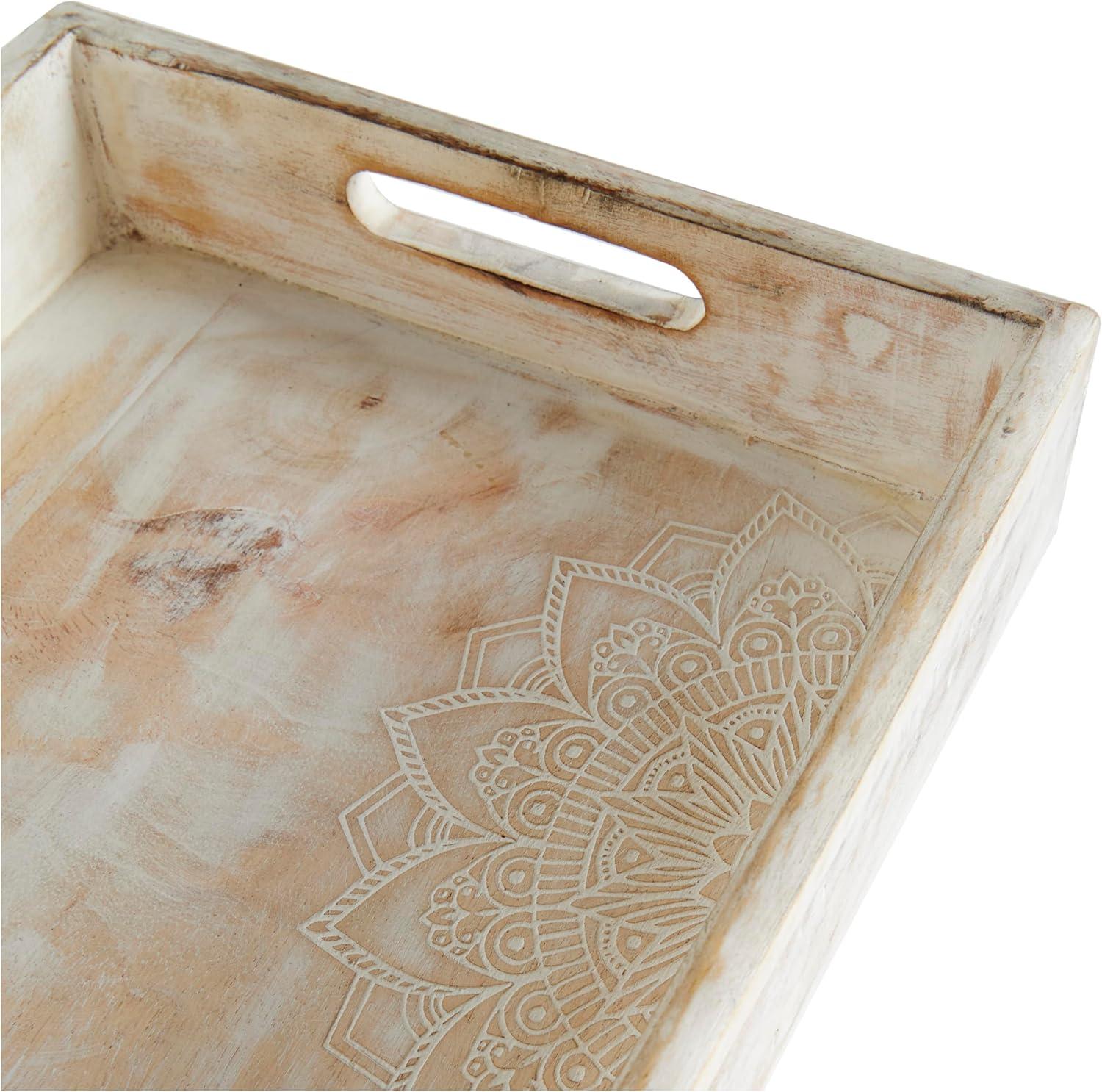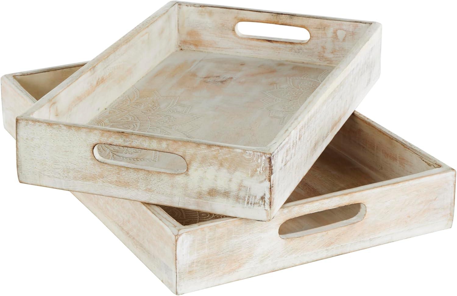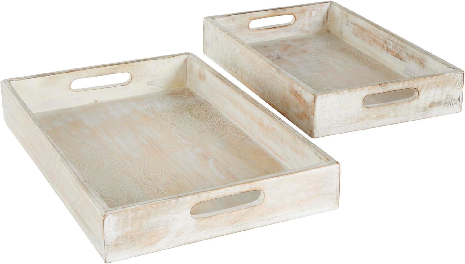 Deco 79 Mango Wood Handmade Whitewashed Tray with Carved Mandala Interior, Set of 2 18″, 16″ W, Cream(Brown)